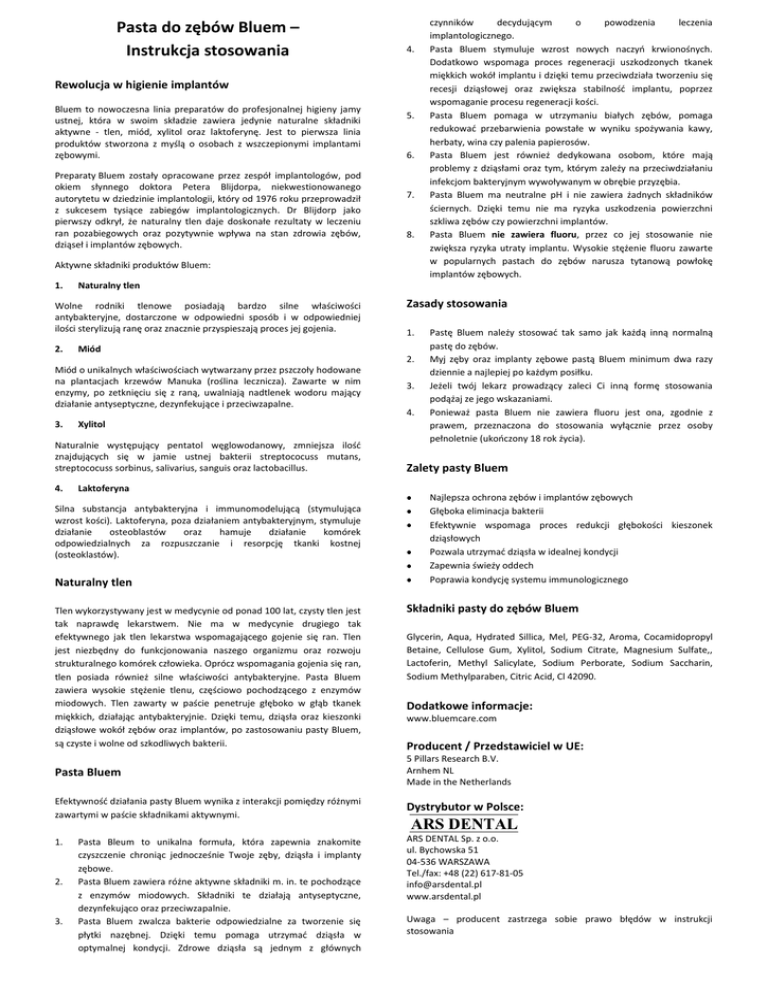 Pasta do zębów Bluem – Instrukcja stosowania 4. Rewolucja w higienie implantów Bluem to nowoczesna linia preparatów do profesjonalnej higieny jamy ustnej, która w swoim składzie zawiera jedynie naturalne składniki aktywne - tlen, miód, xylitol oraz laktoferynę. Jest to pierwsza linia produktów stworzona z myślą o osobach z wszczepionymi implantami zębowymi. Preparaty Bluem zostały opracowane przez zespół implantologów, pod okiem słynnego doktora Petera Blijdorpa, niekwestionowanego autorytetu w dziedzinie implantologii, który od 1976 roku przeprowadził z sukcesem tysiące zabiegów implantologicznych. Dr Blijdorp jako pierwszy odkrył, że naturalny tlen daje doskonałe rezultaty w leczeniu ran pozabiegowych oraz pozytywnie wpływa na stan zdrowia zębów, dziąseł i implantów zębowych. 5. 6. 7. 8. Aktywne składniki produktów Bluem: 1. Naturalny tlen Wolne rodniki tlenowe posiadają bardzo silne właściwości antybakteryjne, dostarczone w odpowiedni sposób i w odpowiedniej ilości sterylizują ranę oraz znacznie przyspieszają proces jej gojenia. 2. Zasady stosowania 1. Miód 2. Miód o unikalnych właściwościach wytwarzany przez pszczoły hodowane na plantacjach krzewów Manuka (roślina lecznicza). Zawarte w nim enzymy, po zetknięciu się z raną, uwalniają nadtlenek wodoru mający działanie antyseptyczne, dezynfekujące i przeciwzapalne. 3. Xylitol Naturalnie występujący pentatol węglowodanowy, zmniejsza ilość znajdujących się w jamie ustnej bakterii streptococuss mutans, streptococuss sorbinus, salivarius, sanguis oraz lactobacillus. 4. czynników decydującym o powodzenia leczenia implantologicznego. Pasta Bluem stymuluje wzrost nowych naczyń krwionośnych. Dodatkowo wspomaga proces regeneracji uszkodzonych tkanek miękkich wokół implantu i dzięki temu przeciwdziała tworzeniu się recesji dziąsłowej oraz zwiększa stabilność implantu, poprzez wspomaganie procesu regeneracji kości. Pasta Bluem pomaga w utrzymaniu białych zębów, pomaga redukować przebarwienia powstałe w wyniku spożywania kawy, herbaty, wina czy palenia papierosów. Pasta Bluem jest również dedykowana osobom, które mają problemy z dziąsłami oraz tym, którym zależy na przeciwdziałaniu infekcjom bakteryjnym wywoływanym w obrębie przyzębia. Pasta Bluem ma neutralne pH i nie zawiera żadnych składników ściernych. Dzięki temu nie ma ryzyka uszkodzenia powierzchni szkliwa zębów czy powierzchni implantów. Pasta Bluem nie zawiera fluoru, przez co jej stosowanie nie zwiększa ryzyka utraty implantu. Wysokie stężenie fluoru zawarte w popularnych pastach do zębów narusza tytanową powłokę implantów zębowych. Laktoferyna Silna substancja antybakteryjna i immunomodelującą (stymulująca wzrost kości). Laktoferyna, poza działaniem antybakteryjnym, stymuluje działanie osteoblastów oraz hamuje działanie komórek odpowiedzialnych za rozpuszczanie i resorpcję tkanki kostnej (osteoklastów). Naturalny tlen Tlen wykorzystywany jest w medycynie od ponad 100 lat, czysty tlen jest tak naprawdę lekarstwem. Nie ma w medycynie drugiego tak efektywnego jak tlen lekarstwa wspomagającego gojenie się ran. Tlen jest niezbędny do funkcjonowania naszego organizmu oraz rozwoju strukturalnego komórek człowieka. Oprócz wspomagania gojenia się ran, tlen posiada również silne właściwości antybakteryjne. Pasta Bluem zawiera wysokie stężenie tlenu, częściowo pochodzącego z enzymów miodowych. Tlen zawarty w paście penetruje głęboko w głąb tkanek miękkich, działając antybakteryjnie. Dzięki temu, dziąsła oraz kieszonki dziąsłowe wokół zębów oraz implantów, po zastosowaniu pasty Bluem, są czyste i wolne od szkodliwych bakterii. 3. 4. Pastę Bluem należy stosować tak samo jak każdą inną normalną pastę do zębów. Myj zęby oraz implanty zębowe pastą Bluem minimum dwa razy dziennie a najlepiej po każdym posiłku. Jeżeli twój lekarz prowadzący zaleci Ci inną formę stosowania podążaj ze jego wskazaniami. Ponieważ pasta Bluem nie zawiera fluoru jest ona, zgodnie z prawem, przeznaczona do stosowania wyłącznie przez osoby pełnoletnie (ukończony 18 rok życia). Zalety pasty Bluem Najlepsza ochrona zębów i implantów zębowych Głęboka eliminacja bakterii Efektywnie wspomaga proces redukcji głębokości kieszonek dziąsłowych Pozwala utrzymać dziąsła w idealnej kondycji Zapewnia świeży oddech Poprawia kondycję systemu immunologicznego Składniki pasty do zębów Bluem Glycerin, Aqua, Hydrated Sillica, Mel, PEG-32, Aroma, Cocamidopropyl Betaine, Cellulose Gum, Xylitol, Sodium Citrate, Magnesium Sulfate,, Lactoferin, Methyl Salicylate, Sodium Perborate, Sodium Saccharin, Sodium Methylparaben, Citric Acid, Cl 42090. Dodatkowe informacje: www.bluemcare.com Producent / Przedstawiciel w UE: Pasta Bluem 5 Pillars Research B.V. Arnhem NL Made in the Netherlands Efektywność działania pasty Bluem wynika z interakcji pomiędzy różnymi zawartymi w paście składnikami aktywnymi. Dystrybutor w Polsce: 1. ARS DENTAL Sp. z o.o. ul. Bychowska 51 04-536 WARSZAWA Tel./fax: +48 (22) 617-81-05 [email protected] www.arsdental.pl 2. 3. Pasta Bleum to unikalna formuła, która zapewnia znakomite czyszczenie chroniąc jednocześnie Twoje zęby, dziąsła i implanty zębowe. Pasta Bluem zawiera różne aktywne składniki m. in. te pochodzące z enzymów miodowych. Składniki te działają antyseptyczne, dezynfekująco oraz przeciwzapalnie. Pasta Bluem zwalcza bakterie odpowiedzialne za tworzenie się płytki nazębnej. Dzięki temu pomaga utrzymać dziąsła w optymalnej kondycji. Zdrowe dziąsła są jednym z głównych Uwaga – producent zastrzega sobie prawo błędów w instrukcji stosowania