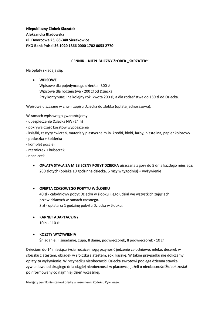 Niepubliczny Żłobek Skrzatek Aleksandra Bladowska ul. Dworcowa 23, 83-340 Sierakowice PKO Bank Polski 36 1020 1866 0000 1702 0053 2770 CENNIK – NIEPUBLICZNY ŻŁOBEK ,,SKRZATEK’’ Na opłaty składają się: WPISOWE Wpisowe dla pojedynczego dziecka - 300 zł Wpisowe dla rodzeostwa - 200 zł od Dziecka Przy kontynuacji na kolejny rok, kwota 200 zł, a dla rodzeostwa do 150 zł od Dziecka. Wpisowe uiszczane w chwili zapisu Dziecka do żłobka (opłata jednorazowa). W ramach wpisowego gwarantujemy: - ubezpieczenie Dziecka NW (24 h) - pokrywa częśd kosztów wyposażenia - książki, zeszyty dwiczeo, materiały plastyczne m.in. kredki, bloki, farby, plastelina, papier kolorowy - poduszka + kołderka - komplet pościeli - ręczniczek + kubeczek - nocniczek OPŁATA STAŁA ZA MIESIĘCZNY POBYT DZIECKA uiszczana z góry do 5 dnia każdego miesiąca: 280 złotych (opieka 10 godzinna dziecka, 5 razy w tygodniu) + wyżywienie OFERTA CZASOWEGO POBYTU W ŻŁOBKU 40 zł - całodniowy pobyt Dziecka w żłobku i jego udział we wszystkich zajęciach przewidzianych w ramach czesnego. 8 zł - opłata za 1 godzinę pobytu Dziecka w żłobku. KARNET ADAPTACYJNY 10 h - 110 zł KOSZTY WYŻYWIENIA Śniadanie, II śniadanie, zupa, II danie, podwieczorek, II podwieczorek - 10 zł Dzieciom do 14 miesiąca życia rodzice mogą przynosid jedzenie całodniowe: mleko, deserek w słoiczku z atestem, obiadek w słoiczku z atestem, sok, kaszkę. W takim przypadku nie doliczamy opłaty za wyżywienie. W przypadku nieobecności Dziecka zwrotowi podlega dzienna stawka żywieniowa od drugiego dnia ciągłej nieobecności w placówce, jeżeli o nieobecności Żłobek został poinformowany co najmniej dzieo wcześniej. Niniejszy cennik nie stanowi oferty w rozumieniu Kodeksu Cywilnego.