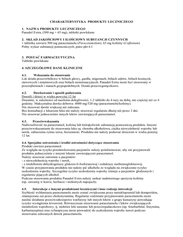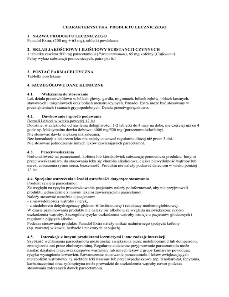 CHARAKTERYSTYKA PRODUKTU LECZNICZEGO 1. NAZWA PRODUKTU LECZNICZEGO Panadol Extra, (500 mg + 65 mg), tabletki powlekane 2. SKŁAD JAKOŚCIOWY I ILOŚCIOWY SUBSTANCJI CZYNNYCH 1 tabletka zawiera 500 mg paracetamolu (Paracetamolum), 65 mg kofeiny (Coffeinum) Pełny wykaz substancji pomocniczych, patrz pkt 6.1 3. POSTAĆ FARMACEUTYCZNA Tabletki powlekane 4. SZCZEGÓŁOWE DANE KLINICZNE 4.1. Wskazania do stosowanie Lek działa przeciwbólowo w bólach głowy, gardła, migrenach, bólach zębów, bólach kostnych, stawowych i mięśniowych oraz bólach menstruacyjnych. Panadol Extra może być stosowany w przeziębieniach i stanach grypopodobnych. Działa przeciwgorączkowo. 4.2. Dawkowanie i sposób podawania Dorośli i dzieci w wieku powyżej 12 lat Doustnie, w zależności od nasilenia dolegliwości, 1-2 tabletki do 4 razy na dobę, nie częściej niż co 4 godziny. Maksymalna dawka dobowa: 4000 mg/520 mg (paracetamolu/kofeiny). Nie stosować dawki większej niż zalecana. Bez konsultacji z lekarzem leku nie należy stosować regularnie dłużej niż przez 3 dni. Nie stosować jednocześnie innych leków zawierających paracetamol. 4.3. Przeciwwskazania Nadwrażliwość na paracetamol, kofeinę lub którąkolwiek substancję pomocniczą produktu. Innymi przeciwwskazaniami do stosowania leku są: choroba alkoholowa, ciężka niewydolność wątroby lub nerek, zaburzenia rytmu serca, bezsenność. Produktu nie należy podawać dzieciom w wieku poniżej 12 lat. 4.4. Specjalne ostrzeżenia i środki ostrożności dotyczące stosowania Produkt zawiera paracetamol. Ze względu na ryzyko przedawkowania pacjentów należy poinformować, aby nie przyjmowali produktu jednocześnie z innymi lekami zawierającymi paracetamol. Należy stosować ostrożnie u pacjentów: - z niewydolnością wątroby i nerek, - z niedoborem dehydrogenazy glukozo-6-fosforanowej i reduktazy methemoglobinowej. W czasie przyjmowania produktu nie należy pić alkoholu ze względu na zwiększone ryzyko uszkodzenia wątroby. Szczególne ryzyko uszkodzenia wątroby istnieje u pacjentów głodzonych i regularnie pijących alkohol. Podczas stosowania produktu Panadol Extra należy unikać nadmiernego spożycia kofeiny (np. zawartej w kawie, herbacie i niektórych napojach). 4.5. Interakcje z innymi produktami leczniczymi i inne rodzaje interakcji Szybkość wchłaniania paracetamolu może zostać zwiększona przez metoklopramid lub domperidon, zmniejszona zaś przez cholestyraminę. Regularne codzienne przyjmowanie paracetamolu może nasilać działanie przeciwzakrzepowe warfaryny lub innych leków z grupy kumaryny powodując ryzyko wystąpienia krwawień. Równoczesne stosowanie paracetamolu i leków zwiększających metabolizm wątrobowy, tj. niektóre leki nasenne lub przeciwpadaczkowe (np. fenobarbital, fenytoina, karbamazepina) oraz ryfampicyna może prowadzić do uszkodzenia wątroby nawet podczas stosowania zalecanych dawek paracetamolu. Paracetamol stosowany jednocześnie z inhibitorami MAO może wywołać stan pobudzenia i wysoką temperaturę. Salicylamid wydłuża czas wydalania paracetamolu. Stosowanie paracetamolu może być przyczyną fałszywych wyników niektórych badań laboratoryjnych (np. oznaczanie stężenia glukozy we krwi). Łączne podawanie paracetamolu i niesteroidowych leków przeciwzapalnych zwiększa ryzyko wystąpienia zaburzeń czynności nerek. Disulfiram może zmniejszać klirens kofeiny. Kofeina może zwiększać klirens litu. Estrogeny i progesteron mogą zmniejszać klirens kofeiny. 4.6. Wpływ na płodność, ciążę i laktację Badania epidemiologiczne przeprowadzone wśród kobiet w ciąży nie wykazały szkodliwego działania paracetamolu podawanego w zalecanych dawkach. Leki zawierające paracetamol i kofeinę nie powinny być stosowane podczas ciąży ze względu na możliwe zwiększenie ryzyka wystąpienia samoistnego poronienia związanego ze spożyciem kofeiny. Paracetamol i kofeina przenikają do mleka matki. Badania przeprowadzone wśród kobiet karmiących nie wykazały szkodliwego działania paracetamolu przyjmowanego w zalecanych dawkach, na karmione niemowlę. Kofeina znajdująca się w mleku matki może potencjalnie mieć pobudzający wpływ na dziecko karmione piersią, nie obserwowano jednak znaczącego toksycznego oddziaływania. Tak jak inne leki, produkt powinien być stosowany w okresie karmienia piersią w razie zdecydowanej konieczności. 4.7. Wpływ na zdolność do prowadzenia pojazdów i obsługiwania maszyn Panadol Extra nie wpływa na zdolność prowadzenia pojazdów i obsługiwania maszyn. 4.8. Działania niepożądane Działania niepożądane po podaniu paracetamolu występują bardzo rzadko (<1/10 000). W przypadku kofeiny, częstość występowania działań niepożądanych jest nieznana (częstość nie może być określona na podstawie dostępnych danych). Narząd/układ Paracetamol Zaburzenia krwi i układu chłonnego Zaburzenia układu immunologicznego Zaburzenia układu oddechowego, klatki piersiowej i śródpiersia Zaburzenia wątroby i dróg żółciowych Kofeina Zaburzenia ośrodkowego układu nerwowego Działanie niepożądane Częstość występowania Trombocytopenia Bardzo rzadko Reakcje anafilaktyczne Reakcje nadwrażliwości skórnej włącznie z wysypką skórną, obrzękiem naczynioruchowym i zespołem Stevens-Johnsona (pęcherzowy rumień wielopostaciowy) Skurcz oskrzeli u pacjentów z nadwrażliwością na kwas acetylosalicylowy i inne niesteroidowe leki przeciwzapalne Zaburzenia czynności wątroby Bardzo rzadko Bardzo rzadko Nerwowość Zawroty głowy Nieznana Nieznana Bardzo rzadko W przypadku, gdy produkt zawierający paracetamol i kofeinę będzie podawany w zalecanym dawkowaniu w połączeniu z kofeiną zawartą w pożywieniu, możliwe jest nasilenie objawów niepożądanych związanych ze wzrostem całkowitej dawki kofeiny, takich jak: bezsenność, niepokój ruchowy, lęk, rozdrażnienie, bóle głowy, zaburzenia żołądkowo-jelitowe, 