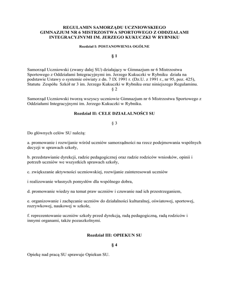 REGULAMIN SAMORZĄDU UCZNIOWSKIEGO GIMNAZJUM NR 6 MISTRZOSTWA SPORTOWEGO Z ODDZIAŁAMI INTEGRACYJNYMI IM. JERZEGO KUKUCZKI W RYBNIKU Rozdział I: POSTANOWIENIA OGÓLNE §1 Samorząd Uczniowski (zwany dalej SU) działający w Gimnazjum nr 6 Mistrzostwa Sportowego z Oddziałami Integracyjnymi im. Jerzego Kukuczki w Rybniku działa na podstawie Ustawy o systemie oświaty z dn. 7 IX 1991 r. (Dz.U. z 1991 r., nr 95, poz. 425), Statutu Zespółu Szkół nr 3 im. Jerzego Kukuczki w Rybniku oraz niniejszego Regulaminu. §2 Samorząd Uczniowski tworzą wszyscy uczniowie Gimnazjum nr 6 Mistrzostwa Sportowego z Oddziałami Integracyjnymi im. Jerzego Kukuczki w Rybniku. Rozdział II: CELE DZIAŁALNOŚCI SU §3 Do głównych celów SU należą: a. promowanie i rozwijanie wśród uczniów samorządności na rzecz podejmowania wspólnych decyzji w sprawach szkoły, b. przedstawianie dyrekcji, radzie pedagogicznej oraz radzie rodziców wniosków, opinii i potrzeb uczniów we wszystkich sprawach szkoły, c. zwiększanie aktywności uczniowskiej, rozwijanie zainteresowań uczniów i realizowanie własnych pomysłów dla wspólnego dobra, d. promowanie wiedzy na temat praw uczniów i czuwanie nad ich przestrzeganiem, e. organizowanie i zachęcanie uczniów do działalności kulturalnej, oświatowej, sportowej, rozrywkowej, naukowej w szkole, f. reprezentowanie uczniów szkoły przed dyrekcją, radą pedagogiczną, radą rodziców i innymi organami, także pozaszkolnymi. Rozdział III: OPIEKUN SU §4 Opiekę nad pracą SU sprawuje Opiekun SU. §5 WYBORY OPIEKUNA SU 1. Kadencja opiekuna SU trwa jeden rok. 2.Opiekun SU jest wybierany z pośród całego Grona Pedagogicznego przez wszystkich uczniów gimnazjum w dniu wyborów do Rady SU do 30 września. 3. Wybory Opiekuna SU są równe, tajne, bezpośrednie, powszechne. 4. Prawo kandydowania przysługuje wszystkim nauczycielom. 5. Szkolna Komisja Wyborcza powołana przez wicedyrektora przeprowadza wybory na Opiekuna SU. 6.Opiekunem SU zostaje Nauczyciel, który uzyska największą liczbę głosów. §6 ZADANIA OPIEKUNA SU a. wspieranie SU we wszystkich jego działaniach, b. inspirowanie uczniów do podejmowania ciekawych inicjatyw, c. pośredniczenie, wspieranie i ułatwianie komunikacji pomiędzy SU a dyrekcją oraz radą pedagogiczną. Rozdział IV: ORGANY SU - KOMPETENCJE, ZADANIA, STRUKTURA. §7 Do wybieralnych organów SU należą: 1. Trójki Klasowe, które tworzą uczniowie wybrani w swoich klasach – po trzech z każdej klasy. 2. Rada Samorządu Uczniowskiego. Ich kadencja trwa jeden rok. §8 Obowiązki Trójek klasowych: 1. Trójki Klasowe tworzą Radę Trójek Klasowych oraz: a. identyfikują potrzeby uczniów, b. inspirują i zachęcają uczniów do działalności kulturalnej, oświatowej, sportowej, rozrywkowej, naukowej w szkole, c. informują uczniów o działalności Rady SU. d. uczestniczą w pracach Rady Trójek Klasowych i realizacja celów SU, e. stosują się do wytycznych Rady SU lub dyrekcji, f. włączają uczniów w ogólnoszkolne działania Rady SU. §9 Obrady Rady Trójek Klasowych zwoływane są przez Przewodniczącego Rady SU lub na żądanie co najmniej połowy członków Rady Trójek Klasowych przynajmniej raz na kwartał. § 10 Do zadań Rady SU należy: a. koordynowanie, inicjowanie i organizowanie działań uczniowskich, b. opracowanie rocznego planu działania SU, c. identyfikacja potrzeb uczniów i odpowiadanie na te potrzeby, d. przedstawianie dyrekcji, radzie pedagogicznej, radzie rodziców wniosków, opinii, sugestii członków SU, e. zbieranie i archiwizowanie [w teczce/segregatorze] bieżącej dokumentacji SU. Obrady Rady SU zwoływane są przez Przewodniczącego Rady SU lub na żądanie co najmniej połowy członków Rady SU lub Opiekuna SU przynajmniej raz w miesiącu. § 11 Do obowiązków członków Rady SU należy: a. uczestnictwo w pracach Rady SU i realizacja celów SU, b. stosowanie się w swojej działalności do wytycznych dyrekcji, c. uwzględnianie w swojej działalności potrzeb uczniów, d. troska o wysoki poziom organizacyjny i dobrą atmosferę podczas pracy SU, e. włączanie uczniów w ogólnoszkolne działania Zarządu SU. § 12 W skład Rady Samorządu Uczniowskiego wchodzą: 1. Przewodniczący 2.Wiceprzewodniczący 3. Sekretarz 4. Skarbnik 5.Członek stały § 13 Zadania Rady SU: a. przewodniczący – kieruje pracą Rady Samorządu, współpracuje z opiekunem SU, dyrekcją szkoły, Radą Rodziców, zwołuje i prowadzi spotkania Rady Trójek Klasowych, przygotowuje sprawozdania końcowe z działalności SU b. wiceprzewodniczący– współpracuje z przewodniczącym i Radą Trójek Klasowych, nadzoruje losowanie „niepytanego numerka” oraz „dnia bez stresu”, pełni obowiązki przewodniczącego w razie jego nieobecności c. sekretarz – jest odpowiedzialny za protokołowanie zebrań oraz dokumentację SU. d. skarbnik - jest odpowiedzialny za środki finansowe, corocznie przedstawia sprawozdanie finansowe dyrekcji, Radzie SU oraz Radzie Trójek Klasowych. e. członek – jest odpowiedzialny za przygotowanie dekoracji, za gazetkę SU, za przygotowanie relacji z imprez szkolnych . § 14 1. Wybieralne organy SU podejmują decyzje większością głosów w obecności co najmniej połowy członków. 2. Decyzje Rady Trójek Klasowych oraz Rady SU mogą być uchylone przez dyrekcję szkoły gdy są sprzeczne z prawem lub statutem szkoły. Rozdział V: ORDYNACJA WYBORCZA § 15 Organy wybieralne SU: Rada SU, Przedstawiciele Trójek Klasowych wybierani są co roku we wrześniu. Wybory do organów SU są równe, tajne, powszechne, bezpośrednie i większościowe. § 16 Prawo głosowania (czynne prawo wyborcze) posiada każdy uczeń szkoły. § 17 Prawo kandydowania (bierne prawo wyborcze) na: a. stałego członka Rady SU – posiada każdy uczeń szkoły, b. Przedstawiciela Trójek Klasowych – posiada każdy uczeń danej klasy, § 18 Wybory Przedstawicieli Trójek Klasowych odbywają się najpóźniej na