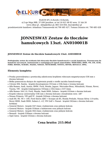 ELKUR SP J A.Kuryło i K.Kuryło, ul.3-go Maja 98B, 37-500 Jarosław, nr tel 16 621 68 82 wew. 21 lub 26 www.elkur.pl , [email protected], 883 324 856, [email protected] przedstawiciele handlowi: Arkadiusz Tomaszewski tel.790 485 427, Tomasz Dzimira tel. 790 485 428 JONNESWAY Zestaw do tłoczków hamulcowych 13szt. AN010001B JONNESWAY Zestaw do tłoczków hamulcowych 13szt. AN010001B Profesjonalny zestaw do wciskania lub wkręcania tłoczków hamulcowych w zacisk hamulcowy. Przeznaczony do hamulców tarczowych. Zastosowanie w następujących typach samochodów: MERCEDES, BMW, VW, GM, AUDI, FORD, HONDA, SUBARU, MAZDA, NISSAN, MITSUBISHI, TOYOTA, ROVER, RENAULT, OPEL. Elementy kompletu: ● ● ● ● ● ● ● ● ● ● ● ● ● Praska prawoskrętna z przetyczką zakończona krążkiem roboczym magnetycznym O36 mm z dwoma bolcami Belka pomocnicza służąca do zapierania praski o siodło zacisku hamulcowego Citroen XM, Xantia - krążek dwustopniowy O51mm x O36,5mm z trzema bolcami Alfa Romeo, Audi, Austin, BMW, Ford, Honda, Jaguar, Mercedes-Benz, Mitsubishi, Nissan, Rover, Toyota, VW - krążek trójstopniowy O55mm x O43,5mm x O37,5mm Alfa Romeo 164 2.0, Ford, Mazda, Saab 9000, Subaru - krążek O32mm z dwoma bolcami Krążek roboczy uniwersalny O36 mm z dwoma bolcami z kwadratem wew. 3/8” Nissan Primera, VW golf IV - krążek O42mm z dwoma bolcami Audi 80, 90, V8 + 100, Ford Sierra ABS + Scorpio ab 85, Honda Prelude, Nissan Silvia 1.8 turbo, Rover 8000, Saab 9000, Subaru L +Z, VW Golf + Passat - krążek O42mm z dwoma bolcami krótkimi General Motors - krążek O47,5mm z kołnierzem oraz jednym bolcem General Motors - krążek O54mm z kołnierzem oraz jednym bolcem General Motors - krążek O63,5mm z kołnierzem oraz jednym bolcem Renault - krążek O30mm z dwoma bolcami Opel Astra - krążek O32mm z dwoma bolcami Cena brutto: 215.00zł