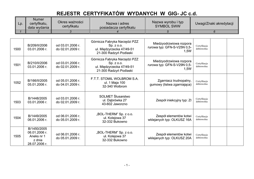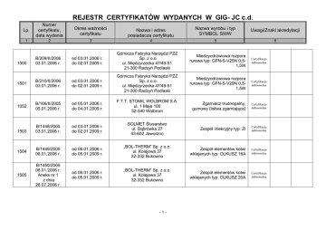 REJESTR CERTYFIKATÓW WYDANYCH W GIG- JC c.d. Lp. Numer certyfikatu, data wydania Okres ważności certyfikatu Nazwa i adres posiadacza certyfikatu Nazwa wyrobu i typ SYMBOL SWW Uwagi/Znaki akredytacji 1 2 3 4 5 6 B/209/II/2006 03.01.2006 r. od 03.01.2006 r. do 02.01.2009 r. Górnicza Fabryka Narzędzi PZZ Sp. z o.o. ul. Międzyrzecka 47/49-51 21-300 Radzyń Podlaski Miedzyodrzwiowa rozpora rurowa typ: GFN-S-V25N 0,51,5W Certyfikacja dobrowolna 1501 B/210/II/2006 03.01.2006 r. od 03.01.2006 r. do 02.01.2009 r. Górnicza Fabryka Narzędzi PZZ Sp. z o.o. ul. Międzyrzecka 47/49-51 21-300 Radzyń Podlaski Miedzyodrzwiowa rozpora rurowa typ: GFN-S-V29N 0,51,5W Certyfikacja dobrowolna 1052 B/166/II/2005 05.01.2006 r. od 05.01.2006 r. do 04.01.2009 r. F.T.T. STOMIL WOLBROM S.A. ul. 1 Maja 100 32-340 Wolbrom Zgarniacz trudnopalny, gumowy (listwa zgarniająca) Certyfikacja dobrowolna B/1448/2005 03.01.2006 r. od 03.01.2006 r. do 02.01.2009 r. SOLMET Ślusarstwo ul. Dąbrówka 27 43-602 Jaworzno Zespół iniekcyjny typ: ZI Certyfikacja dobrowolna 1504 B/1449/2005 06.01.2006 r. od 06.01.2006 r. do 05.01.2009 r. „BOL-THERM” Sp. z o.o. ul. Kolejowa 37 32-332 Bukowno Zespół elementów kotwi wklejanych typ: OLKUSZ 16A Certyfikacja dobrowolna 1505 B/1450/2005 06.01.2006 r. Aneks nr 1 z dnia 28.07.2006 r. od 06.01.2006 r. do 05.01.2009 r. „BOL-THERM” Sp. z o.o. ul. Kolejowa 37 32-332 Bukowno Zespół elementów kotwi wklejanych typ: OLKUSZ 20A Certyfikacja dobrowolna 1500 1503 -1- REJESTR CERTYFIKATÓW WYDANYCH W GIG- JC c.d. Lp. Numer certyfikatu, data wydania Okres ważności certyfikatu Nazwa i adres posiadacza certyfikatu Nazwa wyrobu i typ SYMBOL SWW Uwagi/Znaki akredytacji 1 2 3 4 5 6 1506 CZ/1451/2005 26.04.2006 r. od 26.04.2006 r. do 25.04.2009 r. WPHP „KAMAX” ul. Opiesińska 7a 98-220 Zduńska Wola Typoszereg złączy wtykowych typu STECKO do wysokociśnieniowych węży hydraulicznych 1507 B/1452/2005 22.02.2006 r. od 22.02.2006 r. do 21.02.2009 r. „TESECO” Sp. z o.o. ul. Bychowska 61 04-536 Warszawa Tkanina techniczna dwustronnie powlekana PVC typ: TS-3W 1508 B/1453/2005 22.03.2006 r. od 22.03.2006 r. do 21.03.2009 r. „SPEC OIL” ul. Węglowa 18 44-240 Żory 1509 CZ/1454/2005 11.08.2006 r. bezterminowo Certyfikacja na znak zgodności Certyfikacja dobrowolna Preparat zapobiegający przymarzaniu materiałów sypkich CARBOSIL Certyfikacja dobrowolna Dąbrowska Fabryka Maszyn Górniczych Separator elektromechaniczny „DAMEL” S.A. SEM-2 Al. J. Piłsudskiego 2 41-300 Dąbrowa Górnicza Certyfikacja na znak zgodności 1510 B/1455/2005 06.02.2006 r. od 06.02.2006 r. do 05.02.2009 r. LOTOS OIL S.A. ul. Elbląska 135 80-718 Gdańsk 1511 B/1456/2005 06.02.2006 r. od 06.02.2006 r. do 05.02.2009 r. LOTOS OIL S.A. ul. Elbląska 135 80-718 Gdańsk -2- Oleje hydraulicznoprzekładniowe HYDRAX HLP w klasach lepkości : 32,46,68,100 i 150 Oleje hydraulicznoprzekładniowe GEROKOP w klasach lepkości : 46,68,100,i 150 Certyfikacja dobrowolna Certyfikacja dobrowolna REJESTR CERTYFIKATÓW WYDANYCH W GIG- JC c.d. Lp. Numer certyfikatu, data wydania Okres ważności certyfikatu Nazwa i adres posiadacza certyfikatu Nazwa wyrobu i typ SYMBOL SWW Uwagi/Znaki akredytacji 1 2 3 4 5 6 1512 B/1457/2005 06.02.2006 r. od 06.02.2006 r. do 05.02.2009 r. LOTOS OIL S.A. ul. Elbląska 135 80-718 Gdańsk 1513 CZ/1458/2006 16.01.2006 r. od 16.01.2006 r. do 15.01.2009 r. 1514 B/1459/2006 ANULOWANO PISMEM EMULKOP EKO Certyfikacja dobrowolna Fabryka Elementów Wyposażenia Budownictwa METALPLAST-KRAKÓW ul. Romanowicza 7 30-702 Kraków Połączenie mechaniczne KRAK-MET typ: KRAK-MET14 Certyfikacja na znak zgodności Typoszereg taśm przenośnikowych gumowych trudno palnych z linkami stalowymi, GTP-ST z breakerem metalowym (M) typu BF Certyfikacja dobrowolna 1515 B/1460/2006 24.01.2006 r. od 24.01.2006 r. do 23.01.2008 r. Fabryka Taśm Transporterowych STOMIL WOLBROM S.A. ul. 1.Maja 100 32-340 Wolbrom 1516 B/1461/2006 22.02.2006 r. od 22.02.2006 r. do 21.02.2009 r. FTT STOMIL WOLBROM S.A. ul. 1 Maja 100 32-340 Wolbrom Typoszereg taśm przenośnikowych tkaninowogumowych, poliamidowych, 4. przekładkowych GTP, min.2+2 Certyfikacja dobrowolna 1517 B/1462/2006 22.02.2006 r. od 22.02.2006 r. do 21.02.2009 r. FTT STOMIL WOLBROM S.A. ul. 1 Maja 100 32-340 Wolbrom Typoszereg taśm przenośnikowych tkaninowogumowych, poliamidowych, 3. przekładkowych GTP, min.2+2 Certyfikacja dobrowolna -3- REJESTR CERTYFIKATÓW WYDANYCH W GIG- JC c.d. Lp. Numer certyfikatu, data wydania Okres ważności certyfikatu Nazwa i adres posiadacza certyfikatu Nazwa wyrobu i typ SYMBOL SWW Uwagi/Znaki akredytacji 1 2 3 4 5 6 Typoszereg taśm przenośnikowych tkaninowogumowych, poliamidowych, 5. przekładkowych GTP, min.2+2 Certyfikacja dobrowolna ZPHU „EZAW” ul. Pszczyńska 53c 44-330 Jastrzębie Zdrój Uszczelki płaskie spoczynkowe z bezazbestowej płyty uszczelkarskiej EzaBisu Certyfikacja dobrowolna Uszczelki płaskie spoczynkowe z bezazbestowej płyty uszczelkarskiej EzaBisu Certyfikacja dobrowolna Okładzina stalowa pełna typ: P-1 9o grubości blachy 3mm i 4mm) Certyfikacja dobrowolna 1518 B/1463/2006 22.02.2006 r. od 22.02.2006 r. do 21.02.2009 r. FTT STOMIL WOLBROM S.A. ul. 1 Maja 100 32-340 Wolbrom 1519 B/1464/2006 16.01.2006 r. od 16.01.2006 r. do 15.01.2009 r. 1520 B/1465/2006 16.01.2006 r. od 16.01.2006 r. do 15.01.2009 r. „EBISU” ul. Pszczyńska 53c 44-330 Jastrzębie Zdrój 1521 B/1466/2006 13.01.2006 r. od 13.01.2006 r. do 12.01.2009 r. ZPHU „POLMET” ul. Biskupa Krasickiego 7 83-200 Starogard Gdański 1522 B/335/II/2006 19.01.2006 r. od 19.01.2006 r. do 18.01.2009 r. Zakłady Produkcyjne B-D Sp.j. ul. 11-go Listopada 42-400 Zawiercie Międzyodrzwiowa rozpora rurowa typ: Rd, Rdt Certyfikacja dobrowolna 1523 B/336/II/2006 19.01.2006 r. od 19.01.2006 r. do 18.01.2009 r. Zakłady Produkcyjne B-D sp.j. ul. 11-go Listopada 42-400 Zawiercie Międzyodrzwiowa rozpora rurowa typ: Rd, Rdt Certyfikacja dobrowolna -4- REJESTR CERTYF