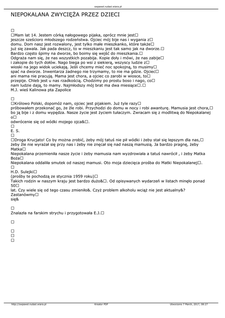 swpawel.rudasl.wiara.pl NIEPOKALANA ZWYCIĘŻA PRZEZ DZIECI Mam lat 14. Jestem córką nałogowego pijaka, oprócz mnie jest jeszcze sześcioro młodszego rodzeństwa. Ojciec mój bije nas i wygania z domu. Dom nasz jest rozwalony, jest tylko małe mieszkanko, które także już się zawala. Jak pada deszcz, to w mieszkaniu jest tak samo jak na dworze. Bardzo często śpimy na dworze, bo boimy się wejść do mieszkania. Odgraża nam się, że nas wszystkich pozabija. Kopie doły i mówi, że nas zabije i zakopie do tych dołów. Nago biega po wsi z siekierą, wszyscy ludzie z wioski na jego widok uciekają. Jeśli chcemy mieć noc spokojną, to musimy spać na dworze. Inwentarza żadnego nie trzymamy, to nie ma gdzie. Ojciec ani mama nie pracują. Mama jest chora, a ojciec co zarobi w wiosce, to przepije. Chleb jest u nas rzadkością. Chodzimy po prostu boso i nago, co nam ludzie dają, to mamy. Najmłodszy mój brat ma dwa miesiące. M.J. wieś Kalinowa pta Zapolice Królowo Polski, dopomóż nam, ojciec jest pijakiem. Już tyle razy próbowałem przekonać go, że źle robi. Przychodzi do domu w nocy i robi awanturę. Mamusia jest chora, bo ją bije i z domu wypędza. Nasze życie jest życiem tułaczym. Zwracam się z modlitwą do Niepokalanej o odwrócenie się od wódki mojego ojca&. E. S. Droga Krucjato! Co by można zrobić, żeby mój tatuś nie pił wódki i żeby stał się lepszym dla nas, żeby źle nie wyrażał się przy nas i żeby nie znęcał się nad naszą mamusią. Ja bardzo pragnę, żeby Matka Niepokalana przemieniła nasze życie i żeby mamusia nam wyzdrowiała a tatuś nawrócił , i żeby Matka Boża Niepokalana oddaliła smutek od naszej mamusi. Oto moja dziecięca prośba do Matki Niepokalanej. H.D. Sulejki (prośby te pochodzą ze stycznia 1959 roku) Takich rodzin w naszym kraju jest bardzo dużo&. Od opisywanych wydarzeń w listach minęło ponad 50 lat. Czy wiele się od tego czasu zmieniło&. Czyż problem alkoholu wciąż nie jest aktualny&? Zastanówmy się& Znalazła na farskim strychu i przygotowała E.J. http://swpawel.rudasl.wiara.pl Kreator PDF Utworzono 7 March, 2017, 08:27