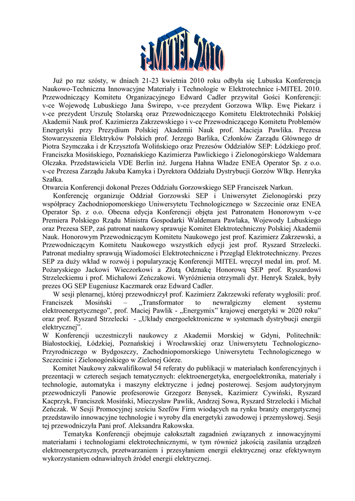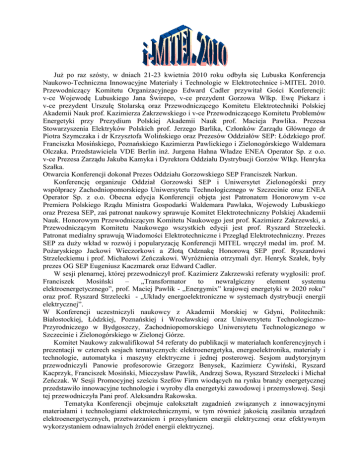 Już po raz szósty, w dniach 21-23 kwietnia 2010 roku odbyła się Lubuska Konferencja Naukowo-Techniczna Innowacyjne Materiały i Technologie w Elektrotechnice i-MITEL 2010. Przewodniczący Komitetu Organizacyjnego Edward Cadler przywitał Gości Konferencji: v-ce Wojewodę Lubuskiego Jana Świrepo, v-ce prezydent Gorzowa Wlkp. Ewę Piekarz i v-ce prezydent Urszulę Stolarską oraz Przewodniczącego Komitetu Elektrotechniki Polskiej Akademii Nauk prof. Kazimierza Zakrzewskiego i v-ce Przewodniczącego Komitetu Problemów Energetyki przy Prezydium Polskiej Akademii Nauk prof. Macieja Pawlika. Prezesa Stowarzyszenia Elektryków Polskich prof. Jerzego Barlika, Członków Zarządu Głównego dr Piotra Szymczaka i dr Krzysztofa Wolińskiego oraz Prezesów Oddziałów SEP: Łódzkiego prof. Franciszka Mosińskiego, Poznańskiego Kazimierza Pawlickiego i Zielonogórskiego Waldemara Olczaka. Przedstawiciela VDE Berlin inż. Jurgena Hahna Władze ENEA Operator Sp. z o.o. v-ce Prezesa Zarządu Jakuba Kamyka i Dyrektora Oddziału Dystrybucji Gorzów Wlkp. Henryka Szałka. Otwarcia Konferencji dokonał Prezes Oddziału Gorzowskiego SEP Franciszek Narkun. Konferencję organizuje Oddział Gorzowski SEP i Uniwersytet Zielonogórski przy współpracy Zachodniopomorskiego Uniwersytetu Technologicznego w Szczecinie oraz ENEA Operator Sp. z o.o. Obecna edycja Konferencji objęta jest Patronatem Honorowym v-ce Premiera Polskiego Rządu Ministra Gospodarki Waldemara Pawlaka, Wojewody Lubuskiego oraz Prezesa SEP, zaś patronat naukowy sprawuje Komitet Elektrotechniczny Polskiej Akademii Nauk. Honorowym Przewodniczącym Komitetu Naukowego jest prof. Kazimierz Zakrzewski, a Przewodniczącym Komitetu Naukowego wszystkich edycji jest prof. Ryszard Strzelecki. Patronat medialny sprawują Wiadomości Elektrotechniczne i Przegląd Elektrotechniczny. Prezes SEP za duży wkład w rozwój i popularyzację Konferencji MITEL wręczył medal im. prof. M. Pożaryskiego Jackowi Wieczorkowi a Złotą Odznakę Honorową SEP prof. Ryszardowi Strzeleckiemu i prof. Michałowi Zeńczakowi. Wyróżnienia otrzymali dyr. Henryk Szałek, były prezes OG SEP Eugeniusz Kaczmarek oraz Edward Cadler. W sesji plenarnej, której przewodniczył prof. Kazimierz Zakrzewski referaty wygłosili: prof. Franciszek Mosiński – „Transformator to newralgiczny element systemu elektroenergetycznego”, prof. Maciej Pawlik - „Energymix” krajowej energetyki w 2020 roku” oraz prof. Ryszard Strzelecki - „Układy energoelektroniczne w systemach dystrybucji energii elektrycznej”. W Konferencji uczestniczyli naukowcy z Akademii Morskiej w Gdyni, Politechnik: Białostockiej, Łódzkiej, Poznańskiej i Wrocławskiej oraz Uniwersytetu TechnologicznoPrzyrodniczego w Bydgoszczy, Zachodniopomorskiego Uniwersytetu Technologicznego w Szczecinie i Zielonogórskiego w Zielonej Górze. Komitet Naukowy zakwalifikował 54 referaty do publikacji w materiałach konferencyjnych i prezentacji w czterech sesjach tematycznych: elektroenergetyka, energoelektronika, materiały i technologie, automatyka i maszyny elektryczne i jednej posterowej. Sesjom audytoryjnym przewodniczyli Panowie profesorowie Grzegorz Benysek, Kazimierz Cywiński, Ryszard Kacprzyk, Franciszek Mosiński, Mieczysław Pawlik, Andrzej Sowa, Ryszard Strzelecki i Michał Zeńczak. W Sesji Promocyjnej sześciu Szefów Firm wiodących na rynku branży energetycznej przedstawiło innowacyjne technologie i wyroby dla energetyki zawodowej i przemysłowej. Sesji tej przewodniczyła Pani prof. Aleksandra Rakowska. Tematyka Konferencji obejmuje całokształt zagadnień związanych z innowacyjnymi materiałami i technologiami elektrotechnicznymi, w tym również jakością zasilania urządzeń elektroenergetycznych, przetwarzaniem i przesyłaniem energii elektrycznej oraz efektywnym wykorzystaniem odnawialnych źródeł energii elektrycznej. Przewodniczący Komitetu Naukowego po raz drugi przyznał wyróżnienia w kategorii „Młody Pracownik Nauki”. Wyróżnienia otrzymali: mgr Jacek Kaniewski za referat „Implementacja układu sterowania transformatora hybrydowego”, mgr Marcin Lewandowski i mgr Adam Pelesz za referat „Elektryzacja kropel aerozoli wytwarzanych przy użyciu głowic hydraulicznych” oraz mgr Sebastian Wiszniewski za referat „Analiza wybranych charakterystyk liniowego silnika tubowego indukcyjnego”. Studenci Wydziału Elektrycznego Zachodniopomorskiego Uniwersytetu Technologicznego Krystian Czyżewski i Jarosław Rojek za interesujący referat „Analiza cieplna napędu z liniowymi silnikami indukcyjnymi o regulowanej częstotliwości” wyróżnieni zostali przez redakcję Wiadomości Elektrotechnicznych rocznymi prenumeratami miesięcznika naukowotechnicznego. Z inicjatywy Prezesów Oddziałów SEP Kolegów Franciszka Mosińskiego, Piotra Szymczaka i Eugeniusza Kaczmarka oraz medialnej współpracy Krzysztofa Wolińskiego po raz drugi Kapituła Konkursowa przyznała wyróżnienia w kategorii „Najlepszy innowacyjny produkt lub technologia elektrotechniczna”. Otrzymali je: Wyróżnienie Wojewody Lubuskiego DEHN Polska Sp. z o.o. w Warszawie za „DEHN suport – pakiet programowy wspomagający projektowanie ochrony odgromowej obiektów budowlanych zgodnie z normą EN 62305”, Wyróżnienie Prezesa SEP PP BEZPOL Sp. J. w Myszkowie za „Rodzinę zacisków transformatorów TOGA”, Wyróżnienie Prezesa Rady Regionalnej NOT w Szczecinie Instytut Energetyki - Zakład Doświadczalny w Białymstoku za „Kompozytowe izolatory wsporcze 20 kV IZO-W4-125”, Wyróżnienie Prezesa Oddziału Gorzowskiego SEP Firma Galmar Marciniak Sp. J. w Poznaniu za „Uziomy i przewody stalowe pomiedziowane”, Wyróżnienie Prezesa Oddziału Łódzkiego SEP BELOS–PLP SA w Bielsku Białej za „System oplotowy BELOS-PLP do budowy i naprawy napowietrznych linii elektroenergetycznych”. A to wszystko miało miejsce w Ośrodku Wypoczynkowo-Konferencyjnym Leśniczówka „Przyłęsko” w Przył