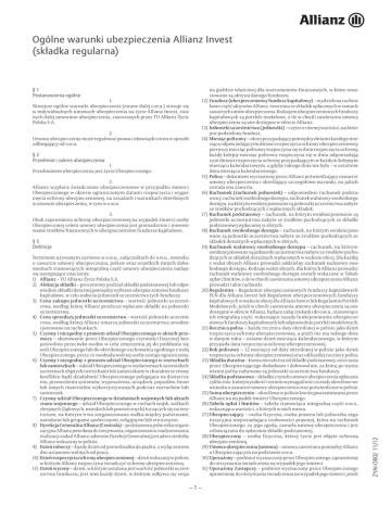 §1 Postanowienia ogólne 1. Niniejsze ogólne warunki ubezpieczenia (zwane dalej o.w.u.) stosuje się w indywidualnych umowach ubezpieczenia na życie Allianz Invest, zwanych dalej umowami ubezpieczenia, zawieranych przez TU Allianz Życie Polska S.A. 2. Umowa ubezpieczenia może regulować prawa i obowiązki stron w sposób odbiegający od o.w.u. §2 Przedmiot i zakres ubezpieczenia 1. Przedmiotem ubezpieczenia jest życie Ubezpieczonego. 2. Allianz wypłaca świadczenie ubezpieczeniowe w przypadku śmierci Ubezpieczonego w okresie ograniczonym datami rozpoczęcia i wygaśnięcia ochrony ubezpieczeniowej, na zasadach i warunkach określonych w umowie ubezpieczenia, w tym w o.w.u. 3. Obok zapewnienia ochrony ubezpieczeniowej na wypadek śmierci osoby Ubezpieczonej celem umowy ubezpieczenia jest gromadzenie i inwestowanie środków finansowych w ubezpieczeniowe fundusze kapitałowe. §3 Definicje Terminom używanym zarówno w o.w.u., załącznikach do o.w.u., wniosku o zawarcie umowy ubezpieczenia, polisie oraz wszelkich innych dokumentach stanowiących integralną część umowy ubezpieczenia nadaje się następujące znaczenia: 1) Allianz – TU Allianz Życie Polska S.A. 2) Alokacja składki – procentowy podział składki podstawowej lub odpowiednio składki doraźnej pomiędzy wybrane ubezpieczeniowe fundusze kapitałowe, w celu nabycia jednostek uczestnictwa tych funduszy. 3) Cena zakupu jednostki uczestnictwa – wartość jednostki uczestnictwa, według której Allianz przelicza wpłacane składki na jednostki uczestnictwa. 4) Cena sprzedaży jednostki uczestnictwa – wartość jednostki uczestnictwa, według której Allianz umarza jednostki uczestnictwa zewidencjonowane na rachunkach. 5) Czynny i niezgodny z prawem udział Ubezpieczonego w aktach przemocy – skierowanie przez Ubezpieczonego czynności fizycznej bezpośrednio przeciwko osobie w celu zmuszenia jej do poddania się woli Ubezpieczonego lub do określonego zachowania zgodnego z wolą Ubezpieczonego, przez co swoboda woli tej osoby zostaje ograniczona. 6) Czynny i niezgodny z prawem udział Ubezpieczonego w rozruchach lub zamieszkach – udział Ubezpieczonego w wydarzeniach zaistniałych na terenach objętych rozruchami lub zamieszkami w charakterze strony konfliktu bądź działalność Ubezpieczonego polegająca na dostarczaniu, przewożeniu systemów, wyposażenia, urządzeń, pojazdów, broni lub innych materiałów wykorzystywanych podczas rozruchów lub zamieszek. 7) Czynny udział Ubezpieczonego w działaniach wojennych lub aktach stanu wojennego – udział Ubezpieczonego w ruchach wojsk, walkach zbrojnych (lądowych, morskich lub powietrznych) toczących się na terytorium, na którym trwa zorganizowana walka między państwami, narodami lub grupami społecznymi, religijnymi lub etnicznymi. 8) Dyrekcja Generalna Allianz (Centrala) – podstawowa jednostka organizacyjna Allianz powołana do inicjowania, organizowania i nadzorowania realizacji zadań Allianz; adresem Dyrekcji Generalnej jest adres siedziby Allianz wskazany w polisie. 9) Dzień roboczy – każdy dzień od poniedziałku do piątku, z wyłączeniem dni ustawowo wolnych od pracy. 10) Dzień rozpoczęcia ochrony ubezpieczeniowej – dzień wskazany w polisie, w którym Allianz rozpoczyna świadczyć ochronę ubezpieczeniową. 11) Dzień wyceny – dzień, w którym ustalana jest wartość jednostki uczestnictwa funduszu; jest nim każdy dzień, w którym odbywa się sesja –1– na giełdzie właściwej dla instrumentów finansowych, w które inwestowane są aktywa danego funduszu. 12)Fundusz (ubezpieczeniowy fundusz kapitałowy) – wydzielona rachunkowo część aktywów Allianz, tworzona ze składek opłacanych w ramach zawartych umów ubezpieczenia. Rodzajem ubezpieczeniowych funduszy kapitałowych są portfele modelowe, o ile w chwili zawierania umowy ubezpieczenia są one dostępne w ofercie Allianz. 13) Jednostki uczestnictwa (jednostki) – części o równej wartości, na które jest podzielony fundusz. 14) Miesiąc polisowy – okres przypadający pomiędzy dniami każdego miesiąca odpowiadającymi dniowi rozpoczęcia ochrony ubezpieczeniowej; pierwszy miesiąc polisowy rozpoczyna się w dniu rozpoczęcia ochrony, każdy kolejny miesiąc polisowy rozpoczyna się w dniu odpowiadającym dniowi rozpoczęcia ochrony przypadającym w każdym kolejnym miesiącu kalendarzowym, a gdyby takiego dnia nie było – w ostatnim dniu miesiąca kalendarzowego. 15)Polisa – dokument wystawiony przez Allianz potwierdzający zawarcie umowy ubezpieczenia i określający szczegółowo warunki, na jakich została ona zawarta. 16)Rachunek (rachunek jednostek) – odpowiednio rachunek podstawowy, rachunek swobodnego dostępu, rachunek walutowy swobodnego dostępu, na którym ewidencjonowane są jednostki uczestnictwa nabyte ze środków pochodzących z wpłaconych składek. 17) Rachunek podstawowy – rachunek, na którym ewidencjonowane są jednostki uczestnictwa nabyte ze środków pochodzących ze składki podstawowej wpłacanej w złotych. 18) Rachunek swobodnego dostępu – rachunek, na którym ewidencjonowane są jednostki uczestnictwa nabyte ze środków pochodzących ze składek doraźnych wpłaconych w złotych. 19) Rachunek walutowy swobodnego dostępu – rachunek, na którym ewidencjonowane są jednostki uczestnictwa nabyte ze środków pochodzących ze składek doraźnych wpłaconych w walucie obcej. Dla każdej z walut obcych Allianz prowadzi oddzielny rachunek walutowy swobodnego dostępu. Rodzaje walut obcych, dla których Allianz prowadzi rachunek walutowy swobodnego dostępu zostały wskazane w Tabeli opłat i limitów, o ile w chwili zawierania umowy ubezpieczenia Allianz prowadzi takie rachunki. 20)Regulamin – Regulamin ubezpieczeniowych funduszy kapitałowych PLN dla Allianz Invest lub Regulamin ubezpieczeniowych funduszy kapitałowych w walucie obcej dla Allianz Invest lub Regulamin Portfeli Modelowych, jeżeli w chwili zawierani