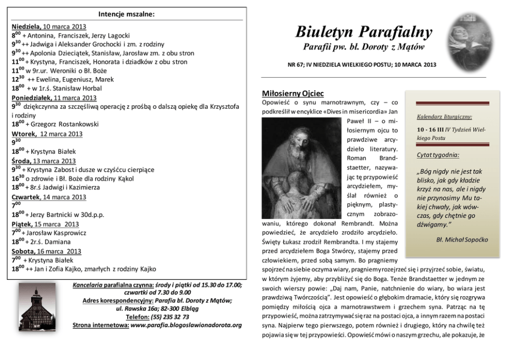 Intencje mszalne: Niedziela, 10 marca 2013 800 + Antonina, Franciszek, Jerzy Lagocki 930 ++ Jadwiga i Aleksander Grochocki i zm. z rodziny 930 ++ Apolonia Dzieciątek, Stanisław, Jarosław zm. z obu stron 1100 + Krystyna, Franciszek, Honorata i dziadków z obu stron 1100 w 9r.ur. Weroniki o Bł. Boże 1230 ++ Ewelina, Eugeniusz, Marek 1800 + w 1r.ś. Stanisław Horbal Poniedziałek, 11 marca 2013 930 dziękczynna za szczęśliwą operację z prośbą o dalszą opiekę dla Krzysztofa i rodziny 1800 + Grzegorz Rostankowski Wtorek, 12 marca 2013 930 1800 + Krystyna Białek Środa, 13 marca 2013 930 + Krystyna Zabost i dusze w czyśćcu cierpiące 1630 o zdrowie i Bł. Boże dla rodziny Kąkol 1800 + 8r.ś Jadwigi i Kazimierza Czwartek, 14 marca 2013 700 1800 + Jerzy Bartnicki w 30d.p.p. Piątek, 15 marca 2013 700 + Jarosław Kasprowicz 1800 + 2r.ś. Damiana Sobota, 16 marca 2013 700 + Krystyna Białek 1800 ++ Jan i Zofia Kajko, zmarłych z rodziny Kajko Kancelaria parafialna czynna: środy i piątki od 15.30 do 17.00; czwartki od 7.30 do 9.00 Adres korespondencyjny: Parafia bł. Doroty z Mątów; ul. Rawska 16a; 82-300 Elbląg Telefon: (55) 235 32 73 Strona internetowa: www.parafia.blogoslawionadorota.org Biuletyn Parafialny Parafii pw. bł. Doroty z Mątów NR 67; IV NIEDZIELA WIELKIEGO POSTU; 10 MARCA 2013 Miłosierny Ojciec Opowieść o synu marnotrawnym, czy – co podkreślił w encyklice «Dives in misericordia» Jan Kalendarz liturgiczny: Paweł II – o mi10 - 16 III IV Tydzień Wielłosiernym ojcu to kiego Postu prawdziwe arcydzieło literatury. Cytat tygodnia: Roman Brandstaetter, nazywa„Bóg nigdy nie jest tak jąc tę przypowieść blisko, jak gdy kładzie arcydziełem, mykrzyż na nas, ale i nigdy ślał również o nie przynosimy Mu tapięknym, plastykiej chwały, jak wówcznym zobrazoczas, gdy chętnie go waniu, którego dokonał Rembrandt. Można dźwigamy.” powiedzieć, że arcydzieło zrodziło arcydzieło. Bł. Michał Sopoćko Święty Łukasz zrodził Rembrandta. I my stajemy przed arcydziełem Boga Stwórcy, stajemy przed człowiekiem, przed sobą samym. Bo pragniemy spojrzeć na siebie oczyma wiary, pragniemy rozejrzeć się i przyjrzeć sobie, światu, w którym żyjemy, aby przybliżyć się do Boga. Tenże Brandstaetter w jednym ze swoich wierszy powie: „Daj nam, Panie, natchnienie do wiary, bo wiara jest prawdziwą Twórczością”. Jest opowieść o głębokim dramacie, który się rozgrywa pomiędzy miłością ojca a marnotrawstwem i grzechem syna. Patrząc na tę przypowieść, można zatrzymywać się raz na postaci ojca, a innym razem na postaci syna. Najpierw tego pierwszego, potem również i drugiego, który na chwilę też pojawia się w tej przypowieści. Opowieść mówi o naszym grzechu, ale pokazuje, że zawsze możliwy jest powrót. Mówi o utracie naszej godności – nazwijmy ją godnością „syna w domu Ojca”. Jest to również opowieść o naszych domowych, rodzinnych relacjach. Syna do ojca, matki do córki. Jakże często ostro oceniamy swoich rodziców, musimy pokochać ich takimi, jakimi są. Żyjemy, dorastamy w klimacie wzajemnej miłości, a jeśli tej miłości nie ma, wtedy pojawia się dramat. Jest to dalej opowieść o zazdrości, ten drugi syn wiele mówi o nas samych. Przypowieść ta mówi w końcu i o radości, i o tym, że dla Boga wszystko jest możliwe, bo On kruszy najtwardsze serca. „Cieszmy się i radujmy, że ten twój brat...”. Warto czasami na tę ewangeliczną przypowieść spojrzeć przez postać ojca. Takie patrzenie zaproponował Papież w encyklice «O Bożym miłosierdziu». Ojciec tutaj jest nazywany miłosiernym. „Precyzyjny rysunek stanu duszy syna marnotrawnego pozwala nam z podobną precyzją zrozumieć, na czym polega miłosierdzie Boże”. Bo przecież postać ojca przez analogię odsłania Boga, który jest Ojcem. Postępowanie tego ojca z przypowieści, sposób jego zachowania pozwala nam odnaleźć wątki Bożego miłosierdzia w jego prostocie i głębi. dusz nie zapomniał Don Orione także o misjach zagranicznych, zakładając placówki: w Argentynie, Brazylii, Chile, w Urugwaju itp., by nieść pomoc włoskim emigrantom. Szczególnie ciepły stosunek żywił Alojzy do Polski. Mimo że nigdy w niej nie był, ukochał ją za jej szczególną wierność Bogu, za jej umiłowanie wolności i za szczególne nabożeństwo polskiego narodu do Najświętszej Maryi Panny. Zwykł był mawiać, że gdyby nie był Włochem, chciałby być Polakiem. Gdy dnia 1 września 1939 roku Niemcy hitlerowskie napadły na Polskę, kazał odprawić w intencji naszej Ojczyzny nabożeństwo błagalne o ratunek dla niej. Przy ołtarzu kazał umieścić flagę biało-czerwoną. Alojzy Orione zmarł na zawał serca 12 marca 1940 r. Ogłoszenia parafialne – IV Niedziela Wielkiego Postu 1. Plan rekolekcji od poniedziałku do środy: 00 Święci znani… i nie znani Św. Alojzy Orione Alojzy urodził się 23 czerwca 1872 r. jako syn kamieniarza w Pontecurone, w pobliżu Tortony. Kiedy Alojzy miał 6 lat, rozpoczął naukę w szkole prywatnej w stopniu podstawowym. W wolnych godzinach pomagał w domu. W trzynastym roku życia zgłosił się do franciszkanów. Pozostał tam jednak niecały rok - musiał wracać do domu, gdyż rozchorował się na zapalenie płuc. Po powrocie do zdrowia pomagał ojcu w brukowaniu ulic i dróg. Miejscowy proboszcz poznał się na niezwykłych zaletach chłopca - zarówno moralnych, jak i duchowych. Dlatego umieścił go w internacie, który założył i prowadził św. Jan Bosko w Turynie (wrzesień 1886). Orione miał wówczas 14 lat. Następnie wstąpił do diecezjalnego seminarium duchownego w Tortonie. 13 kwietnia 1895 roku otrzymał święcenia kapłańskie. Miał wówczas 23 lata. W roku 1903 powstałanowa rodzina zakonna pod nazwą Synów Bożej Opatrzności, zwana popularnie orionistami. Z czasem powstała także gałąź żeńska. Alojzy zakładał szkoły, uczył w nich rzemio