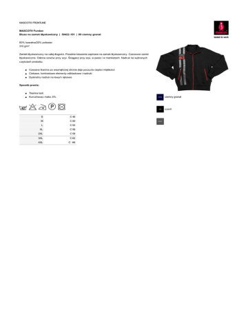 MASCOT® FRONTLINE MASCOT® Fundao Bluza na zamek błyskawiczny | 50422-191 | 09 ciemny granat 80% bawełna/20% poliester 310 g/m² Zamek błyskawiczny na całej długości. Przednie kieszenie zapinane na zamek błyskawiczny. Czerwone zamki błyskawiczne. Osłona szwów przy szyi. Ściągacz przy szyi, w pasie i w mankietach. Nadruk na wybranych częściach produktu. l Czesana tkanina po wewnętrznej stronie daje poczucie ciepła i miękkości l Ciekawe, kontrastowe elementy odblaskowe i nadruki l Dyskretny nadruk na lewym rękawie Sposób prania: l Tkanina Isoli. l Kurczliwość maks. 5%. ciemny granat czerń S C 46 M C 50 L C 52 XL C 56 2XL C 58 3XL C 62 4XL C66