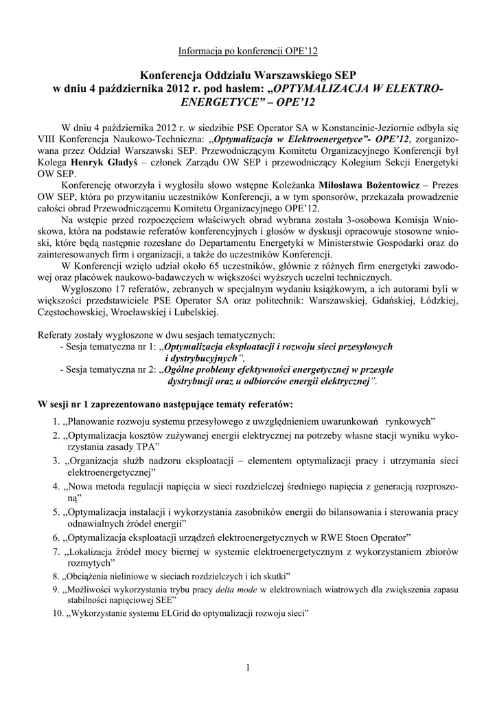 Informacja po konferencji OPE’12 Konferencja Oddziału Warszawskiego SEP w dniu 4 października 2012 r. pod hasłem: ,,OPTYMALIZACJA W ELEKTROENERGETYCE” – OPE’12 W dniu 4 października 2012 r. w siedzibie PSE Operator SA w Konstancinie-Jeziornie odbyła się VIII Konferencja Naukowo-Techniczna: ,,Optymalizacja w Elektroenergetyce”- OPE’12, zorganizowana przez Oddział Warszawski SEP. Przewodniczącym Komitetu Organizacyjnego Konferencji był Kolega Henryk Gładyś – członek Zarządu OW SEP i przewodniczący Kolegium Sekcji Energetyki OW SEP. Konferencję otworzyła i wygłosiła słowo wstępne Koleżanka Miłosława Bożentowicz – Prezes OW SEP, która po przywitaniu uczestników Konferencji, a w tym sponsorów, przekazała prowadzenie całości obrad Przewodniczącemu Komitetu Organizacyjnego OPE’12. Na wstępie przed rozpoczęciem właściwych obrad wybrana została 3-osobowa Komisja Wnioskowa, która na podstawie referatów konferencyjnych i głosów w dyskusji opracowuje stosowne wnioski, które będą następnie rozesłane do Departamentu Energetyki w Ministerstwie Gospodarki oraz do zainteresowanych firm i organizacji, a także do uczestników Konferencji. W Konferencji wzięło udział około 65 uczestników, głównie z różnych firm energetyki zawodowej oraz placówek naukowo-badawczych w większości wyższych uczelni technicznych. Wygłoszono 17 referatów, zebranych w specjalnym wydaniu książkowym, a ich autorami byli w większości przedstawiciele PSE Operator SA oraz politechnik: Warszawskiej, Gdańskiej, Łódzkiej, Częstochowskiej, Wrocławskiej i Lubelskiej. Referaty zostały wygłoszone w dwu sesjach tematycznych: - Sesja tematyczna nr 1: ,,Optymalizacja eksploatacji i rozwoju sieci przesyłowych i dystrybucyjnych”, - Sesja tematyczna nr 2: ,,Ogólne problemy efektywności energetycznej w przesyle dystrybucji oraz u odbiorców energii elektrycznej”. W sesji nr 1 zaprezentowano następujące tematy referatów: 1. ,,Planowanie rozwoju systemu przesyłowego z uwzględnieniem uwarunkowań rynkowych” 2. ,,Optymalizacja kosztów zużywanej energii elektrycznej na potrzeby własne stacji wyniku wykorzystania zasady TPA” 3. ,,Organizacja służb nadzoru eksploatacji – elementem optymalizacji pracy i utrzymania sieci elektroenergetycznej” 4. ,,Nowa metoda regulacji napięcia w sieci rozdzielczej średniego napięcia z generacją rozproszoną” 5. ,,Optymalizacja instalacji i wykorzystania zasobników energii do bilansowania i sterowania pracy odnawialnych źródeł energii” 6. ,,Optymalizacja eksploatacji urządzeń elektroenergetycznych w RWE Stoen Operator” 7. ,,Lokalizacja źródeł mocy biernej w systemie elektroenergetycznym z wykorzystaniem zbiorów rozmytych” 8. ,,Obciążenia nieliniowe w sieciach rozdzielczych i ich skutki” 9. ,,Możliwości wykorzystania trybu pracy delta mode w elektrowniach wiatrowych dla zwiększenia zapasu stabilności napięciowej SEE” 10. ,,Wykorzystanie systemu ELGrid do optymalizacji rozwoju sieci” 1 W sesji nr 2 natomiast zaprezentowano następujące tematy referatów: 1. ,,Koncepcja POLAND EFFICIENCY, jako istotny element strategii rozwoju systemu elektroenergetycznego” 2. ,,Zastosowanie linii tymczasowej, jako elementu optymalizacji pracy sieci przesyłowej” 3. ,,Optymalizacja pracy odnawialnych źródeł energii w sieci z lokalną generacją rozproszoną” 4. ,,Trendy i perspektywiczne kierunki rozwoju inteligentnych systemów pomiarowych” 5. ,,Pomiar zużycia energii elektrycznej, a efektywność energetyczna” 6. ,,Minimalizacja kosztów zakupu energii elektrycznej odbiorcy przemysłowego” 7. ,,Możliwości poprawy efektywnego wykorzystania energii elektrycznej za pomocą urządzeń przeznaczonych do zapewnienia odpowiedniej ilości energii elektrycznej” Po wygłoszeniu referatów w czasie przerwy obiadowej część uczestników zwiedziła punkt dyspozytorski Krajowej Dyspozycji Mocy, a następnie odbyła się dyskusji ogólna. Po tej dyskusji zabrał głos w imieniu Komisji Wnioskowej – Kolega Ryszard Marcińczak – Prezes Koła SEP nr 206 przy PGE SA, który omówił tryb opracowania wniosków konferencyjnych. Podsumowania i zamknięcia Konferencji dokonali: Przewodniczący obrad i Prezes OW SEP, dziękując jednocześnie wszystkim, którzy przyczynili się do organizacji i przebiegu Konferencji. Podziękowanie skierowane zostało również do Instytutu Elektroenergetyki Politechniki Warszawskiej, który objął patronat merytoryczny nad Konferencją. ————————————————————— 2