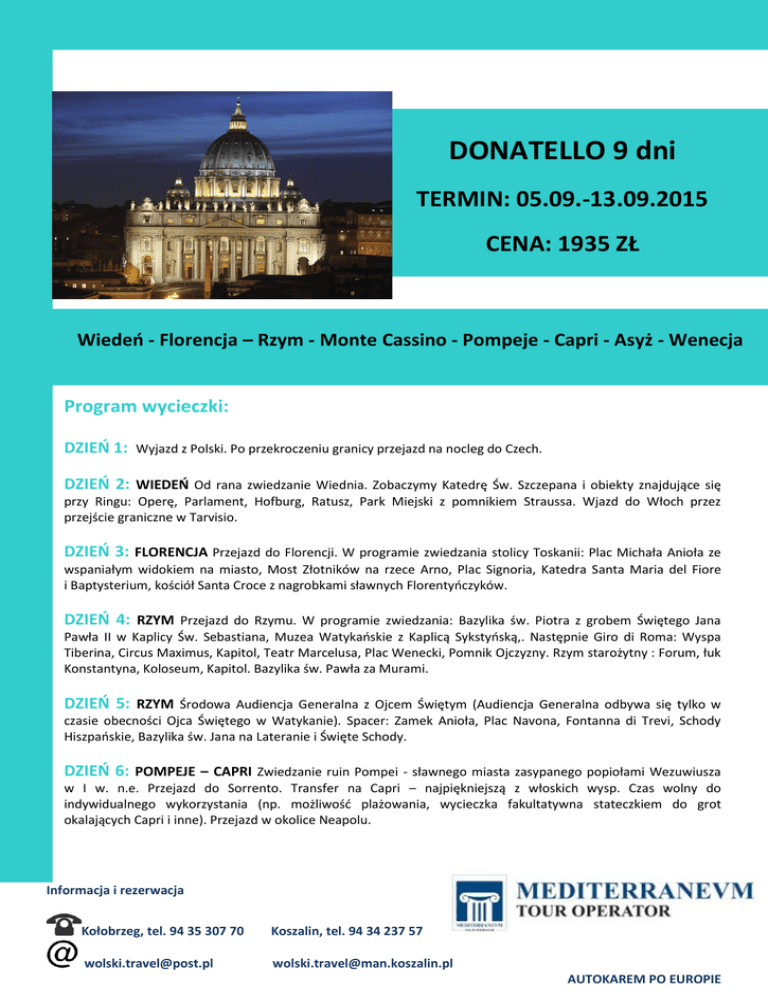 DONATELLO 9 dni TERMIN: 05.09.-13.09.2015 CENA: 1935 ZŁ Wiedeń - Florencja – Rzym - Monte Cassino - Pompeje - Capri - Asyż - Wenecja Program wycieczki: DZIEŃ 1: Wyjazd z Polski. Po przekroczeniu granicy przejazd na nocleg do Czech. DZIEŃ 2: WIEDEŃ Od rana zwiedzanie Wiednia. Zobaczymy Katedrę Św. Szczepana i obiekty znajdujące się przy Ringu: Operę, Parlament, Hofburg, Ratusz, Park Miejski z pomnikiem Straussa. Wjazd do Włoch przez przejście graniczne w Tarvisio. DZIEŃ 3: FLORENCJA Przejazd do Florencji. W programie zwiedzania stolicy Toskanii: Plac Michała Anioła ze wspaniałym widokiem na miasto, Most Złotników na rzece Arno, Plac Signoria, Katedra Santa Maria del Fiore i Baptysterium, kościół Santa Croce z nagrobkami sławnych Florentyńczyków. DZIEŃ 4: RZYM Przejazd do Rzymu. W programie zwiedzania: Bazylika św. Piotra z grobem Świętego Jana Pawła II w Kaplicy Św. Sebastiana, Muzea Watykańskie z Kaplicą Sykstyńską,. Następnie Giro di Roma: Wyspa Tiberina, Circus Maximus, Kapitol, Teatr Marcelusa, Plac Wenecki, Pomnik Ojczyzny. Rzym starożytny : Forum, łuk Konstantyna, Koloseum, Kapitol. Bazylika św. Pawła za Murami. DZIEŃ 5: RZYM Środowa Audiencja Generalna z Ojcem Świętym (Audiencja Generalna odbywa się tylko w czasie obecności Ojca Świętego w Watykanie). Spacer: Zamek Anioła, Plac Navona, Fontanna di Trevi, Schody Hiszpańskie, Bazylika św. Jana na Lateranie i Święte Schody. DZIEŃ 6: POMPEJE – CAPRI Zwiedzanie ruin Pompei - sławnego miasta zasypanego popiołami Wezuwiusza w I w. n.e. Przejazd do Sorrento. Transfer na Capri – najpiękniejszą z włoskich wysp. Czas wolny do indywidualnego wykorzystania (np. możliwość plażowania, wycieczka fakultatywna stateczkiem do grot okalających Capri i inne). Przejazd w okolice Neapolu. Informacja i rezerwacja Kołobrzeg, tel. 94 35 307 70 Koszalin, tel. 94 34 237 57 [email protected] [email protected] AUTOKAREM PO EUROPIE DZIEŃ 7: MONTE CASSINO – ASYŻ Pobyt na Monte Cassino: Opactwo Benedyktyńskie (z zewnątrz), Cmentarz Polski Żołnierzy II Korpusu i Muzeum Historii Bitwy o Monte Cassino. Przejazd do leżącego w Umbrii Asyżu miasta św. Franciszka patrona Włoch. W programie spacer po mieście, zwiedzanie Bazyliki św. Franciszka oraz Bazyliki św. Klary. DZIEŃ 8: WENECJA Przejazd do Wenecji na parking Tronchetto (postój 9 godzin). Transfer Giudeccą do Placu św. Marka. Zwiedzanie Bazyliki św. Marka - patrona Wenecji, Pałacu Dożów (z zewnątrz) wraz ze sławnym Mostem Westchnień, Wieży Zegarowej, Dzwonnicy. Czas wolny lub propozycja fakultatywna: przejażdżka gondolami. Spacer do Mostu Rialto. Powrót na Tronchetto. Nocny przejazd przez Austrię i Czechy. DZIEŃ 9: Przyjazd do Polski. Zakończenie wycieczki. UWAGA - KOLEJNOŚĆ ZWIEDZANIA MOŻE ULEC ZMIANIE Świadczenia zawarte w cenie: Przejazd komfortowym autokarem wyposażonym w klimatyzację, wc, barek i dvd. W autokarze kawa, herbata i napoje za złotówki. 7 noclegów w hotelach 3* lub 4* (Czechy x1, północne Włochy x1, Chianciano Terme x1, ok. Rzymu x2, ok. Neapolu x1, ok. Pieve Santo Stefano/ok. Rimini x1). Pokoje 2 ilub3 os. z łazienkami. Dopłata za pokój 1-osobowy (630 zł/os.) 7 śniadań kontynentalnych i 7 obiadokolacji (w cenę obiadokolacji nie są wliczone napoje). Ubezpieczenie KL do 15 000 EUR, NW i bagaż do 1000 zł Opieka pilota. Wydatki programowe Wstępy + wjazdy do miast + metro w Rzymie + kolejka Circusvesuviana + transfery Wenecja i Capri + przewodnicy miejscowi około 155 euro. Propozycje fakultatywne Wenecja - gondole: 90 euro za 6 osób Capri - przejażdżka do Lazurowej Groty: 24 euro/os Capri - przejażdżka wokół wyspy: 15 euro/os Wydatki programowe i propozycje fakultatywne są opłacane indywidualnie przez uczestników wycieczki. Informacja i rezerwacja Kołobrzeg, tel. 94 35 307 70 Koszalin, tel. 94 34 237 57 [email protected] [email protected] AUTOKAREM PO EUROPIE