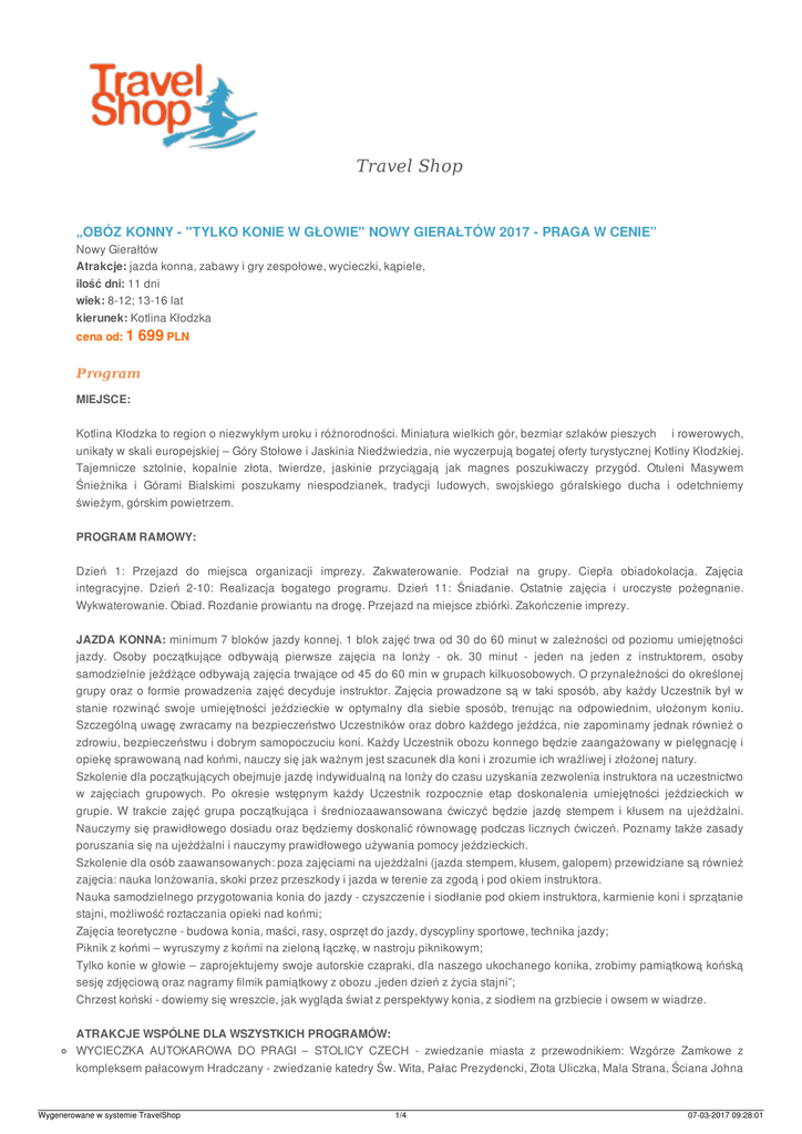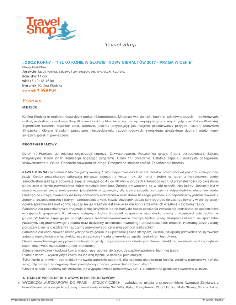Travel Shop „OBÓZ KONNY - "TYLKO KONIE W GŁOWIE" NOWY GIERAŁTÓW 2017 - PRAGA W CENIE” Nowy Gierałtów Atrakcje: jazda konna, zabawy i gry zespołowe, wycieczki, kąpiele, ilość dni: 11 dni wiek: 8-12; 13-16 lat kierunek: Kotlina Kłodzka cena od: 1 699 PLN Program MIEJSCE: Kotlina Kłodzka to region o niezwykłym uroku i różnorodności. Miniatura wielkich gór, bezmiar szlaków pieszych i rowerowych, unikaty w skali europejskiej – Góry Stołowe i Jaskinia Niedźwiedzia, nie wyczerpują bogatej oferty turystycznej Kotliny Kłodzkiej. Tajemnicze sztolnie, kopalnie złota, twierdze, jaskinie przyciągają jak magnes poszukiwaczy przygód. Otuleni Masywem Śnieżnika i Górami Bialskimi poszukamy niespodzianek, tradycji ludowych, swojskiego góralskiego ducha i odetchniemy świeżym, górskim powietrzem. PROGRAM RAMOWY: Dzień 1: Przejazd do miejsca organizacji imprezy. Zakwaterowanie. Podział na grupy. Ciepła obiadokolacja. Zajęcia integracyjne. Dzień 2-10: Realizacja bogatego programu. Dzień 11: Śniadanie. Ostatnie zajęcia i uroczyste pożegnanie. Wykwaterowanie. Obiad. Rozdanie prowiantu na drogę. Przejazd na miejsce zbiórki. Zakończenie imprezy. JAZDA KONNA: minimum 7 bloków jazdy konnej. 1 blok zajęć trwa od 30 do 60 minut w zależności od poziomu umiejętności jazdy. Osoby początkujące odbywają pierwsze zajęcia na lonży - ok. 30 minut - jeden na jeden z instruktorem, osoby samodzielnie jeżdżące odbywają zajęcia trwające od 45 do 60 min w grupach kilkuosobowych. O przynależności do określonej grupy oraz o formie prowadzenia zajęć decyduje instruktor. Zajęcia prowadzone są w taki sposób, aby każdy Uczestnik był w stanie rozwinąć swoje umiejętności jeździeckie w optymalny dla siebie sposób, trenując na odpowiednim, ułożonym koniu. Szczególną uwagę zwracamy na bezpieczeństwo Uczestników oraz dobro każdego jeźdźca, nie zapominamy jednak również o zdrowiu, bezpieczeństwu i dobrym samopoczuciu koni. Każdy Uczestnik obozu konnego będzie zaangażowany w pielęgnację i opiekę sprawowaną nad końmi, nauczy się jak ważnym jest szacunek dla koni i zrozumie ich wrażliwej i złożonej natury. Szkolenie dla początkujących obejmuje jazdę indywidualną na lonży do czasu uzyskania zezwolenia instruktora na uczestnictwo w zajęciach grupowych. Po okresie wstępnym każdy Uczestnik rozpocznie etap doskonalenia umiejętności jeździeckich w grupie. W trakcie zajęć grupa początkująca i średniozaawansowana ćwiczyć będzie jazdę stempem i kłusem na ujeżdżalni. Nauczymy się prawidłowego dosiadu oraz będziemy doskonalić równowagę podczas licznych ćwiczeń. Poznamy także zasady poruszania się na ujeżdżalni i nauczymy prawidłowego używania pomocy jeździeckich. Szkolenie dla osób zaawansowanych: poza zajęciami na ujeżdżalni (jazda stempem, kłusem, galopem) przewidziane są również zajęcia: nauka lonżowania, skoki przez przeszkody i jazda w terenie za zgodą i pod okiem instruktora. Nauka samodzielnego przygotowania konia do jazdy - czyszczenie i siodłanie pod okiem instruktora, karmienie koni i sprzątanie stajni, możliwość roztaczania opieki nad końmi; Zajęcia teoretyczne - budowa konia, maści, rasy, osprzęt do jazdy, dyscypliny sportowe, technika jazdy; Piknik z końmi – wyruszymy z końmi na zieloną łączkę, w nastroju piknikowym; Tylko konie w głowie – zaprojektujemy swoje autorskie czapraki, dla naszego ukochanego konika, zrobimy pamiątkową końską sesję zdjęciową oraz nagramy filmik pamiątkowy z obozu „jeden dzień z życia stajni”; Chrzest koński - dowiemy się wreszcie, jak wygląda świat z perspektywy konia, z siodłem na grzbiecie i owsem w wiadrze. ATRAKCJE WSPÓLNE DLA WSZYSTKICH PROGRAMÓW: WYCIECZKA AUTOKAROWA DO PRAGI – STOLICY CZECH - zwiedzanie miasta z przewodnikiem: Wzgórze Zamkowe z kompleksem pałacowym Hradczany - zwiedzanie katedry Św. Wita, Pałac Prezydencki, Złota Uliczka, Mala Strana, Ściana Johna Wygenerowane w systemie TravelShop 1/4 07-03-2017 09:28:01 Lenona; Spacer Mostem Karola, Rynek Staromiejski ze sławnym zegarem słonecznym - Orloyem, Kościół Św. Mikołaja, Kościół Matki Bożej przed Tynem; zadanie terenowe z wykorzystaniem mapy na praskiej starówce; WYCIECZKA AUTOKAROWA DO KOPALNI ZŁOTA W ZŁOTYM STOKU z labiryntem korytarzy, sztolni i podziemnym wodospadem oraz spacer po zabytkowym centrum Lądka Zdroju; WYCIECZKA AUTOKAROWA DO NAJWIĘKSZEJ ATRAKCJI KOTLINY KŁODZKIEJ - JASKINI NIEDŹWIEDZIEJ ZDOBYCIE ŚNIEŻNIKA (1425 m npm) najwyższego szczytu Sudetów Wschodnich oraz pyszna czekolada na gorąco w klimatycznym schronisku górskim; KĄPIELE W ZALEWIE pod opieką ratownika, PRZYSPIESZONY KURS JĘZYKA CZESKIEGO na wesoło na przejściu granicznym z Czechami. SPOTKANIE Z PRACOWNIKIEM GOPR; GRY ZRĘCZNOŚCIOWE I ZESPOŁOWE – siatkówka, rugby, palant, zawody sportowe; TEAM BUILDING – czyli zabawy integrujące grupę, wymagające od nas współpracy i kreatywności. Przejdziemy przez labirynt, damy się „spakować”, spróbujemy nie uronić ani kropli wody z wiadra; WIECZÓR MAGII: WRÓŻB, ZACZAROWANYCH CIASTECZEK, TAJEMNYCH ZAKLĘĆ I LATANIA NA MIOTLE - zaprzyjaźniona czarownica Kunegunda, z uwagi na awarię miotły zatrzymała się w naszym ośrodku. Spróbujemy zreperować jej urządzenie, a ona przekaże nam kilka swoich tajemnic. PODCHODY, ZWIADY TERENOWE I ŚWIETLIKI – czyli zadania leśne i terenowe; PARTY TIME – dyskoteka integracyjna, piżama party, karaoke; OBOZOWY MEGA TALK SHOW – przygotowany z naszym udziałem i pełen niespodzianek; BAL ROBOTÓW – elektrodance oraz robotyczny wizerunek stworzony własnoręcznie. SESJA ZDJĘCIOWA NA WESOŁO; MAGICZNY SEANS FILMOWY; OGNISKO Z KIEŁBASKAMI; PAMIĄTKA – gadżety Travel Shop oraz dostęp do zdjęć i filmów z obozu :) ATRAKCJE FAKULTATYWNE: WYCIECZKA W GÓRY STOŁOWE podczas której odwiedzimy Twierdzę w Kłodzku i przespacerujemy się po