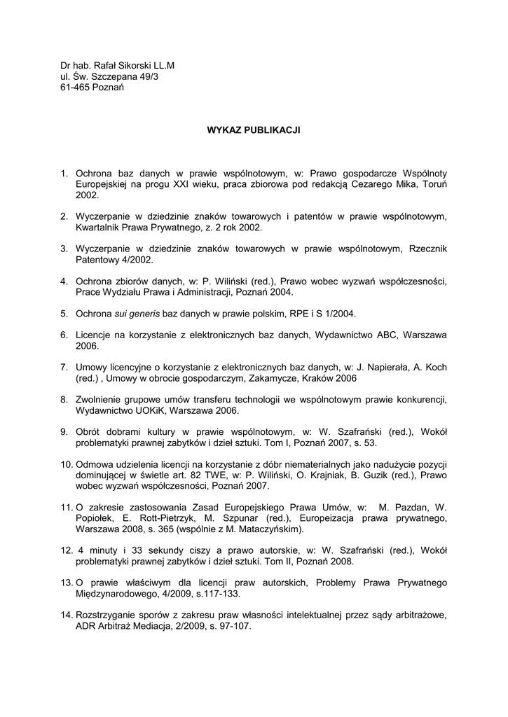 Dr hab. Rafał Sikorski LL.M ul. Św. Szczepana 49/3 61-465 Poznań WYKAZ PUBLIKACJI 1. Ochrona baz danych w prawie wspólnotowym, w: Prawo gospodarcze Wspólnoty Europejskiej na progu XXI wieku, praca zbiorowa pod redakcją Cezarego Mika, Toruń 2002. 2. Wyczerpanie w dziedzinie znaków towarowych i patentów w prawie wspólnotowym, Kwartalnik Prawa Prywatnego, z. 2 rok 2002. 3. Wyczerpanie w dziedzinie znaków towarowych w prawie wspólnotowym, Rzecznik Patentowy 4/2002. 4. Ochrona zbiorów danych, w: P. Wiliński (red.), Prawo wobec wyzwań współczesności, Prace Wydziału Prawa i Administracji, Poznań 2004. 5. Ochrona sui generis baz danych w prawie polskim, RPE i S 1/2004. 6. Licencje na korzystanie z elektronicznych baz danych, Wydawnictwo ABC, Warszawa 2006. 7. Umowy licencyjne o korzystanie z elektronicznych baz danych, w: J. Napierała, A. Koch (red.) , Umowy w obrocie gospodarczym, Zakamycze, Kraków 2006 8. Zwolnienie grupowe umów transferu technologii we wspólnotowym prawie konkurencji, Wydawnictwo UOKiK, Warszawa 2006. 9. Obrót dobrami kultury w prawie wspólnotowym, w: W. Szafrański (red.), Wokół problematyki prawnej zabytków i dzieł sztuki. Tom I, Poznań 2007, s. 53. 10. Odmowa udzielenia licencji na korzystanie z dóbr niematerialnych jako nadużycie pozycji dominującej w świetle art. 82 TWE, w: P. Wiliński, O. Krajniak, B. Guzik (red.), Prawo wobec wyzwań współczesności, Poznań 2007. 11. O zakresie zastosowania Zasad Europejskiego Prawa Umów, w: M. Pazdan, W. Popiołek, E. Rott-Pietrzyk, M. Szpunar (red.), Europeizacja prawa prywatnego, Warszawa 2008, s. 365 (wspólnie z M. Mataczyńskim). 12. 4 minuty i 33 sekundy ciszy a prawo autorskie, w: W. Szafrański (red.), Wokół problematyki prawnej zabytków i dzieł sztuki. Tom II, Poznań 2008. 13. O prawie właściwym dla licencji praw autorskich, Problemy Prawa Prywatnego Międzynarodowego, 4/2009, s.117-133. 14. Rozstrzyganie sporów z zakresu praw własności intelektualnej przez sądy arbitrażowe, ADR Arbitraż Mediacja, 2/2009, s. 97-107. 15. Implementation of the Unfair Commercial Practices Directive in Polish Law, Recht und Medien International 2/2009, s. 51-55. 16. Ocena dozwolonego użytku w prawie autorskim w świetle kryteriów testu trójstopniowego, w: Zarys Prawa Własności Intelektualnej. Tom I, (red.) K. KlafkowskaWaśniowska, R. Sikorski, J. Kępiński, C.H. Beck Warszawa 2010. 17. Ochrona przed konkurencją intra-technology w umowach transferu technologii w świetle reguł europejskiego prawa konkurencji, w: Zarys Prawa Własności Intelektualnej. Tom II, (red.) K. Klafkowska-Waśniowska, R. Sikorski, J. Kępiński, C.H. Beck Warszawa 2011. 18. Prawa pokrewne a prawo prywatne międzynarodowe, w: Zarys Prawa Własności Intelektualnej. Tom III Prawa pokrewne, (red.) K. Klafkowska-Waśniowska, R. Sikorski, J. Kępiński, C.H. Beck, Warszawa 2011. 19. Umowy o korzystanie z oprogramowania, w: J. Napierała, A. Koch (red.), Umowy w obrocie gospodarczym, wydanie II, Zakamycze, Kraków 2011. 20. Umowy licencyjne o korzystanie z elektronicznych baz danych, w: J. Napierała, A. Koch (red.), Umowy w obrocie gospodarczym, wydanie II, Zakamycze, Kraków 2011. 21. Prawo właściwe dla naruszeń praw własności intelektualnej w świetle postanowień rozporządzenia Rzym II, w: P. Grzegorczyk, K. Weitz (red.), Europejskie prawo procesowe cywilne i kolizyjne, Lexis Nexis, 2012. 22. Prawo właściwe dla umów licencyjnych w świetle postanowień rozporządzenia Rzym I, w: P. Grzegorczyk, K. Weitz (red.), Europejskie prawo procesowe cywilne i kolizyjne, Lexis Nexis 2012. 23. Prawo właściwe dla określenia pierwotnie uprawnionego z tytułu praw autorskich, w: A. Matlak, S. Stanisławska-Kloc (red.), Księga Pamiątkowa Profesora J. Barty i Profesora R. Markiewicza, Warszawa 2013. 24. Prawo właściwe dla zobowiązań pozaumownych wynikających z czynów nieuczciwej konkurencji, Zeszyty Naukowe Uniwersytetu Jagiellońskiego. Prace z prawa własności intelektualnej 2/2013. 25. Prawo właściwe dla zobowiązań pozaumownych wynikających z ograniczeń konkurencji, Europejski Przegląd Sądowy 7/2013. 26. Przedmiotowe granice ochrony przyznane dodatkowym świadectwem ochronnym (SPC) (wspólnie z K. Klafkowską-Waśniowską), w: Zarys Prawa Własności Intelektualnej. Tom IV. Rynek farmaceutyczny a prawo własności intelektualnej, (red.) K. KlafkowskaWaśniowska, R. Sikorski, J. Kępiński, C.H. Beck, Warszawa 2013. 27. Funkcjonowanie zasobów patentowych w prawie konkurencji UE, Warszawa 2013, ss. 318. 28. Zasoby patentowe a prawo konkurencji, w: A. Adamczak (red.), Ochrona, wyczerpanie i korzystanie z praw własności intelektualnej, z uwzględnieniem prawa i orzecznictwa unijnego oraz praktyki EPO, Zbiór referatów z seminarium rzeczników patentowych szkół wyższych, Cedzyna 2013, s. 157-166. 29. Standardy chronione patentami. Wyzwanie dla prawa patentowego i konkurencji, Kwartalnik Urzędu Patentowego RP. Wydanie specjalne, 5/18/2013, s. 89-94. 30. Patent law at the center of today’s IP debate, International Review of Intellectual Property and Competition Law, 2/2014.