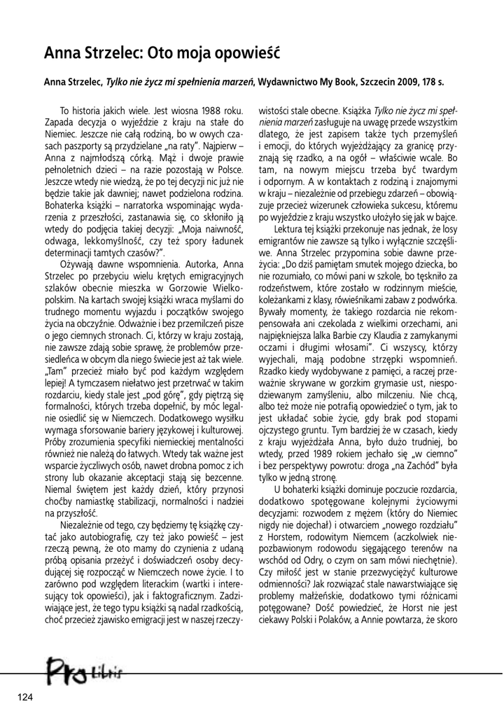 Anna Strzelec: Oto moja opowieść Anna Strzelec, Tylko nie życz mi spełnienia marzeń, Wydawnictwo My Book, Szczecin 2009, 178 s. To historia jakich wiele. Jest wiosna 1988 roku. Zapada decyzja o wyjeździe z kraju na stałe do Niemiec. Jeszcze nie całą rodziną, bo w owych czasach paszporty są przydzielane „na raty”. Najpierw – Anna z najmłodszą córką. Mąż i dwoje prawie pełnoletnich dzieci – na razie pozostają w Polsce. Jeszcze wtedy nie wiedzą, że po tej decyzji nic już nie będzie takie jak dawniej; nawet podzielona rodzina. Bohaterka książki – narratorka wspominając wydarzenia z przeszłości, zastanawia się, co skłoniło ją wtedy do podjęcia takiej decyzji: „Moja naiwność, odwaga, lekkomyślność, czy też spory ładunek determinacji tamtych czasów?”. Ożywają dawne wspomnienia. Autorka, Anna Strzelec po przebyciu wielu krętych emigracyjnych szlaków obecnie mieszka w Gorzowie Wielkopolskim. Na kartach swojej książki wraca myślami do trudnego momentu wyjazdu i początków swojego życia na obczyźnie. Odważnie i bez przemilczeń pisze o jego ciemnych stronach. Ci, którzy w kraju zostają, nie zawsze zdają sobie sprawę, że problemów przesiedleńca w obcym dla niego świecie jest aż tak wiele. „Tam” przecież miało być pod każdym względem lepiej! A tymczasem niełatwo jest przetrwać w takim rozdarciu, kiedy stale jest „pod górę”, gdy piętrzą się formalności, których trzeba dopełnić, by móc legalnie osiedlić się w Niemczech. Dodatkowego wysiłku wymaga sforsowanie bariery językowej i kulturowej. Próby zrozumienia specyfiki niemieckiej mentalności również nie należą do łatwych. Wtedy tak ważne jest wsparcie życzliwych osób, nawet drobna pomoc z ich strony lub okazanie akceptacji stają się bezcenne. Niemal świętem jest każdy dzień, który przynosi choćby namiastkę stabilizacji, normalności i nadziei na przyszłość. Niezależnie od tego, czy będziemy tę książkę czytać jako autobiografię, czy też jako powieść – jest rzeczą pewną, że oto mamy do czynienia z udaną próbą opisania przeżyć i doświadczeń osoby decydującej się rozpocząć w Niemczech nowe życie. I to zarówno pod względem literackim (wartki i interesujący tok opowieści), jak i faktograficznym. Zadziwiające jest, że tego typu książki są nadal rzadkością, choć przecież zjawisko emigracji jest w naszej rzeczy- 124 wistości stale obecne. Książka Tylko nie życz mi spełnienia marzeń zasługuje na uwagę przede wszystkim dlatego, że jest zapisem także tych przemyśleń i emocji, do których wyjeżdżający za granicę przyznają się rzadko, a na ogół – właściwie wcale. Bo tam, na nowym miejscu trzeba być twardym i odpornym. A w kontaktach z rodziną i znajomymi w kraju – niezależnie od przebiegu zdarzeń – obowiązuje przecież wizerunek człowieka sukcesu, któremu po wyjeździe z kraju wszystko ułożyło się jak w bajce. Lektura tej książki przekonuje nas jednak, że losy emigrantów nie zawsze są tylko i wyłącznie szczęśliwe. Anna Strzelec przypomina sobie dawne przeżycia: „Do dziś pamiętam smutek mojego dziecka, bo nie rozumiało, co mówi pani w szkole, bo tęskniło za rodzeństwem, które zostało w rodzinnym mieście, koleżankami z klasy, rówieśnikami zabaw z podwórka. Bywały momenty, że takiego rozdarcia nie rekompensowała ani czekolada z wielkimi orzechami, ani najpiękniejsza lalka Barbie czy Klaudia z zamykanymi oczami i długimi włosami”. Ci wszyscy, którzy wyjechali, mają podobne strzępki wspomnień. Rzadko kiedy wydobywane z pamięci, a raczej przeważnie skrywane w gorzkim grymasie ust, niespodziewanym zamyśleniu, albo milczeniu. Nie chcą, albo też może nie potrafią opowiedzieć o tym, jak to jest układać sobie życie, gdy brak pod stopami ojczystego gruntu. Tym bardziej że w czasach, kiedy z kraju wyjeżdżała Anna, było dużo trudniej, bo wtedy, przed 1989 rokiem jechało się „w ciemno” i bez perspektywy powrotu: droga „na Zachód” była tylko w jedną stronę. U bohaterki książki dominuje poczucie rozdarcia, dodatkowo spotęgowane kolejnymi życiowymi decyzjami: rozwodem z mężem (który do Niemiec nigdy nie dojechał) i otwarciem „nowego rozdziału” z Horstem, rodowitym Niemcem (aczkolwiek niepozbawionym rodowodu sięgającego terenów na wschód od Odry, o czym on sam mówi niechętnie). Czy miłość jest w stanie przezwyciężyć kulturowe odmienności? Jak rozwiązać stale nawarstwiające się problemy małżeńskie, dodatkowo tymi różnicami potęgowane? Dość powiedzieć, że Horst nie jest ciekawy Polski i Polaków, a Annie powtarza, że skoro ona jest jego żoną, to jej dom jest w Niemczech, i to nawet wtedy, gdy jej troje dorosłych dzieci z rodzinami żyje w Polsce, a ona chciałaby w tym życiu aktywnie uczestniczyć. Jak znaleźć w tym wszystkim stabilizację i równowagę? W książce Anny Strzelec znajdziemy także garść spostrzeżeń o tym, jaki Niemcy mają stosunek do Polski i Polaków. Są na przykład zdziwieni „że w Polsce można nie tylko wchodzić do lasu, ale też jeść zebrane leśne owoce bez szkody dla zdrowia”… Rodzice Horsta nie chcą przyjechać do Polski na ślub syna z Anną. Tłumaczą, że ojciec nadal nie może pozbyć się traumatycznych wspomnień wojennych, gdy jako żołnierz walczył niedaleko Königsbergu. Wiele trafnych obserwacji na temat polskiej i niemieckiej mentalności zawiera również ciekawy wątek agencji matrymonialnej, działającej po obu stronach granicy. Można powiedzieć: samo życie, choć dodatkowo komplikowane (ale i wzbogacane) kulturowymi różnicami. Na uwagę zwraca także fakt, iż główna bohaterka, pomimo ogromnego bagażu przeżyć i przeciwności losu, o wszystkim pisze bez goryczy, złości i poczucia krzywdy. Nie kreuje się też na „superkobietę”. Zamiast tego – często kwituje wszystko dozą subtelnego humoru, al
