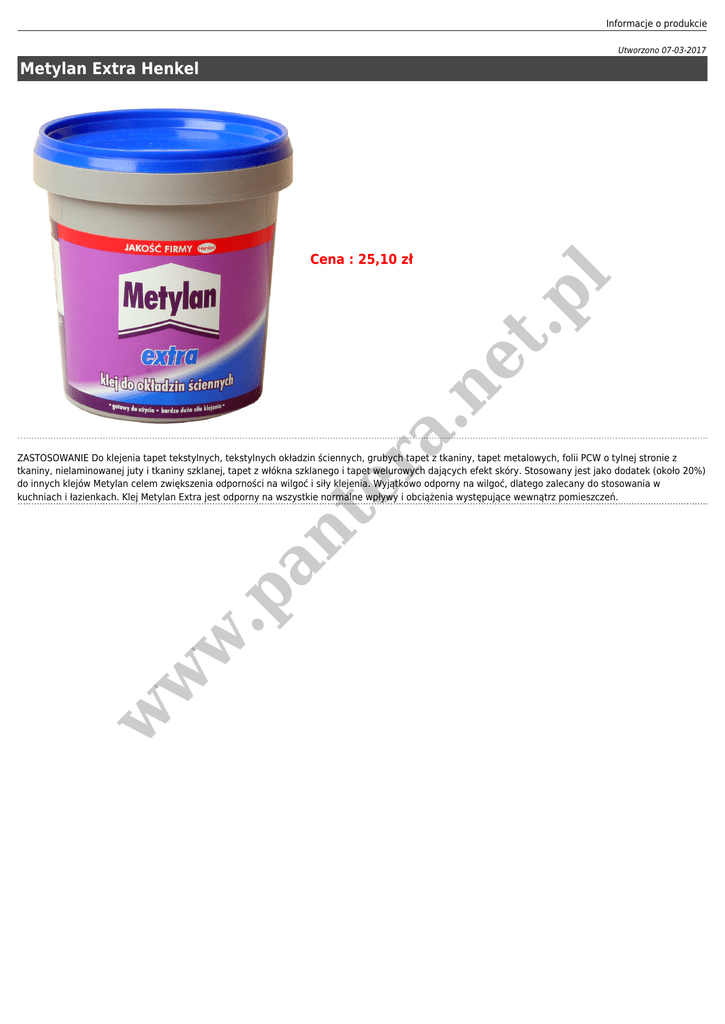 Informacje o produkcie Utworzono 07-03-2017 Metylan Extra Henkel a. ne t .p l Cena : 25,10 zł w w w .p an te r ZASTOSOWANIE Do klejenia tapet tekstylnych, tekstylnych okładzin ściennych, grubych tapet z tkaniny, tapet metalowych, folii PCW o tylnej stronie z tkaniny, nielaminowanej juty i tkaniny szklanej, tapet z włókna szklanego i tapet welurowych dających efekt skóry. Stosowany jest jako dodatek (około 20%) do innych klejów Metylan celem zwiększenia odporności na wilgoć i siły klejenia. Wyjątkowo odporny na wilgoć, dlatego zalecany do stosowania w kuchniach i łazienkach. Klej Metylan Extra jest odporny na wszystkie normalne wpływy i obciążenia występujące wewnątrz pomieszczeń.