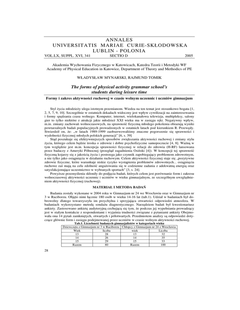 ANNALES UNIVERSITATIS MARIAE CURIE-SKŁODOWSKA LUBLIN - POLONIA VOL.LX, SUPPL. XVI, 341 SECTIO D 2005 Akademia Wychowania Fizycznego w Katowicach, Katedra Teorii i Metodyki WF Academy of Physical Education in Katowice, Department of Theory and Methodics of PE WŁADYSŁAW MYNARSKI, RAJMUND TOMIK The forms of physical activity grammar school’s students during leisure time Formy i zakres aktywności ruchowej w czasie wolnym uczennic i uczniów gimnazjum Styl życia młodzieży ulega istotnym przemianom. Wiedza na ten temat jest stosunkowo bogata [1, 2, 5, 7, 9, 10]. Szczególnie w ostatnich dekadach widoczny jest wpływ cywilizacji na zainteresowania i formy spędzania czasu wolnego. Komputer, internet, wielokanałowa telewizja, multipleksy, salony gier to tylko niektóre z atrakcji jakie młodzież XXI wieku ma w zasięgu ręki. Negatywny wpływ, m.in. zmiany zachowań wolnoczasowych, na sprawność fizyczną młodego pokolenia obrazują wyniki powtarzalnych badań populacyjnych prowadzonych w ostatnich latach pod kierunkiem R. Przewędy. Stwierdził on, że: „w latach 1989-1999 zaobserwowaliśmy znaczne pogorszenie się sprawności i wydolności fizycznej młodych polskich generacji” [6, s. 39] Stąd poszukuje się efektywniejszych sposobów zwiększania aktywności ruchowej i zmiany stylu życia, którego celem będzie troska o zdrowie i dobre psychofizyczne samopoczucie [4, 8]. Ważną w tym względzie jest m.in. koncepcja sprawności fizycznej w relacji do zdrowia (H-RF) lansowana przez badaczy z Ameryki Północnej (przegląd zagadnienia Osiński [4]). W koncepcji tej sprawność fizyczną kojarzy się z jakością życia i postrzega jako czynnik zapobiegający problemom zdrowotnym, a nie tylko jako osiągnięcia w działaniu ruchowym. Celem aktywności fizycznej staje się „pozytywne zdrowie fizyczne, które warunkuje niskie ryzyko wystąpienia problemów zdrowotnych... osiągnięcia ruchowe zaś mają na celu zdolność angażowania się w codzienne zadania z adekwatną energią oraz satysfakcjonujące uczestnictwo w wybranych sportach” [3, s. 24]. Powyższe przemyślenia skłoniły do podjęcia badań, których celem jest porównanie form i zakresu wolnoczasowej aktywności uczennic i uczniów w wieku gimnazjalnym, ze szczególnym uwzględnieniem aktywności fizycznej (ruchowej). MATERIAŁ I METODA BADAŃ Badania zostały wykonane w 2004 roku w Gimnazjum nr 24 we Wrocławiu oraz w Gimnazjum nr 3 w Raciborzu. Objęto nimi łącznie 180 osób w wieku 14-16 lat (tab.1). Udział w badaniach był dobrowolny dlatego towarzyszyła im przychylna i sprzyjająca otwartości odpowiedzi atmosfera. W badaniach wykorzystano metodę sondażu diagnostycznego. Narzędziem badań był kwestionariusz ankiety. Zastosowano ankietę audytoryjną cechującą się tym, że podczas jej wypełniania prowadzący jest w stałym kontakcie z respondentami i wyjaśnia trudności związane z pytaniami ankiety Obejmowała ona 14 pytań zamkniętych, otwartych i półotwartych. Przedmiotem analizy są odpowiedzi dotyczące głównie form i zasięgu podejmowanej przez uczniów w czasie wolnym aktywności ruchowej. Tab.1. Liczebność badanych gimnazjalistów w kategoriach wieku Dziewczęta z Gimnazjum nr 3 w Raciborzu Chłopcy z Gimnazjum nr 24 z Wrocławia Wiek liczba wiek Liczba 13 28 13 32 14 26 14 35 15 29 15 33 Razem 80 Razem 100 28 Wyniki analiz ujęto w wartościach procentowych. W tabelach sumy odsetek są wyższe niż 100%, gdyż ankietowani mogli wybierać jedną lub więcej możliwych odpowiedzi. Frakcje wyboru dla chłopców i dziewcząt weryfikowano przy pomocy testów niezależności. W przypadku gdy liczebność najmniej licznej klasy była większa od 8 stosowano test χ2 Pearsona. Jeśli liczebność najmniej licznej klasy była mniejsza lub równa 8, ale większa od 3, stosowano test χ2 z poprawką Jatesa. Gdy liczebność najmniej licznej klasy był mniejsza lub równa 3 stosowano test dokładny Fishera. Przyjęto, że różnica jest istotna, gdy p<0,05. WYNIKI BADAŃ I DYSKUSJA Pierwsze pytanie kwestionariusza dotyczyło preferowanych form spędzania wolnego czasu. Większość badanych uczniów gimnazjum (71%) najchętniej relaksuje się w czasie wolnym w towarzystwie przyjaciół, uczennice najchętniej słuchają muzyki (62,5%) (tab. 2). Tab. 2. Formy spędzania czasu wolnego Formy spędzania czasu wolnego Czytam książki Czytam prasę Idę do kina Oglądam telewizję Poświęcam czas na ćwiczenia ruchowe Pracuję z komputerem Słucham muzyki Spędzam czas z przyjaciółmi Uczestniczę w zajęciach pozalekcyjnych Dziewczęta Chłopcy Istotność różnicy p 0,304 0,587 0,299 0,519 n 34 18 26 45 % 42,5 22,5 32,5 56,2 n 35 26 40 61 % 35,0 26,0 40,0 61,0 35 43,7 50 50,0 0,409 26 50 41 32,5 62,5 51,2 59 53 71 59,0 53,0 71,0 0,0004* 0,200 0,0066 11 13,7 2 2,0 0,003 Istotne statystycznie różnice dotyczą pracy, a może raczej zabawy na komputerze, spędzania czasu wolnego z przyjaciółmi oraz udziału w zajęciach pozalekcyjnych, co może być związane z różną ofertą edukacyjną szkół w których prowadzono badania. Rekreacją ruchową w wolnym czasie zajmuje się 43,7% dziewcząt i połowa chłopców (różnica nieistotna). Podobne wyniki przedstawia Żak, w populacji krakowskiej ponad 50% chłopców i 30% dziewcząt wieku 12-14 lat (gimnazjalnym) odznacza się wysoką aktywnością ruchową, zaś w latach późniejszych dotyczy to już tylko 15-20% młodzieży [10]. W drugim pytaniu kwestionariusza określono jakie formy aktywności ruchowej preferowane są przez młodzież w czasie wolnym (tab. 3). Najbardziej ulubionymi formami dla dziewcząt są: jazda na rowerze (63,7%) oraz gry sportowe (42,5%), chłopcy również preferują: gry sportowe (71%) (najczęściej wymieniana jest piłka nożna) i jazdę na rowerze (64%). Niewielki odsetek dziewcząt uprawiających fitnesowe form ruchu spowodowany jest zapewne tym, że zajęcia tego typu organizowane są głównie przez prywat