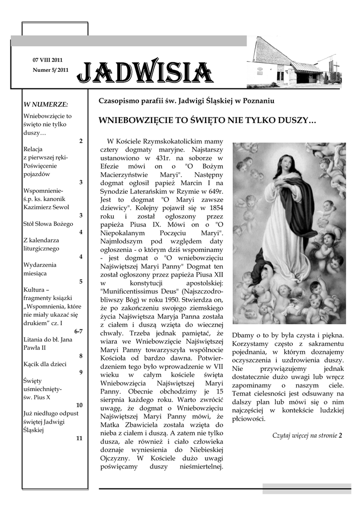 07 VIII 2011 Numer 5/ 2011 JADWISIA Czasopismo parafii św. Jadwigi Śląskiej w Poznaniu W NUMERZE: Wniebowzięcie to święto nie tylko duszy… WNIEBOWZIĘCIE TO ŚWIĘTO NIE TYLKO DUSZY… 2 Relacja z pierwszej rękiPoświęcenie pojazdów 3 Wspomnienieś.p. ks. kanonik Kazimierz Sewol 3 Stół Słowa Bożego 4 Z kalendarza liturgicznego 4 Wydarzenia miesiąca 5 Kultura – fragmenty ksiązki „Wspomnienia, które nie miały ukazać się drukiem” cz. I 6-7 Litania do bł. Jana Pawła II 8 Kącik dla dzieci 9 Święty uśmiechniętyśw. Pius X 10 Już niedługo odpust świętej Jadwigi Śląskiej 11 W Kościele Rzymskokatolickim mamy cztery dogmaty maryjne. Najstarszy ustanowiono w 431r. na soborze w Efezie mówi on o "O Bożym Macierzyństwie Maryi". Następny dogmat ogłosił papież Marcin I na Synodzie Laterańskim w Rzymie w 649r. Jest to dogmat "O Maryi zawsze dziewicy". Kolejny pojawił się w 1854 roku i został ogłoszony przez papieża Piusa IX. Mówi on o "O Niepokalanym Poczęciu Maryi". Najmłodszym pod względem daty ogłoszenia - o którym dziś wspominamy - jest dogmat o "O wniebowzięciu Najświętszej Maryi Panny" Dogmat ten został ogłoszony przez papieża Piusa XII w konstytucji apostolskiej: "Munificentissimus Deus" (Najszczodrobliwszy Bóg) w roku 1950. Stwierdza on, że po zakończeniu swojego ziemskiego życia Najświętsza Maryja Panna została z ciałem i duszą wzięta do wiecznej chwały. Trzeba jednak pamiętać, że wiara we Wniebowzięcie Najświętszej Maryi Panny towarzyszyła wspólnocie Kościoła od bardzo dawna. Potwierdzeniem tego było wprowadzenie w VII wieku w całym kościele święta Wniebowzięcia Najświętszej Maryi Panny. Obecnie obchodzimy je 15 sierpnia każdego roku. Warto zwrócić uwagę, że dogmat o Wniebowzięciu Najświętszej Maryi Panny mówi, że Matka Zbawiciela została wzięta do nieba z ciałem i duszą. A zatem nie tylko dusza, ale również i ciało człowieka doznaje wyniesienia do Niebieskiej Ojczyzny. W Kościele dużo uwagi poświęcamy duszy nieśmiertelnej. Dbamy o to by była czysta i piękna. Korzystamy często z sakramentu pojednania, w którym doznajemy oczyszczenia i uzdrowienia duszy. Nie przywiązujemy jednak dostatecznie dużo uwagi lub wręcz zapominamy o naszym ciele. Temat cielesności jest odsuwany na dalszy plan lub mówi się o nim najczęściej w kontekście ludzkiej płciowości. Czytaj więcej na stronie 2 JADWISIA Strona 2 z 12 WNIEBOWZIĘCIE TO ŚWIĘTO NIE TYLKO DUSZY… - CD. W tej sytuacji problematyką ciała zajmują się najczęściej ludzie, dla których jest ono przedmiotem, materią mniej lub bardziej zniszczoną przez wiek. Ciało człowieka staje się niemalże przedmiotem, który nie podlega głębszej refleksji, czy pracy nad jego popędami i kaprysami. Promuje się ludzi młodych i pięknych, wysportowanych. Ciało przedstawia się jako atrakcyjne, tylko wtedy kiedy jest zdrowe i młode, później nie wywołuje emocji, jak gdyby było czymś wstydliwym. Unika się więc wszystkiego co wiąże się z chorobą i starością, ponieważ to nie odpowiada sposobowi myślenia, który nakazuje brać z życia ile tylko się da, nie dbając o skutki i konsekwencje takiego stylu życia. Człowiek hołduje własnemu ciału. Staje się ono przez wielu uwielbiane i otaczane wielką troską, która ma poprawić piękno fizyczne. W Uroczystość Wniebowzięcia Najświętszej Maryi Panny spróbujmy spojrzeć na nasze ciało jako na świątynie Ducha Świętego pamiętając o tym, że mieszka w nim Bóg. Zadbajmy o nasze ciało nie tylko w wymiarze fizycznym. Pamiętajmy, że wyrażane przez nas słowa, myśli, oceny innych ludzi - niszczą lub udoskonalają nasze ciało. Sposób w jaki traktujemy innych: nienarodzonych, chorych, starszych, dotkniętych różnego rodzaju nałogami jest także przejawem naszego szacunku względem ciała innych ludzi. Dziś tak bardzo rozpowszechnione nieformalne związki, w których młodzi nie podejmują zobowiązań płynących z sakramentu małżeństwa, chcąc jednak korzystać z praw małżeńskich pokazuje, że zapomnieliśmy o wielkiej godności Dzieci Bożych powołanych do świętości. Sposób odnoszenia się do swojego ciała, oraz ciała innych osób pokazuje, że musimy włożyć wiele wysiłku by odbudować szacunek do ciała drugiego człowieka. Na koniec pamiętajmy, że Bóg zbawia całego człowieka - z duszą i ciałem. ks. Jacek Rogalski Jak co roku odbędzie się parafialna piesza pielgrzymka do sanktuarium Matki Bożej w Tulcach. To juz nasza dwudziesta pierwsza wspólna wyprawa do tego miejsca i odbędzie się 3-4 września. Zapisy na salkach duszpasterstwa- 21 i 28 sierpnia (niedziela) po mszach świętych. Szczegóły poznamy w poźniejszym terminie. „Panie przenikasz i znasz mnie, Ty wiesz kiedy siadam i wstaję. Z daleka przenikasz moje zamysły, widzisz moje działanie i mój spoczynek. (...) Zbadaj mnie Panie i poznaj moje serce, doświadcz i poznaj moje troski I zobacz czy jestem na drodze nieprawej i skieruj mnie na drogę odwieczną.” Psalm 139 JADWISIA Strona 3 z 12 RELACJA Z PIERWSZEJ RĘKIPOŚWIĘCENIE POJAZÓW Wyprzedzając o jeden dzień wspomnienie św. Krzysztofa Patrona kierowców w niedzielę 24 lipca br. po Mszy św. kapłani poświęcali nasze pojazdy mechaniczne oraz wszystkich kierowców. Jak każdego roku z racji wspomnienia św. Krzysztofa, który jest patronem wszystkich kierowców kapłani z naszej Parafii po Mszy św. Na godzinę 11.00 poświęcali pojazdy mechaniczne były to przeważnie samochody, ale zdarzyły się też i rowery, motocykle. Od wielu już lat wraz z poświęceniem pojazdów z racji św. Krzysztofa są zbierane ofiary na zakup środków lokomocji potrzebnych misjonarzom do ich pracy na Misjach. Apelujemy do kierowców o bezpieczną, trzeźwą i odpowiedzialną jazdę oraz zachęcamy do wdzięczności Bogu za bezpieczne podróże. WSPOMNIENIEŚ. P. KS. KANONIK KAZIMIERZ SEWOL Kapłan Archidiece