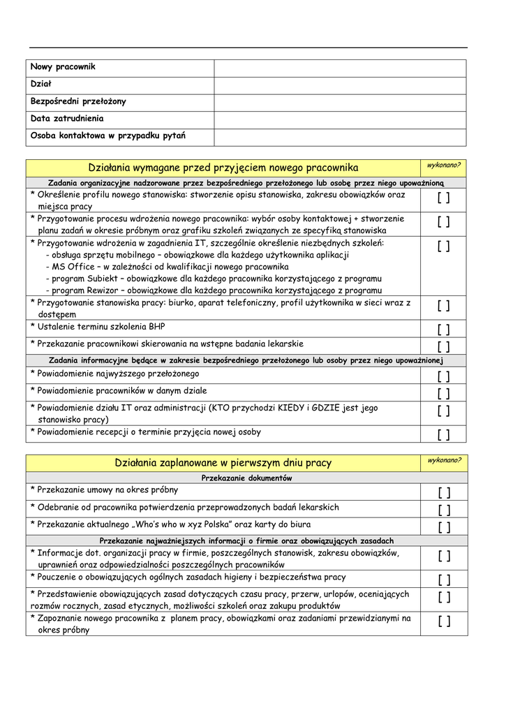 Nowy pracownik Dział Bezpośredni przełożony Data zatrudnienia Osoba kontaktowa w przypadku pytań Działania wymagane przed przyjęciem nowego pracownika wykonano? Zadania organizacyjne nadzorowane przez bezpośredniego przełożonego lub osobę przez niego upoważnioną * Określenie profilu nowego stanowiska: stworzenie opisu stanowiska, zakresu obowiązków oraz miejsca pracy * Przygotowanie procesu wdrożenia nowego pracownika: wybór osoby kontaktowej + stworzenie planu zadań w okresie próbnym oraz grafiku szkoleń związanych ze specyfiką stanowiska * Przygotowanie wdrożenia w zagadnienia IT, szczególnie określenie niezbędnych szkoleń: - obsługa sprzętu mobilnego – obowiązkowe dla każdego użytkownika aplikacji - MS Office – w zależności od kwalifikacji nowego pracownika - program Subiekt – obowiązkowe dla każdego pracownika korzystającego z programu - program Rewizor – obowiązkowe dla każdego pracownika korzystającego z programu * Przygotowanie stanowiska pracy: biurko, aparat telefoniczny, profil użytkownika w sieci wraz z dostępem * Ustalenie terminu szkolenia BHP * Przekazanie pracownikowi skierowania na wstępne badania lekarskie [] [] [] [] [] [] Zadania informacyjne będące w zakresie bezpośredniego przełożonego lub osoby przez niego upoważnionej * Powiadomienie najwyższego przełożonego * Powiadomienie pracowników w danym dziale * Powiadomienie działu IT oraz administracji (KTO przychodzi KIEDY i GDZIE jest jego stanowisko pracy) * Powiadomienie recepcji o terminie przyjęcia nowej osoby Działania zaplanowane w pierwszym dniu pracy [] [] [] [] wykonano? Przekazanie dokumentów * Przekazanie umowy na okres próbny * Odebranie od pracownika potwierdzenia przeprowadzonych badań lekarskich * Przekazanie aktualnego „Who’s who w xyz Polska” oraz karty do biura [] [] [] Przekazanie najważniejszych informacji o firmie oraz obowiązujących zasadach * Informacje dot. organizacji pracy w firmie, poszczególnych stanowisk, zakresu obowiązków, uprawnień oraz odpowiedzialności poszczególnych pracowników * Pouczenie o obowiązujących ogólnych zasadach higieny i bezpieczeństwa pracy * Przedstawienie obowiązujących zasad dotyczących czasu pracy, przerw, urlopów, oceniających rozmów rocznych, zasad etycznych, możliwości szkoleń oraz zakupu produktów * Zapoznanie nowego pracownika z planem pracy, obowiązkami oraz zadaniami przewidzianymi na okres próbny [] [] [] [] Przedstawienie nowego pracownika oraz prezentacja biura * Prezentacja miejsca pracy * Przedstawienie nowego pracownika najwyższemu przełożonemu jak również pozostałym kolegom * Przedstawienie nowej osoby bezpośrednim współpracownikom z którymi będzie miała stały kontakt podczas wykonywania powierzonych zadań * Prezentacja pozostałych pomieszczeń biurowych (kuchnia, toalety) oraz restauracji w biurowcu [] [] [] [] Zadania organizacyjne nadzorowane przez bezpośredniego przełożonego lub osobę przez niego upoważnioną * Przekazanie sprzętu komputerowego stacjonarnego (pracownicy biurowi) * Przekazanie laptopa (w zależności od stanowiska) * Przekazanie sprzętu mobilnego osobom pracującym w terenie * Przekazanie rzutnika * Przekazanie drukarki * Przekazanie Blue-connect * Przekazanie telefonu komórkowego * Przekazanie samochodu służbowego Działania zaplanowane na pierwsze 2 tygodnie pracy [] [] [] [] [] [] [] [] wykonano? Szkolenie nowego pracownika * Zagadnienia IT, przeprowadzenie niezbędnych szkoleń: - obsługa sprzętu mobilnego – obowiązkowe dla każdego użytkownika aplikacji - MS Office – w zależności od kwalifikacji nowego pracownika - program Subiekt – obowiązkowe dla każdego pracownika korzystającego z programu - program Rewizor – obowiązkowe dla każdego pracownika korzystającego z programu * Szkolenie BHP * Pozostałe szkolenia związane ze specyfiką danego stanowiska pracy: - Feedback – wspieranie adaptacji nowego pracownika [] [] [] wykonano? Rozmowy podsumowujące i oceniające przeprowadzane przez bezpośredniego przełożonego * W pierwszych 6 tygodniach pracy: co najmniej jedna rozmowa tygodniowo * Od 7 tygodnia do końca okresu próbnego: oceny kolejnych wykonanych zadań * Rozmowa oceniająca w połowie okresu próbnego * Najpóźniej 2 tygodnie przed końcem okresu próbnego rozmowa podsumowująca i oceniająca pracę oraz postawę nowego pracownika. Przekazanie decyzji o podjęciu lub zaprzestaniu dalszej współpracy. [] [] [] []
