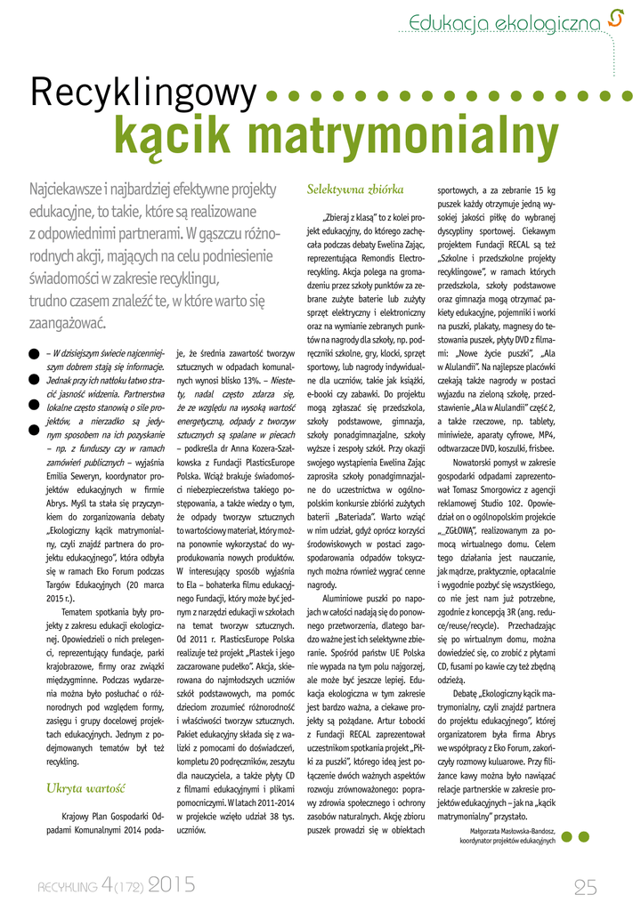 Edukacja ekologiczna Recyklingowy kącik matrymonialny Najciekawsze i najbardziej efektywne projekty edukacyjne, to takie, które są realizowane z odpowiednimi partnerami. W gąszczu różnorodnych akcji, mających na celu podniesienie świadomości w zakresie recyklingu, trudno czasem znaleźć te, w które warto się zaangażować. – W dzisiejszym świecie najcenniejszym dobrem stają się informacje. Jednak przy ich natłoku łatwo stracić jasność widzenia. Partnerstwa lokalne często stanowią o sile projektów, a nierzadko są jedynym sposobem na ich pozyskanie – np. z funduszy czy w ramach zamówień publicznych – wyjaśnia Emilia Seweryn, koordynator projektów edukacyjnych w firmie Abrys. Myśl ta stała się przyczynkiem do zorganizowania debaty „Ekologiczny kącik matrymonialny, czyli znajdź partnera do projektu edukacyjnego”, która odbyła się w ramach Eko Forum podczas Targów Edukacyjnych (20 marca 2015 r.). Tematem spotkania były projekty z zakresu edukacji ekologicznej. Opowiedzieli o nich prelegenci, reprezentujący fundacje, parki krajobrazowe, firmy oraz związki międzygminne. Podczas wydarzenia można było posłuchać o różnorodnych pod względem formy, zasięgu i grupy docelowej projektach edukacyjnych. Jednym z podejmowanych tematów był też recykling. Ukryta wartość Krajowy Plan Gospodarki Odpadami Komunalnymi 2014 poda- RECYKLING je, że średnia zawartość tworzyw sztucznych w odpadach komunalnych wynosi blisko 13%. – Niestety, nadal często zdarza się, że ze względu na wysoką wartość energetyczną, odpady z tworzyw sztucznych są spalane w piecach – podkreśla dr Anna Kozera-Szałkowska z Fundacji PlasticsEurope Polska. Wciąż brakuje świadomości niebezpieczeństwa takiego postępowania, a także wiedzy o tym, że odpady tworzyw sztucznych to wartościowy materiał, który można ponownie wykorzystać do wyprodukowania nowych produktów. W interesujący sposób wyjaśnia to Ela – bohaterka filmu edukacyjnego Fundacji, który może być jednym z narzędzi edukacji w szkołach na temat tworzyw sztucznych. Od 2011 r. PlasticsEurope Polska realizuje też projekt „Plastek i jego zaczarowane pudełko”. Akcja, skierowana do najmłodszych uczniów szkół podstawowych, ma pomóc dzieciom zrozumieć różnorodność i właściwości tworzyw sztucznych. Pakiet edukacyjny składa się z walizki z pomocami do doświadczeń, kompletu 20 podręczników, zeszytu dla nauczyciela, a także płyty CD z filmami edukacyjnymi i plikami pomocniczymi. W latach 2011-2014 w projekcie wzięło udział 38 tys. uczniów. 4(172) 2015 Selektywna zbiórka „Zbieraj z klasą” to z kolei projekt edukacyjny, do którego zachęcała podczas debaty Ewelina Zając, reprezentująca Remondis Electrorecykling. Akcja polega na gromadzeniu przez szkoły punktów za zebrane zużyte baterie lub zużyty sprzęt elektryczny i elektroniczny oraz na wymianie zebranych punktów na nagrody dla szkoły, np. podręczniki szkolne, gry, klocki, sprzęt sportowy, lub nagrody indywidualne dla uczniów, takie jak książki, e-booki czy zabawki. Do projektu mogą zgłaszać się przedszkola, szkoły podstawowe, gimnazja, szkoły ponadgimnazjalne, szkoły wyższe i zespoły szkół. Przy okazji swojego wystąpienia Ewelina Zając zaprosiła szkoły ponadgimnazjalne do uczestnictwa w ogólnopolskim konkursie zbiórki zużytych baterii „Bateriada”. Warto wziąć w nim udział, gdyż oprócz korzyści środowiskowych w postaci zagospodarowania odpadów toksycznych można również wygrać cenne nagrody. Aluminiowe puszki po napojach w całości nadają się do ponownego przetworzenia, dlatego bardzo ważne jest ich selektywne zbieranie. Spośród państw UE Polska nie wypada na tym polu najgorzej, ale może być jeszcze lepiej. Edukacja ekologiczna w tym zakresie jest bardzo ważna, a ciekawe projekty są pożądane. Artur Łobocki z Fundacji RECAL zaprezentował uczestnikom spotkania projekt „Piłki za puszki”, którego ideą jest połączenie dwóch ważnych aspektów rozwoju zrównoważonego: poprawy zdrowia społecznego i ochrony zasobów naturalnych. Akcję zbioru puszek prowadzi się w obiektach sportowych, a za zebranie 15 kg puszek każdy otrzymuje jedną wysokiej jakości piłkę do wybranej dyscypliny sportowej. Ciekawym projektem Fundacji RECAL są też „Szkolne i przedszkolne projekty recyklingowe”, w ramach których przedszkola, szkoły podstawowe oraz gimnazja mogą otrzymać pakiety edukacyjne, pojemniki i worki na puszki, plakaty, magnesy do testowania puszek, płyty DVD z filmami: „Nowe życie puszki”, „Ala w Alulandii”. Na najlepsze placówki czekają także nagrody w postaci wyjazdu na zieloną szkołę, przedstawienie „Ala w Alulandii” część 2, a także rzeczowe, np. tablety, miniwieże, aparaty cyfrowe, MP4, odtwarzacze DVD, koszulki, frisbee. Nowatorski pomysł w zakresie gospodarki odpadami zaprezentował Tomasz Smorgowicz z agencji reklamowej Studio 102. Opowiedział on o ogólnopolskim projekcie „_ZGŁOWĄ”, realizowanym za pomocą wirtualnego domu. Celem tego działania jest nauczanie, jak mądrze, praktycznie, opłacalnie i wygodnie pozbyć się wszystkiego, co nie jest nam już potrzebne, zgodnie z koncepcją 3R (ang. reduce/reuse/recycle). Przechadzając się po wirtualnym domu, można dowiedzieć się, co zrobić z płytami CD, fusami po kawie czy też zbędną odzieżą. Debatę „Ekologiczny kącik matrymonialny, czyli znajdź partnera do projektu edukacyjnego”, której organizatorem była firma Abrys we współpracy z Eko Forum, zakończyły rozmowy kuluarowe. Przy filiżance kawy można było nawiązać relacje partnerskie w zakresie projektów edukacyjnych – jak na „kącik matrymonialny” przystało. Małgorzata Masłowska-Bandosz, koordynator projektów edukacyjnych 25