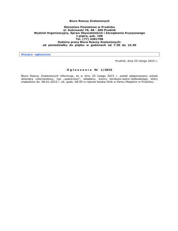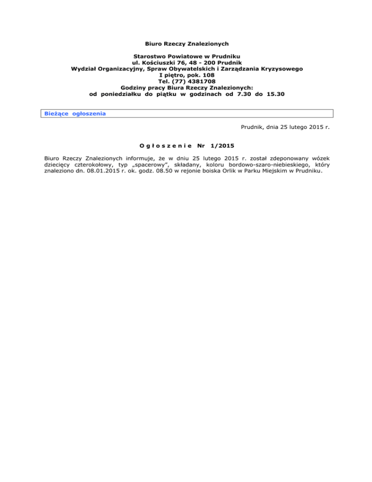 Biuro Rzeczy Znalezionych Starostwo Powiatowe w Prudniku ul. Kościuszki 76, 48 - 200 Prudnik Wydział Organizacyjny, Spraw Obywatelskich i Zarządzania Kryzysowego I piętro, pok. 108 Tel. (77) 4381708 Godziny pracy Biura Rzeczy Znalezionych: od poniedziałku do piątku w godzinach od 7.30 do 15.30 Bieżące ogłoszenia Prudnik, dnia 25 lutego 2015 r. Ogłoszenie Nr 1/2015 Biuro Rzeczy Znalezionych informuje, że w dniu 25 lutego 2015 r. został zdeponowany wózek dziecięcy czterokołowy, typ „spacerowy”, składany, koloru bordowo-szaro-niebieskiego, który znaleziono dn. 08.01.2015 r. ok. godz. 08.50 w rejonie boiska Orlik w Parku Miejskim w Prudniku.