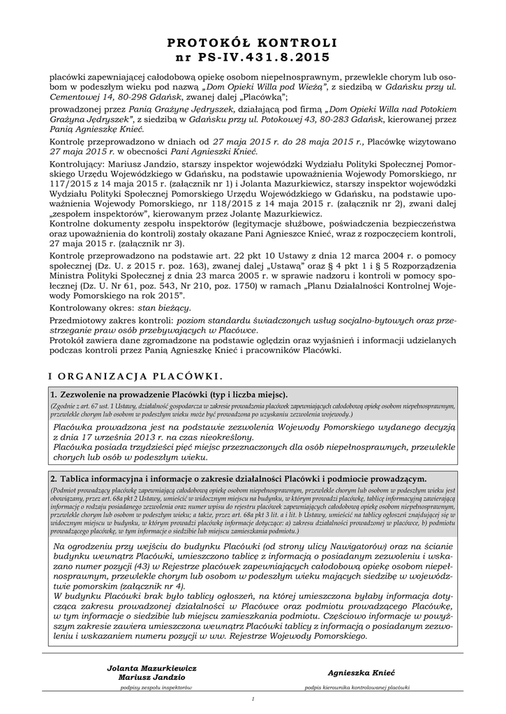 PROTOKÓŁ KONTROLI n r P S - I V . 4 3 1 . 8 . 2015 placówki zapewniającej całodobową opiekę osobom niepełnosprawnym, przewlekle chorym lub osobom w podeszłym wieku pod nazwą „Dom Opieki Willa pod Wieżą”, z siedzibą w Gdańsku przy ul. Cementowej 14, 80-298 Gdańsk, zwanej dalej „Placówką”; prowadzonej przez Panią Grażynę Jędryszek, działającą pod firmą „Dom Opieki Willa nad Potokiem Grażyna Jędryszek”, z siedzibą w Gdańsku przy ul. Potokowej 43, 80-283 Gdańsk, kierowanej przez Panią Agnieszkę Knieć. Kontrolę przeprowadzono w dniach od 27 maja 2015 r. do 28 maja 2015 r., Placówkę wizytowano 27 maja 2015 r. w obecności Pani Agnieszki Knieć. Kontrolujący: Mariusz Jandzio, starszy inspektor wojewódzki Wydziału Polityki Społecznej Pomorskiego Urzędu Wojewódzkiego w Gdańsku, na podstawie upoważnienia Wojewody Pomorskiego, nr 117/2015 z 14 maja 2015 r. (załącznik nr 1) i Jolanta Mazurkiewicz, starszy inspektor wojewódzki Wydziału Polityki Społecznej Pomorskiego Urzędu Wojewódzkiego w Gdańsku, na podstawie upoważnienia Wojewody Pomorskiego, nr 118/2015 z 14 maja 2015 r. (załącznik nr 2), zwani dalej „zespołem inspektorów”, kierowanym przez Jolantę Mazurkiewicz. Kontrolne dokumenty zespołu inspektorów (legitymacje służbowe, poświadczenia bezpieczeństwa oraz upoważnienia do kontroli) zostały okazane Pani Agnieszce Knieć, wraz z rozpoczęciem kontroli, 27 maja 2015 r. (załącznik nr 3). Kontrolę przeprowadzono na podstawie art. 22 pkt 10 Ustawy z dnia 12 marca 2004 r. o pomocy społecznej (Dz. U. z 2015 r. poz. 163), zwanej dalej „Ustawą” oraz § 4 pkt 1 i § 5 Rozporządzenia Ministra Polityki Społecznej z dnia 23 marca 2005 r. w sprawie nadzoru i kontroli w pomocy społecznej (Dz. U. Nr 61, poz. 543, Nr 210, poz. 1750) w ramach „Planu Działalności Kontrolnej Wojewody Pomorskiego na rok 2015”. Kontrolowany okres: stan bieżący. Przedmiotowy zakres kontroli: poziom standardu świadczonych usług socjalno-bytowych oraz przestrzeganie praw osób przebywających w Placówce. Protokół zawiera dane zgromadzone na podstawie oględzin oraz wyjaśnień i informacji udzielanych podczas kontroli przez Panią Agnieszkę Knieć i pracowników Placówki. I ORGANIZACJA PLACÓWKI. 1. Zezwolenie na prowadzenie Placówki (typ i liczba miejsc). (Zgodnie z art. 67 ust. 1 Ustawy, działalność gospodarcza w zakresie prowadzenia placówek zapewniających całodobową opiekę osobom niepełnosprawnym, przewlekle chorym lub osobom w podeszłym wieku może być prowadzona po uzyskaniu zezwolenia wojewody.) Placówka prowadzona jest na podstawie zezwolenia Wojewody Pomorskiego wydanego decyzją z dnia 17 września 2013 r. na czas nieokreślony. Placówka posiada trzydzieści pięć miejsc przeznaczonych dla osób niepełnosprawnych, przewlekle chorych lub osób w podeszłym wieku. 2. Tablica informacyjna i informacje o zakresie działalności Placówki i podmiocie prowadzącym. (Podmiot prowadzący placówkę zapewniającą całodobową opiekę osobom niepełnosprawnym, przewlekle chorym lub osobom w podeszłym wieku jest obowiązany, przez art. 68a pkt 2 Ustawy, umieścić w widocznym miejscu na budynku, w którym prowadzi placówkę, tablicę informacyjną zawierającą informację o rodzaju posiadanego zezwolenia oraz numer wpisu do rejestru placówek zapewniających całodobową opiekę osobom niepełnosprawnym, przewlekle chorym lub osobom w podeszłym wieku; a także, przez art. 68a pkt 3 lit. a i lit. b Ustawy, umieścić na tablicy ogłoszeń znajdującej się w widocznym miejscu w budynku, w którym prowadzi placówkę informacje dotyczące: a) zakresu działalności prowadzonej w placówce, b) podmiotu prowadzącego placówkę, w tym informacje o siedzibie lub miejscu zamieszkania podmiotu.) Na ogrodzeniu przy wejściu do budynku Placówki (od strony ulicy Nawigatorów) oraz na ścianie budynku wewnątrz Placówki, umieszczono tablicę z informacją o posiadanym zezwoleniu i wskazano numer pozycji (43) w Rejestrze placówek zapewniających całodobową opiekę osobom niepełnosprawnym, przewlekle chorym lub osobom w podeszłym wieku mających siedzibę w województwie pomorskim (załącznik nr 4). W budynku Placówki brak było tablicy ogłoszeń, na której umieszczona byłaby informacja dotycząca zakresu prowadzonej działalności w Placówce oraz podmiotu prowadzącego Placówkę, w tym informacje o siedzibie lub miejscu zamieszkania podmiotu. Częściowo informacje w powyższym zakresie zawiera umieszczona wewnątrz Placówki tablicy z informacją o posiadanym zezwoleniu i wskazaniem numeru pozycji w ww. Rejestrze Wojewody Pomorskiego. Jolanta Mazurkiewicz Mariusz Jandzio Agnieszka Knieć podpisy zespołu inspektorów podpis kierownika kontrolowanej placówki 1 Protokół nr PS-IV.431.8.2015 z przeprowadzonej w dniach od 27 maja do 28 maja 2015 r. kontroli standardu świadczonych usług przez placówkę zapewniającą całodobową opiekę osobom niepełnosprawnym, przewlekle chorym lub osobom w podeszłym wieku pod nazwą „Dom Opieki Willa pod Wieżą”, z siedzibą w Gdańsku przy ul. Cementowej 14, 80-298 Gdańsk. Kierująca Placówką zobowiązała się, że niezwłocznie umieszczona zostanie tablica korkowa z pełną informacją w powyższym zakresie na parterze budynku. II USŁUGI BYTOWE. 1. Miejsce pobytu. (Na podstawie art. 68 ust. 1 pkt 2 lit. a Ustawy, opieka w placówce zapewniającej całodobową opiekę osobom niepełnosprawnym, przewlekle chorym lub osobom w podeszłym wieku polega na świadczeniu przez całą dobę usług bytowych zapewniających miejsce pobytu.) 1) budynek i otoczenie Placówki: (Na podstawie art. 68 ust. 4 pkt 1 Ustawy, placówka zapewniająca całodobową opiekę osobom niepełnosprawnym, przewlekle chorym lub osobom w podeszłym wieku polega zapewnia miejsce pobytu w budynku i jego otoczeniu bez barier architektonicznych.) Placówka mieści się w prawym skrzydle trzykond