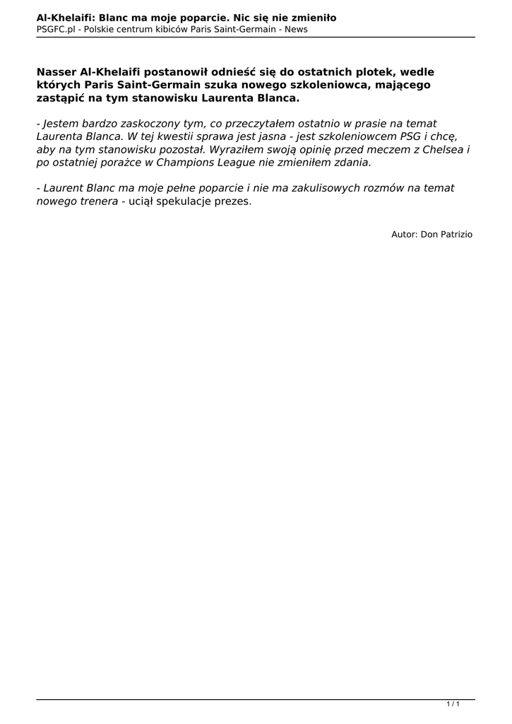 Al-Khelaifi: Blanc ma moje poparcie. Nic się nie zmieniło PSGFC.pl - Polskie centrum kibiców Paris Saint-Germain - News Nasser Al-Khelaifi postanowił odnieść się do ostatnich plotek, wedle których Paris Saint-Germain szuka nowego szkoleniowca, mającego zastąpić na tym stanowisku Laurenta Blanca. - Jestem bardzo zaskoczony tym, co przeczytałem ostatnio w prasie na temat Laurenta Blanca. W tej kwestii sprawa jest jasna - jest szkoleniowcem PSG i chcę, aby na tym stanowisku pozostał. Wyraziłem swoją opinię przed meczem z Chelsea i po ostatniej porażce w Champions League nie zmieniłem zdania. - Laurent Blanc ma moje pełne poparcie i nie ma zakulisowych rozmów na temat nowego trenera - uciął spekulacje prezes. Autor: Don Patrizio 1/1 Powered by TCPDF (www.tcpdf.org)