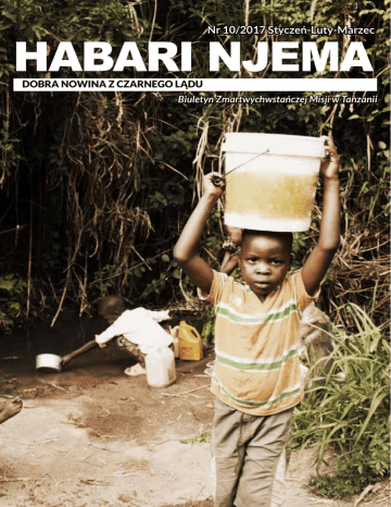 Nr 10/2017 Styczeń-Luty-Marzec Habari Njema Dobra nowina z Czarnego Lądu Biuletyn Zmartwychwstańczej Misji w Tanzanii Habari Njema 1 Od Redakcji 4 Morogoro 6 Buhemba 9 Butiama 11 Aktualności Od Redakcji Rozmaite prognozy noworoczne słychać tu i ówdzie. Dotyczą one przyszłości. Wielu pyta, jaki to będzie rok, czy będzie się nam żyło lepiej, jakie sytuacje przyjdzie nam przeżyć. Takie myślenie nie jest obce naszej Zmartwychwstańczej Misji w Tanzanii. Zawsze dobrze jest planować, troszczyć się o rozwój. W naszym przypadku tyczy on sfery duchowej i fizycznej. Cieszy nas ogromnie, iż w minionym roku udało się nam przy Bożej i ludzkiej pomocy wybudować kościół i budynek seminarium w Morogoro. Nie ukrywamy naszej radości z rozwoju parafii w Butiamie i Buhembie. Cóż tu dużo mówić, jestem przekonany że Bóg hojnie nam błogosławi. Wraz z radościami, są też kłopoty, troski, to wszystko co niesie życie. Bo wszędzie tam gdzie są ludzie tam zawsze muszą być jakieś trudności. Z drugiej strony trudności powinny być zawsze motywujące i zachęcające do podejmowania kolejnych prób tak by wszystko. Przed naszą misją stoją kolejne wyzwania Wy m ó g budowlany w Morogoro zmusza nas do wykończenia projektu budowy domu dla rektora i ojca duchownego. Miałaby mieścić się w nim biblioteka, jadalnia oraz pokój rekreacyjny i kuchnia z prawdziwego zdarzenia. Przewidujemy iż prace rozpoczną się w pierwszym kwartale 2017 roku. W seminarium w Morogoro klerycy studiują na uniwersytecie. Jako iż dom nasz jest nieco na peryferiach, dojeżdżają na uczelnie rowerami, czasem nawet kilka razy dziennie. Zapewne nie jest to łatwe dla nich. Niemniej jednak nie słychać z ich ust narzekania, co więcej, widać staranie i dobre chęci. Przy tej okazji proszę was kochani dobroczyńcy misji o modlitwę w ich intencji oraz ich rektora, czyli ojca Andrzeja Dudy. Są oni przyszłością naszej misji, ale pośrednio nie tylko misji ale i całego zgromadzenia. Na sam koniec proszę o wybaczenie, gdyż mam świadomość, że Habari Njema na chwilkę „zniknęło” z waszych domów. Powód opóźnienia kolejnych numerów był taki, iż zajmowałem się budową seminarium, nie było kiedy usiąść do komputera, złożyć wszystko w całość i podesłać do drukarni. Jestem przekonany, że ten rok będzie inny i pisemko nasze będzie gościć w waszych domach regularnie. Kończąc tych kilka słów wstępu, pragnę wam serdecznie podziękować za każdą modlitwą, oznak pamięci, za każdą pomoc materialną. Nowy rok niech wszystkim nam przyniesie wyjątkowe chwile, niech będzie jednym wielkim cudem B ożej obecności. o. Maciej Braun naczelny 1 HABARI NJEMA Nr 10/2017 Styczeń-Luty-Marzec Od Redakcji Drodzy Przyjaciele i Dobroczyńcy Misji Tanzańskiej Zmartwychwstańców! Pożegnaliśmy bogaty w różne wydarzenia rok 2016. W Kościele powszechnym przeżywaliśmy go w blasku przesłania o miłosiernej miłości Boga, w naszym Zgromadzeniu w duchu dziękczynienia za 160 rocznicę powołania do istnienia Zmartwychwstańców. Był to także rok szczególny dla naszej misji w Tanzanii. Mam tu na myśli początki parafii p.w. św. Jana Pawła II w Buhemba, budowę Seminarium w Morogoro, śluby zakonne 5 Tanzańskich Współbraci. Nowy rok 2017, który rozpoczynamy pod matczyną opieką Bogarodzicy, zapowiada się równie intensywny. Przygotowujemy się do 33 Kapituły Generalnej, która jest najwyższym autorytetem w Zgromadzeniu, troszczy się o duchową odnowę zmartwychwstańców i decyduje o kierunkach rozwoju. Obradować ona będzie w czerwcu 2017 w Rzymie pod hasłem: „Świadkowie obecności Zmartwychwstałego Pana: od wspólnoty do świata”. Przypomnę, że to właśnie po decyzjach 30 Kapituły Generalnej z 1999 roku, rozpoczęliśmy pracę misyjną w Afryce. Przed naszymi Misjonarzami w tym roku stają także nowe wyzwania, o których będą informować w kolejnych wydaniach Biuletynu „Habari Njema”. Jednym z nich jest zmartwychwstańczy wolontariat misyjny, w który zaangażowała się wspólnota nowej ewangelizacji „Galilea”. Papież Franciszek przekazał nam w grudniu swoje przesłanie na 54 Światowy Dzień Modlitw o Powołania, który będzie obchodzony w całym Kościele 7 maja 2017 roku pod hasłem: „Zachęcani przez Ducha do misji”. Ojciec Święty skupił się w nim na misyjnym wymiarze powołania chrześcijańskiego, chcąc jeszcze raz przypomnieć nam podstawową zasadę życia duchowego: „Uczeń, tak naprawdę, nie otrzymuje daru Bożej miłości dla prywatnego pocieszenia (…): on po prostu został dotknięty i przemieniony przez radość z poczucia, że Pan go ukochał, i nie może zatrzymać tego doświadczenia tylko dla siebie”. Taka radość jest zawsze misyjna, bo towarzyszy jej pragnienie niesienia Dobrej Nowiny braciom przez ewangelizację i posługę miłości. Jest oczywiste, że każdy ma – według otrzymanego od Boga osobistego powołania – inną przestrzeń działania. Wszyscy jednak jesteśmy wezwani, by otwierać się na działanie Ducha Bożego, który jest źródłem misji. „Nie ma bowiem – pisze Papież – ani duszpasterstwa powołań, ani misji chrześcijańskiej bez wytrwałej, głębokiej modlitwy”. Dlatego jednym z najistotniejszych naszych zadań jest troska o rozwój osobistej relacji z Jezusem Chrystusem, zwłaszcza w czasie adoracji eucharystycznej. Jest ona nie tylko uprzywilejowanym miejscem spotkania z Bogiem, ale także czasem wołania o nowe powołania kapłańskie, zakonne i misyjne. Zachęcam was, byśmy dziękując Bogu za piękny dar ducha misyjnego, trwali razem także w nowym roku 2017 na HABARI NJEMA Nr 10/2017 Styczeń-Luty-Marzec 2 od redakcji modlitwie za misjonarzy oraz o nowe powołania w Kościele, zwłaszcza kapłańskie i zakonne. Proszę Was również o modlitwę w intencji przygotowań do Kapituły Generalnej Zgromadzenia Zmartwychwstania Pańskiego. Niech Święta 