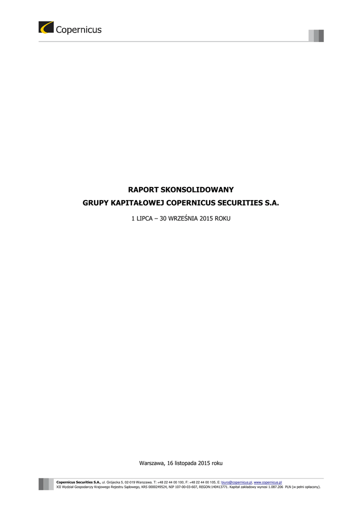 RAPORT SKONSOLIDOWANY GRUPY KAPITAŁOWEJ COPERNICUS SECURITIES S.A. 1 LIPCA – 30 WRZEŚNIA 2015 ROKU Warszawa, 16 listopada 2015 roku Copernicus Securities S.A., ul. Grójecka 5, 02-019 Warszawa. T: +48 22 44 00 100, F: +48 22 44 00 105, E: [email protected], www.copernicus.pl XII Wydział Gospodarczy Krajowego Rejestru Sądowego, KRS 0000249524, NIP 107-00-03-607, REGON:140413771. Kapitał zakładowy wynosi 1.087.206 PLN (w pełni opłacony). SPIS TREŚCI I. Informacje ogólne o Grupie Kapitałowej Copernicus Securities S.A. ................................. 3 1. Podstawowe informacje o Grupie Kapitałowej Copernicus Securities S.A. i Spółkach wchodzących w jej skład. ............................................................................................................................................. 3 2. Skład osobowy organów zarządczych i nadzorczych wchodzących w skład Spółki dominującej ........ 4 3. Struktura Akcjonariatu Spółki dominującej ze wskazaniem Akcjonariuszy posiadających na dzień sporządzenia raportu, co najmniej 5% głosów na Walnym Zgromadzeniu. .......................................... 5 4. Liczba osób zatrudnionych w Grupie Kapitałowej. ................................................................................ 5 II. Dane finansowe Grupy Kapitałowej .................................................................................... 6 1. Bilans Grupy Kapitałowej ....................................................................................................................... 6 2. Rachunek zysków i strat Grupy Kapitałowej ......................................................................................... 7 3. Skonsolidowany rachunek przepływów pieniężnych Grupy Kapitałowej .............................................. 8 4. Zestawienie zmian w skonsolidowanym kapitale własnym Grupy Kapitałowej ..................................... 9 III. Dane finansowe Spółka dominująca ................................................................................... 9 1. Bilans Spółki dominującej .................................................................................................................... 11 2. Rachunek zysków i strat Spółki dominującej ....................................................................................... 12 3. Rachunek przepływów pieniężnych Spółki dominującej ..................................................................... 13 4. Zestawienie zmian w kapitale własnym Spółki dominującej ............................................................... 14 5. Informacja o przyjętych zasadach przy sporządzaniu raportu kwartalnego ........................................ 15 IV. Komentarz Zarządu Spółki dominującej na temat czynników i zdarzeń, które miały wpływ na osiągnięte wyniki finansowe Grupy Kapitałowej .................................................... 15 Dane finansowe Copernicus Capital TFI S.A. ............................................................................................. 16 Kapitały nadzorowane i kapitał wewnętrzny................................................................................................ 16 V. Stanowisko Zarządu Spółki Dominującej dotyczące publikowanych przez Copernicus Securities S.A. prognoz ............................................................................................................ 16 VI. Opis istotnych wydarzeń i osiągnieć w III kwartale 2015 roku ....................................... 16 VII. Oświadczenie Zarządu Spółki dominującej....................................................................... 20 2 I. INFORMACJE OGÓLNE O GRUPIE KAPITAŁOWEJ COPERNICUS SECURITIES S.A. 1. Podstawowe informacje o Grupie Kapitałowej Copernicus Securities S.A. i Spółkach wchodzących w jej skład. Na dzień 30 września 2015 roku w skład Grupy Kapitałowej Copernicus Securities S.A. (dalej: „Grupa Kapitałowa”) wchodzą: Copernicus Securities S.A. (dalej: „Spółka dominująca”) – podmiot dominujący Grupy Kapitałowej, świadczy usługi z zakresu corporate finance, a w szczególności usługi w zakresie pozyskiwania kapitału, doradztwa przy fuzjach i przejęciach, obsługi emisji instrumentów finansowych emitowanych przez spółki publiczne i niepubliczne; Copernicus Capital TFI S.A. – podmiot wyspecjalizowany w zarządzaniu funduszami inwestycyjnymi; MCF Accounting Services Sp. z o.o. – podstawowym przedmiotem działalności Spółki jest działalność rachunkowo – księgowa oraz doradztwo w zakresie prowadzenia działalności gospodarczej i zarządzania; Copernicus Services Sp. z o.o. – podmiot świadczy usługi w zakresie sporządzania wycen i aktywów przedsiębiorstw oraz funduszy; Copernicus Investments Limited – spółka prawa cypryjskiego, której przedmiotem działalności jest oferowanie usług doradztwa finansowego, transakcyjnego oraz kapitałowego, jak również prowadzenie inwestycji kapitałowych. W ramach reorganizacji i uproszczenia działalności Grupy Kapitałowej, Zarząd podjął działania zmierzające do likwidacji tego podmiotu; CC12 Fundusz Inwestycyjny Zamknięty w likwidacji – CC12 FIZ jest funduszem inwestycyjnym Grupy Kapitałowej, za pośrednictwem, którego są prowadzone inwestycje portfelowe w różnego rodzaju aktywa. W ramach reorganizacji i uproszczenia działalności Grupy Kapitałowej, Zarząd podjął działania zmierzające do likwidacji tego podmiotu; CC58 Fundusz Inwestycyjny Zamknięty w likwidacji – CC58 FIZ jest funduszem inwestycyjnym Grupy Kapitałowej, za pośrednictwem, którego są prowadzone inwestycje portfelowe w różnego rodzaju aktywa. W ramach reorganizacji i uproszczenia działalności Grupy Kapitałowej, Zarząd podjął działania zmierzające do likwidacji tego podmiotu; CC55 Fundusz Inwestycyjny Zamknięty w likwidacji – CC55 FIZ jest funduszem inwestycyjnym Grupy Kapitałowej, za po