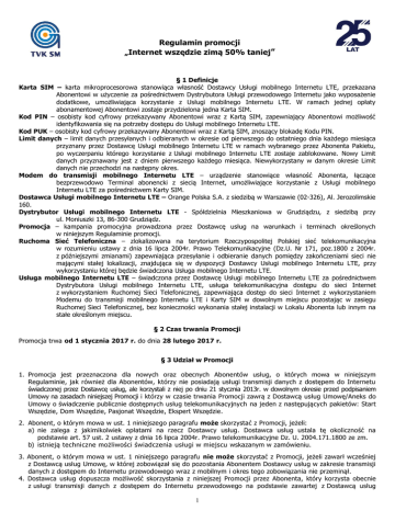 Regulamin promocji „Internet wszędzie zimą 50% taniej” § 1 Definicje Karta SIM – karta mikroprocesorowa stanowiąca własność Dostawcy Usługi mobilnego Internetu LTE, przekazana Abonentowi w użyczenie za pośrednictwem Dystrybutora Usługi przewodowego Internetu jako wyposażenie dodatkowe, umożliwiająca korzystanie z Usługi mobilnego Internetu LTE. W ramach jednej opłaty abonamentowej Abonentowi zostaje przydzielona jedna Karta SIM. Kod PIN – osobisty kod cyfrowy przekazywany Abonentowi wraz z Kartą SIM, zapewniający Abonentowi możliwość identyfikowania się na potrzeby dostępu do Usługi mobilnego Internetu LTE. Kod PUK – osobisty kod cyfrowy przekazywany Abonentowi wraz z Kartą SIM, znoszący blokadę Kodu PIN. Limit danych – limit danych przesyłanych i odbieranych w okresie od pierwszego do ostatniego dnia każdego miesiąca przyznany przez Dostawcę Usługi mobilnego Internetu LTE w ramach wybranego przez Abonenta Pakietu, po wyczerpaniu którego korzystanie z Usługi mobilnego Internetu LTE zostaje zablokowane. Nowy Limit danych przyznawany jest z dniem pierwszego każdego miesiąca. Niewykorzystany w danym okresie Limit danych nie przechodzi na następny okres. Modem do transmisji mobilnego Internetu LTE – urządzenie stanowiące własność Abonenta, łączące bezprzewodowo Terminal abonencki z siecią Internet, umożliwiające korzystanie z Usługi mobilnego Internetu LTE za pośrednictwem Karty SIM. Dostawca Usługi mobilnego Internetu LTE – Orange Polska S.A. z siedzibą w Warszawie (02-326), Al. Jerozolimskie 160. Dystrybutor Usługi mobilnego Internetu LTE - Spółdzielnia Mieszkaniowa w Grudziądzu, z siedzibą przy ul. Moniuszki 13, 86-300 Grudziądz. Promocja – kampania promocyjna prowadzona przez Dostawcę usług na warunkach i terminach określonych w niniejszym Regulaminie promocji. Ruchoma Sieć Telefoniczna – zlokalizowana na terytorium Rzeczypospolitej Polskiej sieć telekomunikacyjna w rozumieniu ustawy z dnia 16 lipca 2004r. Prawo Telekomunikacyjne (Dz.U. Nr 171, poz.1800 z 2004r. z późniejszymi zmianami) zapewniająca przesyłanie i odbieranie danych pomiędzy zakończeniami sieci nie mającymi stałej lokalizacji, znajdująca się w dyspozycji Dostawcy Usługi mobilnego Internetu LTE, przy wykorzystaniu której będzie świadczona Usługa mobilnego Internetu LTE. Usługa mobilnego Internetu LTE – świadczona przez Dostawcę Usługi mobilnego Internetu LTE za pośrednictwem Dystrybutora Usługi mobilnego Internetu LTE, usługa telekomunikacyjna dostępu do sieci Internet z wykorzystaniem Ruchomej Sieci Telefonicznej, zapewniająca dostęp do sieci Internet z wykorzystaniem Modemu do transmisji mobilnego Internetu LTE i Karty SIM w dowolnym miejscu pozostając w zasięgu Ruchomej Sieci Telefonicznej, bez konieczności wykonania stałej instalacji w Lokalu Abonenta lub innym na stałe określonym miejscu. § 2 Czas trwania Promocji Promocja trwa od 1 stycznia 2017 r. do dnia 28 lutego 2017 r. § 3 Udział w Promocji 1. Promocja jest przeznaczona dla nowych oraz obecnych Abonentów usług, o których mowa w niniejszym Regulaminie, jak również dla Abonentów, którzy nie posiadają usługi transmisji danych z dostępem do Internetu świadczonej przez Dostawcę usług, ale korzystali z niej po dniu 21 stycznia 2013r. w dowolnym okresie przed podpisaniem Umowy na zasadach niniejszej Promocji i którzy w czasie trwania Promocji zawrą z Dostawcą usług Umowę/Aneks do Umowy o świadczenie publicznie dostępnych usług telekomunikacyjnych na jeden z następujących pakietów: Start Wszędzie, Dom Wszędzie, Pasjonat Wszędzie, Ekspert Wszędzie. 2. Abonent, o którym mowa w ust. 1 niniejszego paragrafu może skorzystać z Promocji, jeżeli: a) nie zalega z jakimikolwiek opłatami na rzecz Dostawcy usług. Dostawca usług ustala tę okoliczność na podstawie art. 57 ust. 2 ustawy z dnia 16 lipca 2004r. Prawo telekomunikacyjne Dz. U. 2004.171.1800 ze zm. b) istnieją techniczne możliwości świadczenia usługi w miejscu wskazanym w zamówieniu. 3. Abonent, o którym mowa w ust. 1 niniejszego paragrafu nie może skorzystać z Promocji, jeżeli zawarł wcześniej z Dostawcą usług Umowę, w której zobowiązał się do pozostania Abonentem Dostawcy usług w zakresie transmisji danych z dostępem do Internetu przewodowego wraz z mobilnym i okres tego zobowiązania nie przeminął. 4. Dostawca usług dopuszcza możliwość skorzystania z niniejszej Promocji przez Abonenta, który korzysta obecnie z usługi transmisji danych z dostępem do Internetu przewodowego na podstawie zawartej z Dostawcą usług 1 Umowy, w której zobowiązał się do pozostania Abonentem Dostawcy usług i okres tego zobowiązania nie przeminął, tylko w przypadku wybrania przez niego wskazanego w § 4 ust. 1 wariantu II (jeżeli termin zobowiązania ostatniej Umowy wynosił 23 lub 24 pełne miesiące) lub wariantu III (jeżeli termin zobowiązania ostatniej Umowy wynosił minimum 23 pełne miesiące). W takim przypadku zmieniona usługa, po uprzednim zawarciu Aneksu do Umowy w Promocji, będzie świadczona w cenie właściwej dla wybranego pakietu określonego w § 4 ust. 1, zaś zmiana pakietu nastąpi z pierwszym dniem następnego miesiąca. Abonent zobowiązany będzie do uiszczenia jednorazowej opłaty za zmianę pakietu w wysokości 14,90 zł. § 4 Korzyści dla Abonenta Korzyści w Promocji dla wszystkich jej Uczestników spełniających warunki określone w § 3 niniejszego Regulaminu: 1. Wysokość miesięcznej opłaty abonamentowej za korzystanie z usługi transmisji danych z dostępem do Internetu wynosić będzie odpowiednio: WARIANT I – umowa na 12 pełnych miesięcy, dla Abonentów wskazanych w § 3 Dostęp do Internetu Prędkość transmisji pobierania danych Prędkość transmisji wysyłania danych START WSZĘDZIE przewodowy do 50 Mb/s do 1 Mb/s bez limitu mobilny standard LTE standard LTE 3 GB DOM WSZĘDZIE przewodowy do 100 Mb/s do 1 