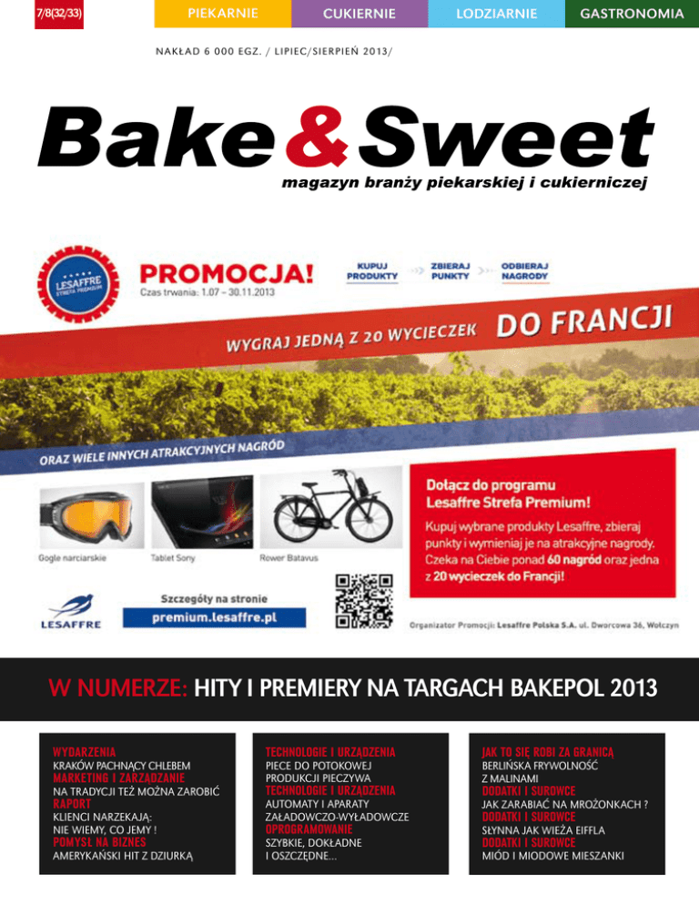 piekarnie 7/8(32/33) CUKIERNIE LODZIARNIE gastronomia N A K Ł A D 6 0 0 0 EG Z . / l ipiec /sierpień 2013/ w numerze: HITY I PREMIERY NA TARGACH BAKEPOL 2013 WYDARZENIA KRAKÓW PACHNĄCY CHLEBEM MARKETING I ZARZĄDZANIE NA TRADYCJI TEŻ MOŻNA ZAROBIĆ RAPORT KLIENCI NARZEKAJĄ: NIE WIEMY, CO JEMY ! POMYSŁ NA BIZNES AMERYKAŃSKI HIT Z DZIURKĄ TECHNOLOGIE I URZĄDZENIA JAK TO SIĘ ROBI ZA GRANICĄ TECHNOLOGIE I URZĄDZENIA DODATKI I SUROWCE PIECE DO POTOKOWEJ PRODUKCJI PIECZYWA AUTOMATY I APARATY ZAŁADOWCZO-WYŁADOWCZE OPROGRAMOWANIE SZYBKIE, DOKŁADNE I OSZCZĘDNE… BERLIŃSKA FRYWOLNOŚĆ Z MALINAMI JAK ZARABIAĆ NA MROŻONKACH ? DODATKI I SUROWCE SŁYNNA JAK WIEŻA EIFFLA DODATKI I SUROWCE MIÓD I MIODOWE MIESZANKI 2 · BAKE&SWEET · 2013/7/8 (32/33) 2013/7/8 (32/33) · BAKE&SWEET · 3 w numerze 7/8 (32/33) jak to się robi za granicą b&S BUSINESS NEWS Ludzie sukcesu W skrócie Jubileuszowe lody wydarzenia 54Sowiecki barok i magiczny Charlottengrad 56 Berlińska frywolność z malinami 8 10 Nasze dziedzictwo o smaku chleba i ciast Kraków pachnący chlebem marketing i zarządzanie Na tradycji też można zarobić Współczesne praktyki zakupowe 31 Termometr prawdę ci powie 32Piece do potokowej produkcji pieczywa 37Pomocnik piecowego 40Chłodne szafy, zimne komory 43Przesiewanie podwyższa jakość mąki 6 14 18 Klienci narzekają: nie wiemy, co jemy! pomysł na biznes 25 technologie i urządzenia Nowości targowe Bakepol pod znakiem nowości raport 20 28 Amerykański hit z dziurką 4 · BAKE&SWEET · 2013/7/8 (32/33) 44 dodatki i surowce 58 Jak zarabiać na mrożonkach? 63Słynna jak Wieża Eiffla 66 Nie ma tortu bez migdałów 68Pożyteczne Lactobacillus 70 Miód jest za drogi dla cukierników 72 Miody za korzystną cenę Higiena 74 Wypiekanie w czystości nowości targowe oprogramowanie 50Szybkie, dokładne, oszczędne… 76Co nowego w Lublinie? www.bakeandsweet.pl W ydawca BCM Biznes Sp. z o.o. ul. 30 Stycznia 42, 83-110 Tczew tel. centrali 58 530 23 11 Tomasz Przysiężny redaktor naczelny e-mail: [email protected] www.bakeandsweet.pl reklama Małgorzata Chajrewicz [email protected] Przed nami okres wakacyjno-urlopowy. Z pewnością nie dla lodziarzy, którzy w najbliższych tygodniach będą musieli zarobić tyle, aby im wystarczyło na „chude” zimowe miesiące. Mamy jednak nadzieję, że większość z Was, drodzy Czytelnicy, znajdzie w lipcu i sierpniu choć chwilę czasu, aby wypocząć po trudach codziennej pracy. My również będziemy odpoczywać, dlatego też (jak co roku o tej porze) do Waszych rąk trafia właśnie podwójny, lipcowo-sierpniowy numer Bake & Sweet. Na jego łamach piszemy m.in. o tym, że chociaż bagietki z pewnością nigdy nie będą w Polsce tak popularnym pieczywem, jakim są we Francji (str. 63), to jednak warto bliżej się zastanowić nad ich produkcją, bo popyt na nie jest jednak w naszym kraju całkiem spory. Zwłaszcza, że piekarze dają konsumentom coraz większy wybór tego pieczywa, wypiekając je z różnych ciast o różnych smakach. A wybierać mają z czego, gdyż na rynku zaopatrzenia naszej branży nie brakuje gotowych mieszanek piekarskich dedykowanych rzemieślniczej lub półprzemysłowej produkcji bagietek. Mieszanki są również do donutów (str. 25), lecz w przypadku tego produktu może warto samemu poeksperymentować? Oczywiście wyłącznie ze smakiem ciastek lub ich dekorowaniem, bo kształt i forma obowiązkowo muszą pozostać takie same, czyli… okrągłe z dziurką. Także i owe donuty w naszym kraju raczej nie będą hitem, lecz z uwagi na to, że niewielu producentów robi ciastka rzemieślniczymi metodami, może warto wzbogacić swoją cukierniczą ofertę o ten właśnie produkt. Zwłaszcza, że donuty sprzedawane w marketach sieciowych to „przemysłówka” i da się je zjeść tylko raz. Przez pomyłkę. Sporo miejsca w tym wydaniu Bake & Sweet poświęcamy też nowościom, które zostaną zaprezentowane podczas wrześniowych targów Bakepol (str. 44-49 oraz 77-81). Przypominamy, że od tego roku impreza ta będzie organizowana w Lublinie, a nie jak w poprzednich latach w Kielcach. Życząc Wam słonecznej pogody i samych miłych wakacyjnych wrażeń, pozostaje nam mieć nadzieję, że już wkrótce spotkamy się na targowym stoisku miesięcznika Bake & Sweet, na które zapraszamy od 7 do 10 września. Redakcja [email protected] Redaktor naczelny Tomasz Przysiężny [email protected] sekretarz redakcji Sylwia Modzelewska [email protected] Dziennik arze Irena Muszałowska [email protected] Janusz Bekas [email protected] współpracownicy Wojciech Osiński (Berlin) [email protected] Dział graficzny DTP Katarzyna Łukowicz [email protected] Dział prenumerat y [email protected] Foto na okładce: Fot. Lesaffre 2013/7/8 (32/33) · BAKE&SWEET · 5 b&S BUSINESS NEWS Polsk a Ogólnopolskie święto w Radomiu Trwają przygotowania do jubileuszowych obchodów V Ogólnopolskiego Święta Chleba. Impreza ta, połączona z XV Świętem Chleba w Radomiu, zorganizowana zostanie 1 września 2013 na terenie Muzeum Wsi Radomskiej (a nie w Lublinie, jak błędnie podaliśmy w czerwcowym Bake & Sweet). Obie imprezy finansowane będą z Funduszu Promocji Ziarna Zbóż i Przetworów Zbożowych. Zwycięski chleb z Balvitenu Na początku czerwca podczas warszawskich targów Gluten Free Expo ogłoszono wyniki internetowego konkursu na najsmaczniejsze pieczywo bezglutenowe roku 2013, który zorganizowało Polskie Stowarzyszenie Osób z Celiakią i na Diecie Bezglutenowej. W głosowaniu wzięło udział blisko 1000 osób. W kategorii Pieczywo Tradycyjne za najlepszy uznali oni Chleb Królewski Supreme (producent Balviten), który wyprzedził Chleb Wiejski Brązowy Smak Życia (Ultraeuropa) i Chleb Wiejski Jasny (Balviten). Wyróżnienie za Kołacz Poznański trafiło do firmy Glutenex. Gigantyczna kremówka Piekarze z Rzeszowa kolejny raz uczcili rocznicę Jana Pawła II i przygotowali gigantyczna kremówkę, która miała a