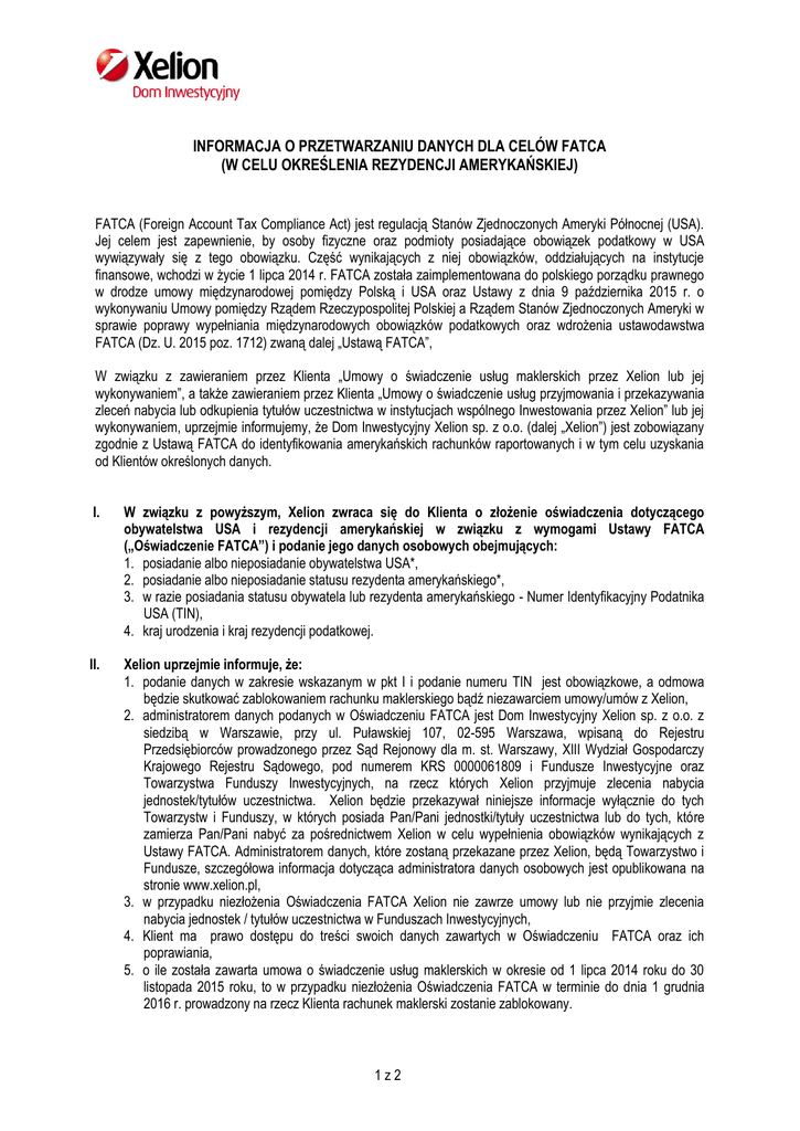 INFORMACJA O PRZETWARZANIU DANYCH DLA CELÓW FATCA (W CELU OKREŚLENIA REZYDENCJI AMERYKAŃSKIEJ) FATCA (Foreign Account Tax Compliance Act) jest regulacją Stanów Zjednoczonych Ameryki Północnej (USA). Jej celem jest zapewnienie, by osoby fizyczne oraz podmioty posiadające obowiązek podatkowy w USA wywiązywały się z tego obowiązku. Część wynikających z niej obowiązków, oddziałujących na instytucje finansowe, wchodzi w życie 1 lipca 2014 r. FATCA została zaimplementowana do polskiego porządku prawnego w drodze umowy międzynarodowej pomiędzy Polską i USA oraz Ustawy z dnia 9 października 2015 r. o wykonywaniu Umowy pomiędzy Rządem Rzeczypospolitej Polskiej a Rządem Stanów Zjednoczonych Ameryki w sprawie poprawy wypełniania międzynarodowych obowiązków podatkowych oraz wdrożenia ustawodawstwa FATCA (Dz. U. 2015 poz. 1712) zwaną dalej „Ustawą FATCA”, W związku z zawieraniem przez Klienta „Umowy o świadczenie usług maklerskich przez Xelion lub jej wykonywaniem”, a także zawieraniem przez Klienta „Umowy o świadczenie usług przyjmowania i przekazywania zleceń nabycia lub odkupienia tytułów uczestnictwa w instytucjach wspólnego Inwestowania przez Xelion” lub jej wykonywaniem, uprzejmie informujemy, że Dom Inwestycyjny Xelion sp. z o.o. (dalej „Xelion”) jest zobowiązany zgodnie z Ustawą FATCA do identyfikowania amerykańskich rachunków raportowanych i w tym celu uzyskania od Klientów określonych danych. I. W związku z powyższym, Xelion zwraca się do Klienta o złożenie oświadczenia dotyczącego obywatelstwa USA i rezydencji amerykańskiej w związku z wymogami Ustawy FATCA („Oświadczenie FATCA”) i podanie jego danych osobowych obejmujących: 1. posiadanie albo nieposiadanie obywatelstwa USA*, 2. posiadanie albo nieposiadanie statusu rezydenta amerykańskiego*, 3. w razie posiadania statusu obywatela lub rezydenta amerykańskiego - Numer Identyfikacyjny Podatnika USA (TIN), 4. kraj urodzenia i kraj rezydencji podatkowej. II. Xelion uprzejmie informuje, że: 1. podanie danych w zakresie wskazanym w pkt I i podanie numeru TIN jest obowiązkowe, a odmowa będzie skutkować zablokowaniem rachunku maklerskiego bądź niezawarciem umowy/umów z Xelion, 2. administratorem danych podanych w Oświadczeniu FATCA jest Dom Inwestycyjny Xelion sp. z o.o. z siedzibą w Warszawie, przy ul. Puławskiej 107, 02-595 Warszawa, wpisaną do Rejestru Przedsiębiorców prowadzonego przez Sąd Rejonowy dla m. st. Warszawy, XIII Wydział Gospodarczy Krajowego Rejestru Sądowego, pod numerem KRS 0000061809 i Fundusze Inwestycyjne oraz Towarzystwa Funduszy Inwestycyjnych, na rzecz których Xelion przyjmuje zlecenia nabycia jednostek/tytułów uczestnictwa. Xelion będzie przekazywał niniejsze informacje wyłącznie do tych Towarzystw i Funduszy, w których posiada Pan/Pani jednostki/tytuły uczestnictwa lub do tych, które zamierza Pan/Pani nabyć za pośrednictwem Xelion w celu wypełnienia obowiązków wynikających z Ustawy FATCA. Administratorem danych, które zostaną przekazane przez Xelion, będą Towarzystwo i Fundusze, szczegółowa informacja dotycząca administratora danych osobowych jest opublikowana na stronie www.xelion.pl, 3. w przypadku niezłożenia Oświadczenia FATCA Xelion nie zawrze umowy lub nie przyjmie zlecenia nabycia jednostek / tytułów uczestnictwa w Funduszach Inwestycyjnych, 4. Klient ma prawo dostępu do treści swoich danych zawartych w Oświadczeniu FATCA oraz ich poprawiania, 5. o ile została zawarta umowa o świadczenie usług maklerskich w okresie od 1 lipca 2014 roku do 30 listopada 2015 roku, to w przypadku niezłożenia Oświadczenia FATCA w terminie do dnia 1 grudnia 2016 r. prowadzony na rzecz Klienta rachunek maklerski zostanie zablokowany. 1z2 III. Xelion informuje ponadto, iż: 1. złożenie Oświadczenia FATCA następuje pod rygorem odpowiedzialności karnej za składanie fałszywych zeznań, 2. jeśli w przyszłości, w trakcie trwania umowy z Xelion zajdą zmiany powodujące nieaktualność złożonych oświadczeń, Klient powinien niezwłocznie złożyć Xelion aktualne oświadczenia w tym zakresie oraz o możliwej konieczności dostarczenia dodatkowych dokumentów w celu weryfikacji wiarygodności tego oświadczenia. W przypadku uchybienia temu obowiązkowi Klient przyjmuje do wiadomości, że będzie traktowany jak obywatel USA lub rezydent amerykański dla celów Ustawy FATCA. * - Obywatel lub rezydent amerykański – w odniesieniu do osób fizycznych - jest to osoba, która spełnia co najmniej jeden z poniższych warunków: 1) jest obywatelem USA (włączając w to osobę fizyczną, która urodziła się w USA, ale nie przebywa w USA – tzw. nabycie obywatelstwa USA przez urodzenie w USA), 2) zgodnie z prawem USA jest stałym rezydentem w USA (ang.: is a Lawful Permanent Resident of the United States), 3) zgodnie z prawem imigracyjnym USA otrzymała prawo stałej rezydencji w USA podczas wjazdu do USA lub w innych okolicznościach (tzw. „zielona karta”), 4) spełnia test długości pobytu w USA – tzn.: a. przebywa w USA przez co najmniej 31 dni w ciągu bieżącego roku i jednocześnie, b. liczba dni, w których przebywała ona na terenie Stanów Zjednoczonych w ciągu bieżącego roku i 2 poprzednich lat kalendarzowych wynosi co najmniej 183 dni. Ustalając wspomnianą liczbę dni pobytu należy zastosować następującą zasadę: do liczby dni przebywania w USA w bieżącym roku należy dodać jedną trzecią liczbę dni przebywania w USA w poprzednim roku kalendarzowym i jedną szóstą liczbę dni przebywania w USA w roku kalendarzowym poprzedzającym rok poprzedni (tzn. sprzed 2 lat). Wyjątki od powyższej reguły. Rezydentem amerykańskim nie jest osoba fizyczna, która spełnia co najmniej jeden z poniższych warunków: a. przebywa w USA czasowo jako dyplomata innego państwa, przedstawiciel innego rządu, pracownik organizacji międzynarodowej na podstawie wizy typu: A lub G, 