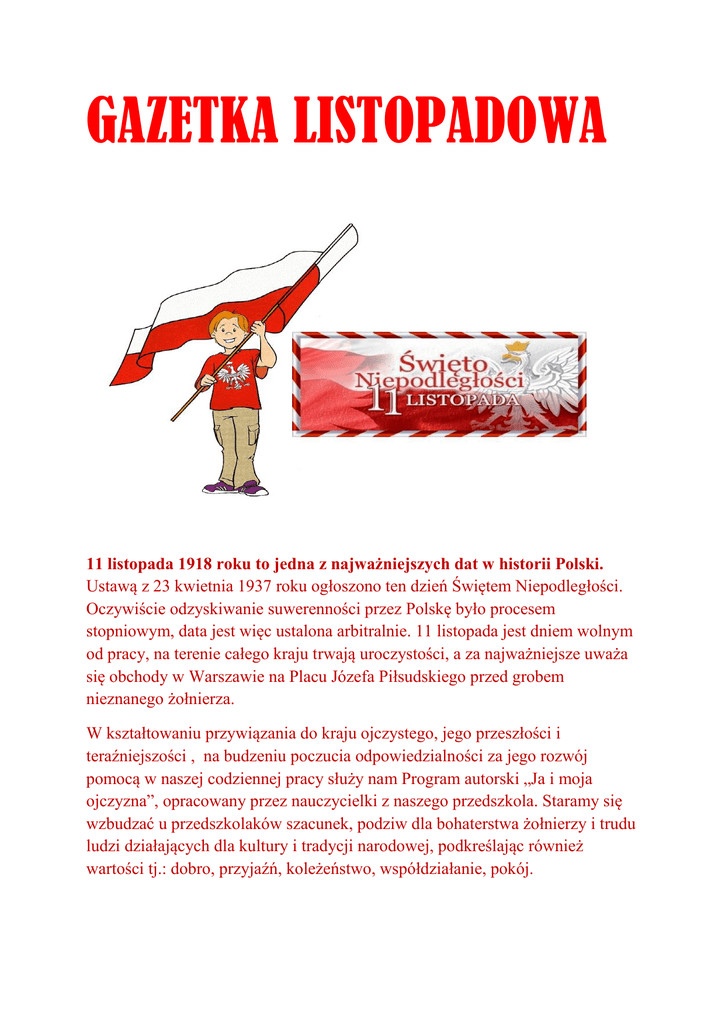 GAZETKA LISTOPADOWA 11 listopada 1918 roku to jedna z najważniejszych dat w historii Polski. Ustawą z 23 kwietnia 1937 roku ogłoszono ten dzień Świętem Niepodległości. Oczywiście odzyskiwanie suwerenności przez Polskę było procesem stopniowym, data jest więc ustalona arbitralnie. 11 listopada jest dniem wolnym od pracy, na terenie całego kraju trwają uroczystości, a za najważniejsze uważa się obchody w Warszawie na Placu Józefa Piłsudskiego przed grobem nieznanego żołnierza. W kształtowaniu przywiązania do kraju ojczystego, jego przeszłości i teraźniejszości , na budzeniu poczucia odpowiedzialności za jego rozwój pomocą w naszej codziennej pracy służy nam Program autorski „Ja i moja ojczyzna”, opracowany przez nauczycielki z naszego przedszkola. Staramy się wzbudzać u przedszkolaków szacunek, podziw dla bohaterstwa żołnierzy i trudu ludzi działających dla kultury i tradycji narodowej, podkreślając również wartości tj.: dobro, przyjaźń, koleżeństwo, współdziałanie, pokój. W naszym przedszkolu rozwijamy uczucia patriotyczne dziecka w wieku przedszkolnym poprzez wzmacnianie więzi z rodziną, towarzyszami zabaw, najbliższym otoczeniem społecznym i przyrodniczym. „Polska to wszystko co sercu drogie, dlatego drogie, bo „swoje” – pisał Leopold Staff w wierszu pt.: „Co to jest Polska ?” . Należy podkreślić, że małe dziecko swoją postawę patriotyczną kształtuje poznając swoją ulicę, swoje miasto. Od rzeczy i spraw najbliższych, do dostrzegania i rozumienia tego, co ważne dla całego kraju. Kształtowanie pojęcia „Polak” zaczyna się od rozumienia tego, że mieszkamy na tym samym terytorium, mówimy tym samym językiem, łączy nas wspólny symbol – Orzeł Biały i biało-czerwona flaga. Od nas dorosłych zależy, w jakie duchowe bogactwa wyposażymy nasze dzieci, czy pójdą w dalsze życie z optymizmem, czy zaszczepimy im przywiązanie do środowiska, w którym wzrastają, czy wpoimy im podstawy pozytywnych zachowań społecznych. Pamiętajmy o tym, że wychowując przekazujemy dzieciom część swoich postaw i przekonań, „część siebie”. Do dziś w wielu przedszkolach nauczyciele uczą wierszyka Władysława Bełzy „Katechizm polskiego dziecka”. Ten wiersz stanowi, jak gdyby pierwsze potwierdzenie przynależności narodowej, wyznanie polskości. Uroczysta akademia pt. ,,Polak mały” z okazji Dnia Niepodległości w naszym przedszkolu odbędzie się 09 listopada o godz. 10.00 w gr. „Jagódek”. Jesień to czas, podczas którego najchętniej zaszylibyśmy się w domu z kubkiem ulubionej herbaty i nadrabiali zaległości książkowe lub telewizyjne. Zadanie utrudnia się wtedy, gdy mamy dziecko i coraz częściej wymaga ono naszej uwagi. Kiedy wracamy wspomnieniami do czasów naszego dzieciństwa, jako najwspanialsze wspominamy wcale nie te chwile, które spędziliśmy na oglądaniu bajek, ale te, które spędzaliśmy wspólnie z rodziną. Zabawy na świeżym powietrzu, wypady na sanki zimą, czy rower latem – to świetne pomysły na zajęcie nudzącego się malucha. Zabawy z dzieckiem to czas radosny, pełen wielu ciekawych odkryć i jednocześnie pełny dziecięcego uśmiechu. To naturalne, że Wasze dziecko potrzebuje zabawy, która jest nieodłącznym elementem jego rozwoju, pasji do odkrywania świata, a zarazem chęci kontaktu z innymi dziećmi w okolicy. Aby jednak mieć pewność, że wybrane zabawy z dzieckiem zaangażują Waszego malucha na dobre, najpierw warto dowiedzieć się, co lubi i jakie aktywności preferuje. Jeśli zauważyliście, że Wasze dziecko uwielbia jesienne spacery po parku, możecie zaproponować mu zabawę polegającą na wykonaniu sesji zdjęciowej lub spacer podczas, którego dziecko odkryje zakamarki przyrody. Ponadto bardzo istotne jest to, aby mieć na uwadze wiek dziecka, do którego należy dostosować zabawę. << Najpopularniejsze zabawy z dzieckiem >> Jako rodzice zdążyliście już zauważyć, jakie zabawy z dzieckiem pozwalają mu się odprężyć i absorbują mnóstwo energii. Doskonale wiecie, co rozbawia Wasze ukochane oczko w głowie i jesteście w stanie zająć go na dłuższy czas określoną czynnością. 1. Zabawa w udawanie odgłosów zwierząt – Dzieci uwielbiają poznawać rzeczywistość z uśmiechem, a jeśli były w ZOO na pewno lubią zwierzątka i chciałyby przebywać wśród nich jak najczęściej. Taka propozycja na pewno bardzo ucieszy Twoje dziecko i świetnie nadaje się dla dzieci. 2. Zabawa w odgadywanie nazw części ciała – Jak nie trudno się domyślić, głównym celem jest nauka, a zarazem poznawanie własnego ciała, dlatego najlepszym rozwiązaniem jest to, aby zaproponować tą zabawę dzieciom. Można to połączyć z higieną ciała i wykorzystać, jeśli na przykład dziecko nie lubi, gdy nakładasz mu krem na skórę. Na chwilę poprzez interesujące opowieści możesz odwrócić jego uwagę. 3. Masa solna – Sprawdzi się świetnie i wspomaga kreatywność Twojego dziecka, ułatwiając mu tworzenie rozmaitych figurek. Jej atutem jest nie tylko satysfakcja z możliwości stworzenia czegoś fajnego, ale również to, że możemy pomalować gotowe prace i stworzyć z nich dekoracje do pokoiku dziecka, co na pewno bardzo je ucieszy i sprawi, że poczuje się prawdziwie docenionym artystą. 4. Zabawa w sklep – Dedykowana oczywiście starszym dzieciom (szczególnie dziewczynkom), które wciągnie na dłuższy czas. Jeśli chcesz zająć czymś ciekawym swojego malucha zaproponuj mu takie rozwiązanie, a na pewno odpłaci słodziutkim uśmiechem. 5. Ciasto – plasto – To kolejna porcja kreatywności dla Twojego wesołka. Możesz kupić gotowy i profesjonalny zestaw ciastoliny lub zdecydować się na podarowanie dziecku klasycznej plasteliny i foremek, które masz w domu. 6. Gra w memory – Nie pozostaje tajemnicą, że jest uwielbiana przez dzieci. Gdy zaproponujesz ją swojemu dziecku po śniadaniu, 