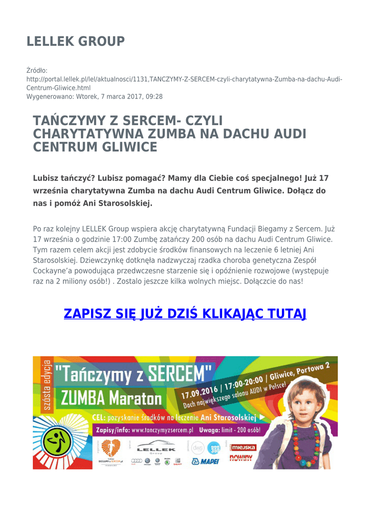 LELLEK GROUP Źródło: http://portal.lellek.pl/lel/aktualnosci/1131,TANCZYMY-Z-SERCEM-czyli-charytatywna-Zumba-na-dachu-AudiCentrum-Gliwice.html Wygenerowano: Wtorek, 7 marca 2017, 09:28 TAŃCZYMY Z SERCEM- CZYLI CHARYTATYWNA ZUMBA NA DACHU AUDI CENTRUM GLIWICE Lubisz tańczyć? Lubisz pomagać? Mamy dla Ciebie coś specjalnego! Już 17 września charytatywna Zumba na dachu Audi Centrum Gliwice. Dołącz do nas i pomóż Ani Starosolskiej. Po raz kolejny LELLEK Group wspiera akcję charytatywną Fundacji Biegamy z Sercem. Już 17 września o godzinie 17:00 Zumbę zatańczy 200 osób na dachu Audi Centrum Gliwice. Tym razem celem akcji jest zdobycie środków finansowych na leczenie 6 letniej Ani Starosolskiej. Dziewczynkę dotknęła nadzwyczaj rzadka choroba genetyczna Zespół Cockayne’a powodująca przedwczesne starzenie się i opóźnienie rozwojowe (występuje raz na 2 miliony osób!) . Zostalo jeszcze kilka wolnych miejsc. Dołączcie do nas! ZAPISZ SIĘ JUŻ DZIŚ KLIKAJĄC TUTAJ Tweetnij