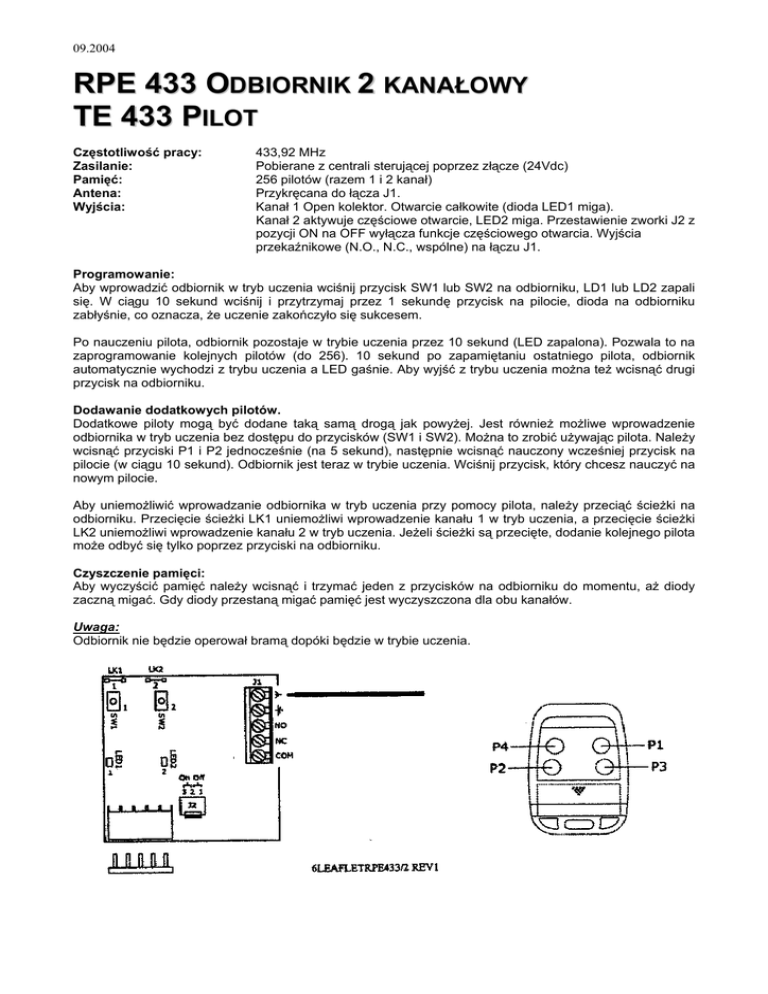 09.2004 RPE 433 ODBIORNIK 2 KANAŁOWY TE 433 PILOT Częstotliwość pracy: Zasilanie: Pamięć: Antena: Wyjścia: 433,92 MHz Pobierane z centrali sterującej poprzez złącze (24Vdc) 256 pilotów (razem 1 i 2 kanał) Przykręcana do łącza J1. Kanał 1 Open kolektor. Otwarcie całkowite (dioda LED1 miga). Kanał 2 aktywuje częściowe otwarcie, LED2 miga. Przestawienie zworki J2 z pozycji ON na OFF wyłącza funkcje częściowego otwarcia. Wyjścia przekaźnikowe (N.O., N.C., wspólne) na łączu J1. Programowanie: Aby wprowadzić odbiornik w tryb uczenia wciśnij przycisk SW1 lub SW2 na odbiorniku, LD1 lub LD2 zapali się. W ciągu 10 sekund wciśnij i przytrzymaj przez 1 sekundę przycisk na pilocie, dioda na odbiorniku zabłyśnie, co oznacza, że uczenie zakończyło się sukcesem. Po nauczeniu pilota, odbiornik pozostaje w trybie uczenia przez 10 sekund (LED zapalona). Pozwala to na zaprogramowanie kolejnych pilotów (do 256). 10 sekund po zapamiętaniu ostatniego pilota, odbiornik automatycznie wychodzi z trybu uczenia a LED gaśnie. Aby wyjść z trybu uczenia można też wcisnąć drugi przycisk na odbiorniku. Dodawanie dodatkowych pilotów. Dodatkowe piloty mogą być dodane taką samą drogą jak powyżej. Jest również możliwe wprowadzenie odbiornika w tryb uczenia bez dostępu do przycisków (SW1 i SW2). Można to zrobić używając pilota. Należy wcisnąć przyciski P1 i P2 jednocześnie (na 5 sekund), następnie wcisnąć nauczony wcześniej przycisk na pilocie (w ciągu 10 sekund). Odbiornik jest teraz w trybie uczenia. Wciśnij przycisk, który chcesz nauczyć na nowym pilocie. Aby uniemożliwić wprowadzanie odbiornika w tryb uczenia przy pomocy pilota, należy przeciąć ścieżki na odbiorniku. Przecięcie ścieżki LK1 uniemożliwi wprowadzenie kanału 1 w tryb uczenia, a przecięcie ścieżki LK2 uniemożliwi wprowadzenie kanału 2 w tryb uczenia. Jeżeli ścieżki są przecięte, dodanie kolejnego pilota może odbyć się tylko poprzez przyciski na odbiorniku. Czyszczenie pamięci: Aby wyczyścić pamięć należy wcisnąć i trzymać jeden z przycisków na odbiorniku do momentu, aż diody zaczną migać. Gdy diody przestaną migać pamięć jest wyczyszczona dla obu kanałów. Uwaga: Odbiornik nie będzie operował bramą dopóki będzie w trybie uczenia.