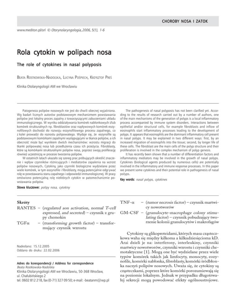Rostkowska-Nadolska www.mediton.pl Otorynolaryngologia, B., Poœpiech L., Preœ2006, K.: Rola 5(1), cytokin 11-17 w polipach nosa CHOROBY NOSA I ZATOK 1 www.mediton.pl/orl Otorynolaryngologia, 2006, 5(1), 1-6 Rola cytokin w polipach nosa The role of cytokines in nasal polyposis BEATA ROSTKOWSKA-NADOLSKA, LUCYNA POŒPIECH, KRZYSZTOF PREŒ Klinika Otolaryngologii AM we Wroc³awiu Patogeneza polipów nosowych nie jest do chwili obecnej wyjaœniona. Wg badañ licznych autorów podstawowym mechanizmem powstawania polipów jest lokalny proces zapalny z towarzysz¹cymi zaburzeniami uk³adu immunologicznego. W wyniku oddzia³ywania komórek nab³onkowych i/lub komórek strukturalnych np. fibroblastów oraz nap³ywowych komórek eozynofilowych dochodzi do rozwoju eozynofilowego procesu zapalnego, co z kolei prowadzi do rozrostu polipowatego. Wydaje siê, ¿e eozynofile s¹ podstawowymi komórkami zapalnymi wystêpuj¹cymi w tkance polipów, a ich obecnoœæ mo¿e byæ wynikiem dwóch mechanizmów: wzrostu migracji do tkanki polipowatej nosa lub przed³u¿enia czasu ich prze¿ycia. Fibroblasty, które s¹ komórkami strukturalnymi polipów nosa, poprzez swoj¹ proliferacjê równie¿ uczestnicz¹ w procesie tworzenia polipów. W ostatnich latach ukaza³o siê szereg prac próbuj¹cych okreœliæ znaczenie i wp³yw czynników ró¿nicuj¹cych i mediatorów zapalenia na wzrost polipów nosowych.. Cytokiny, jako czynniki biologiczne wydzielane przez wiele komórek, w tym eozynofile i fibroblasty, mog¹ potencjalnie odgr ywaæ rolê w powstawaniu stanu zapalnego i odpowiedzi immunologicznej. W pracy omówiono potencjaln¹ rolê niektórych cytokin w patomechanizmie powstawania polipów. The pathogenesis of nasal polyposis has not been clarified yet. According to the results of research carried out by a number of authors, one of the main mechanisms of the generation of polyps is a local inflammatory process accompanied by immune system disorders. Interactions between epithelial and/or structural cells, for example fibroblasts and inflow of eosinophils start inflammatory processes leading to the development of polyps. It appears that eosinophils are the dominant inflammatory cell present in nasal polyps. It may be explained in two different ways: first, by an increased migration of eosinophils into the tissue; second, by longer life of these cells. The fibroblast are the main cells of the polyp structure and their proliferation is involved in the complex mechanism of polyp genesis. It has recently been shown that a number of differentiation factors and inflammatory mediators may be involved in the growth of nasal polyps. Cytokines (biological agents produced by numerous cells) are potentially involved in the inflammatory and immune response processes. In this paper we present some cytokines and their potential role in pathogenesis of nasal polyps. Key words: nasal polyps, cytokines S³owa kluczowe: polipy nosa, cytokiny Skróty RANTES – (regulated aon activation, normal T-cell expressed, and secreted) – czynnik z grupy chemokin TGFα – (transforming growth factor) – transformuj¹cy czynnik wzrostu Nades³ano: 15.12.2005 Oddano do druku: 22.02.2006 Adres do korespondencji / Address for correspondence Beata Rostkowska-Nadolska Klinika Otolaryngologii AM we Wroc³awiu, 50-368 Wroc³aw, ul. Cha³ubiñskiego 2 tel. 0602 812 218, fax (0-71) 327 09 50; e-mail: [email protected] – (tumor necrosis factor ) – czynnik martwicy nowotworów GM-CSF – (granulocyte-macrophage colony stimulating factor) – czynnik pobudzaj¹cy tworzenie kolonii granulocytów i makrofagów TNF-α Cytokiny s¹ glikoproteidami, których masa cz¹steczkowa waha siê miêdzy kilkoma a kilkudziesiêcioma kD. Arai dzieli je na: interferony, interleukiny, czynniki martwicy nowotworów, czynniki wzrostu i czynniki chemotaktyczne [1]. Mog¹ one byæ wydzielane przez wiele typów komórek takich jak limfocyty, monocyty, eozynofile, komórki nab³onka, fibroblasty, komórki œródb³onka naczyñ polipów nosowych. Uwa¿a siê, ¿e cytokiny s¹ cz¹steczkami, poprzez które komórki porozumiewaj¹ siê na poziomie lokalnym. Jednak w przypadku d³ugotrwa³ej sekrecji mog¹ powodowaæ efekty ogólnoustrojowe. Otorynolaryngologia, 2006, 5(1), 1-6 2 Tabela I. Zawartoœæ badanych cytokin w tkankach polipów nosowych wg ró¿nych autorów Rodzaj cytokiny IL1 Poziom badanej cytokiny w tkankach polipów nosowych w porównaniu z prawid³ow¹ b³on¹ œluzow¹ Autor > = IL-beta wiêksza od alfa < > — > = w tk. polipów alerg. i infekc. Lee [ILβ] [1998], Hamilos [ILβ] [1998] Mullol [ILβ] [1995] Rudack [1998] Bachert [ILβ] [1997] Allen [1997] Bachert [1997] Lee [1998], Bachert [1997], Min [1997] Min [1997] IL5 > = w tk. polipów alerg. i infekc. Rudack [1998], Allen [1997], Bachert [1997], Min [1997], Lee [1998], Hamilos [1998] Min [1997], Hamilos [1998] IL6 = > Bachert [1997], Davidson [1996], Takizawa [1997] Mullol [1995], Rudack [1998], Lee [1998] IL8 > = = Lee [1998] Bachert [1997] Bachert [1997] > > > > po stymulacji = > = niski poziom Davidson [1996] Lee [1998] Lee [1999], Davidson [1996], Hamilos [1998], Allen [1998], Bartels [1997], Beck [1996] Matsukura [1998], Teran [1997], Saji [2000] Bachert [1997], Shin [2000] Ohno [1991], Hamilos [1998], Allen [1997] Bachert [1997], Vancheri [1991] TNF-α = > Bachert [1997] Hamilos [1996] TGF-β Eotaxin > TgF-β2 > > po stymulacji > Eisma [1997], Lee [1998] Bartels [1997], Shin [2000] Nonaka [1999] Bartels [1997] IL3 IL4 IL10 IL12 IFN-γ Rantes GM-CSF Mcp-3 > – podwy¿szony poziom badanej cytokiny w tkankach polipów nosowych w porównaniu do prawid³owej b³ony œluzowej = – równy lub podobny poziom badanej cytokiny w tkankach polipów nosowych w porównaniu do prawid³owej b³ony œluzowej < – obni¿ony poziom badanej cytokiny w tkankach polipów nosowych w porównaniu do prawid³owej b³ony œluzowej — – badana cytokina nie wykrywalna ani w tkankach polipów, ani w kontroli Najc
