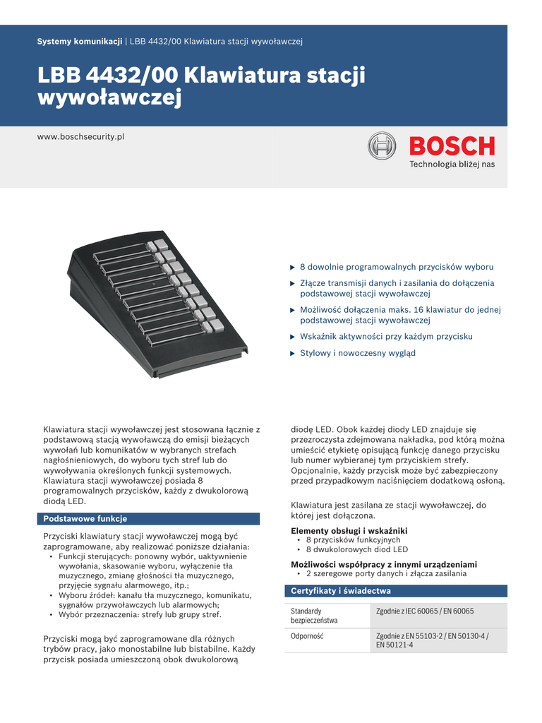 Systemy komunikacji | LBB 4432/00 Klawiatura stacji wywoławczej LBB 4432/00 Klawiatura stacji wywoławczej www.boschsecurity.pl Klawiatura stacji wywoławczej jest stosowana łącznie z podstawową stacją wywoławczą do emisji bieżących wywołań lub komunikatów w wybranych strefach nagłośnieniowych, do wyboru tych stref lub do wywoływania określonych funkcji systemowych. Klawiatura stacji wywoławczej posiada 8 programowalnych przycisków, każdy z dwukolorową diodą LED. Podstawowe funkcje Przyciski klawiatury stacji wywoławczej mogą być zaprogramowane, aby realizować poniższe działania: • Funkcji sterujących: ponowny wybór, uaktywnienie wywołania, skasowanie wyboru, wyłączenie tła muzycznego, zmianę głośności tła muzycznego, przyjęcie sygnału alarmowego, itp.; • Wyboru źródeł: kanału tła muzycznego, komunikatu, sygnałów przywoławczych lub alarmowych; • Wybór przeznaczenia: strefy lub grupy stref. Przyciski mogą być zaprogramowane dla różnych trybów pracy, jako monostabilne lub bistabilne. Każdy przycisk posiada umieszczoną obok dwukolorową u 8 dowolnie programowalnych przycisków wyboru u Złącze transmisji danych i zasilania do dołączenia podstawowej stacji wywoławczej u Możliwość dołączenia maks. 16 klawiatur do jednej podstawowej stacji wywoławczej u Wskaźnik aktywności przy każdym przycisku u Stylowy i nowoczesny wygląd diodę LED. Obok każdej diody LED znajduje się przezroczysta zdejmowana nakładka, pod którą można umieścić etykietę opisującą funkcję danego przycisku lub numer wybieranej tym przyciskiem strefy. Opcjonalnie, każdy przycisk może być zabezpieczony przed przypadkowym naciśnięciem dodatkową osłoną. Klawiatura jest zasilana ze stacji wywoławczej, do której jest dołączona. Elementy obsługi i wskaźniki • 8 przycisków funkcyjnych • 8 dwukolorowych diod LED Możliwości współpracy z innymi urządzeniami • 2 szeregowe porty danych i złącza zasilania Certyfikaty i świadectwa Standardy bezpieczeństwa Zgodnie z IEC 60065 / EN 60065 Odporność Zgodnie z EN 55103‑2 / EN 50130‑4 / EN 50121‑4 2 | LBB 4432/00 Klawiatura stacji wywoławczej Emisja Zgodnie z EN 55103-1 / FCC-47 część 15B Ostrzeganie Zgodnie z EN 60849 / EN 54‑16 / ISO 7240‑16 Środowisko morskie Zgodnie z IEC 60945 Region Certyfikacja Europa CE CPD Polska CNBOP Dołączone części Ilość Element 1 Klawiatura stacji wywoławczej LBB 4432/00 1 Kabel płaski 1 Wspornik sprzęgający 1 Zestaw etykiet Dane techniczne Parametry elektryczne Pobór mocy 1,5 W (DC) Parametry mechaniczne Wymiary (wys. x szer. x gł.) 70 x 95 x 200 mm Ciężar 0,3 kg Montaż Na wsporniku do stacji wywoławczej lub innej klawiatury Kolor Grafitowy Parametry środowiskowe Temperatura pracy -5°C ÷ +45°C Temperatura przechowywania -20°C ÷ +70°C Wilgotność 15% - 90% Ciśnienie atmosferyczne 600 - 1100 hPa Zamówienia - informacje LBB 4432/00 Klawiatura stacji wywoławczej posiada osiem programowanych przycisków, każdy z dwukolorową diodą LED stanu. Numer zamówienia LBB4432/00 Sprzęt LBB 4436/00 Zestaw osłon przycisków (10 szt.) 10 osłon przycisków i 10 zapasowych soczewek Numer zamówienia LBB4436/00 3 | LBB 4432/00 Klawiatura stacji wywoławczej Reprezentowana przez: Poland Robert Bosch Sp. z o.o. Jutrzenki 105 str. 02-231 Warszawa Phone: +48 22 715 4101 Fax: +48 22 715 4105 [email protected] www.boschsecurity.pl © Robert Bosch Sp. z o.o./ Security Systems 2012 | Zastrzega się możliwość wprowadzania zmian 1870697995 | pl, V4, 24. Lis 2012