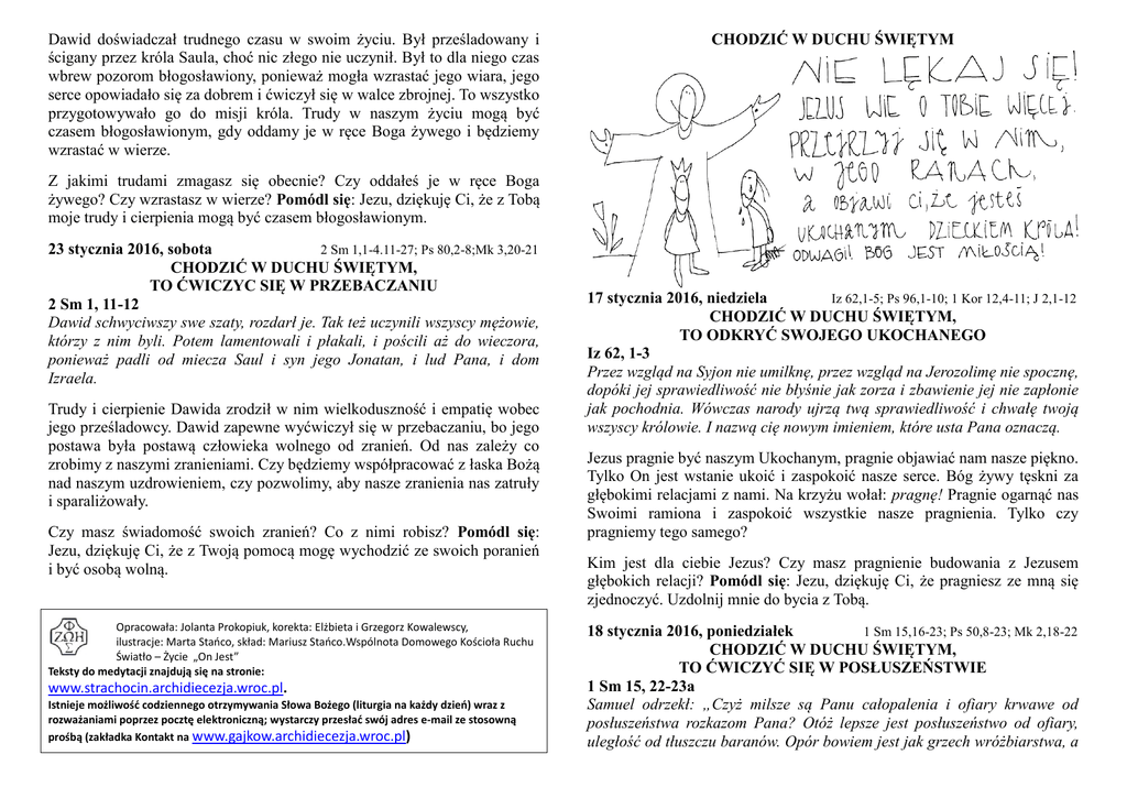 Dawid doświadczał trudnego czasu w swoim życiu. Był prześladowany i ścigany przez króla Saula, choć nic złego nie uczynił. Był to dla niego czas wbrew pozorom błogosławiony, ponieważ mogła wzrastać jego wiara, jego serce opowiadało się za dobrem i ćwiczył się w walce zbrojnej. To wszystko przygotowywało go do misji króla. Trudy w naszym życiu mogą być czasem błogosławionym, gdy oddamy je w ręce Boga żywego i będziemy wzrastać w wierze. CHODZIĆ W DUCHU ŚWIĘTYM Z jakimi trudami zmagasz się obecnie? Czy oddałeś je w ręce Boga żywego? Czy wzrastasz w wierze? Pomódl się: Jezu, dziękuję Ci, że z Tobą moje trudy i cierpienia mogą być czasem błogosławionym. 23 stycznia 2016, sobota 2 Sm 1,1-4.11-27; Ps 80,2-8;Mk 3,20-21 CHODZIĆ W DUCHU ŚWIĘTYM, TO ĆWICZYC SIĘ W PRZEBACZANIU 2 Sm 1, 11-12 Dawid schwyciwszy swe szaty, rozdarł je. Tak też uczynili wszyscy mężowie, którzy z nim byli. Potem lamentowali i płakali, i pościli aż do wieczora, ponieważ padli od miecza Saul i syn jego Jonatan, i lud Pana, i dom Izraela. Trudy i cierpienie Dawida zrodził w nim wielkoduszność i empatię wobec jego prześladowcy. Dawid zapewne wyćwiczył się w przebaczaniu, bo jego postawa była postawą człowieka wolnego od zranień. Od nas zależy co zrobimy z naszymi zranieniami. Czy będziemy współpracować z łaska Bożą nad naszym uzdrowieniem, czy pozwolimy, aby nasze zranienia nas zatruły i sparaliżowały. Czy masz świadomość swoich zranień? Co z nimi robisz? Pomódl się: Jezu, dziękuję Ci, że z Twoją pomocą mogę wychodzić ze swoich poranień i być osobą wolną. Opracowała: Jolanta Prokopiuk, korekta: Elżbieta i Grzegorz Kowalewscy, ilustracje: Marta Stańco, skład: Mariusz Stańco.Wspólnota Domowego Kościoła Ruchu Światło – Życie „On Jest” Teksty do medytacji znajdują się na stronie: www.strachocin.archidiecezja.wroc.pl. Istnieje możliwość codziennego otrzymywania Słowa Bożego (liturgia na każdy dzień) wraz z rozważaniami poprzez pocztę elektroniczną; wystarczy przesłać swój adres e-mail ze stosowną prośbą (zakładka Kontakt na www.gajkow.archidiecezja.wroc.pl) 17 stycznia 2016, niedziela Iz 62,1-5; Ps 96,1-10; 1 Kor 12,4-11; J 2,1-12 CHODZIĆ W DUCHU ŚWIĘTYM, TO ODKRYĆ SWOJEGO UKOCHANEGO Iz 62, 1-3 Przez wzgląd na Syjon nie umilknę, przez wzgląd na Jerozolimę nie spocznę, dopóki jej sprawiedliwość nie błyśnie jak zorza i zbawienie jej nie zapłonie jak pochodnia. Wówczas narody ujrzą twą sprawiedliwość i chwałę twoją wszyscy królowie. I nazwą cię nowym imieniem, które usta Pana oznaczą. Jezus pragnie być naszym Ukochanym, pragnie objawiać nam nasze piękno. Tylko On jest wstanie ukoić i zaspokoić nasze serce. Bóg żywy tęskni za głębokimi relacjami z nami. Na krzyżu wołał: pragnę! Pragnie ogarnąć nas Swoimi ramiona i zaspokoić wszystkie nasze pragnienia. Tylko czy pragniemy tego samego? Kim jest dla ciebie Jezus? Czy masz pragnienie budowania z Jezusem głębokich relacji? Pomódl się: Jezu, dziękuję Ci, że pragniesz ze mną się zjednoczyć. Uzdolnij mnie do bycia z Tobą. 18 stycznia 2016, poniedziałek 1 Sm 15,16-23; Ps 50,8-23; Mk 2,18-22 CHODZIĆ W DUCHU ŚWIĘTYM, TO ĆWICZYĆ SIĘ W POSŁUSZEŃSTWIE 1 Sm 15, 22-23a Samuel odrzekł: „Czyż milsze są Panu całopalenia i ofiary krwawe od posłuszeństwa rozkazom Pana? Otóż lepsze jest posłuszeństwo od ofiary, uległość od tłuszczu baranów. Opór bowiem jest jak grzech wróżbiarstwa, a krnąbrność jak złość bałwochwalstwa. że Bóg jest z Izraelitami”. Bogu żywemu nie przeszkadzają nasze słabości. Bogu żywemu przeszkadza nasze nieposłuszeństwo. Korzeniem grzechu opisanym w słowie Bożym jest nieposłuszeństwo Jego słowu. Potrzebujemy trwać na modlitwie i napełniać się myśleniem Bożym. Potrzebujemy wzywać Ducha Świętego, aby ćwiczył nas w posłuszeństwie Bożym wezwaniom. Dawid był pasterzem owiec. Jako młodzieniec wzrastał w wierze i zaufaniu Bogu żywemu. To była oręż Dawida w walce z Goliatem. Bóg pozwolił odnieść Dawidowi zwycięstwo bronią, którą używał na co dzień – kamieniem i procą. Ważne jest, abyśmy wzrastali w wierze oraz w zaufaniu Bogu żywemu. Potrzebujemy wołać do Boga żywego o łaskę wiary i zaufania. Czy trwasz każdego dnia na modlitwie ze Słowem Bożym? Czy prosisz Jezusa o łaskę posłuszeństwa? Pomódl się: Jezu, dziękuję Ci za Twoje posłuszeństwo. Dziękuję, że uzdalniasz mnie do posłuszeństwa wobec Ciebie. 19 stycznia 2016, wtorek 1 Sm 16,1-13; Ps 89,20-28; Mk 2,23-28 CHODZIĆ W DUCHU ŚWIĘTYM, TO POZNAWAĆ SWOJE SERCE 1 Sm 16, 7 Pan rzekł do Samuela: „Nie zważaj ani na jego wygląd, ani na wysoki wzrost, gdyż nie wybrałem go, nie tak bowiem człowiek widzi jak widzi Bóg, bo człowiek patrzy na to, co widoczne dla oczu, Pan natomiast patrzy na serce”. Bóg żywy widzi ludzkie serce i to serce jest dla Niego najważniejsze. Jakie jest nasze serce takie jest i nasze działanie. Potrzebujemy poznawać swoje serce i prosić o przemianę serca. Może być ono twarde z powodu ran zadanych przez innych, ale także z powodu kompromisów z naszym grzechem. Wołajmy zatem do Boga żywego, aby oczyszczał nasze serce i sprawił, aby było to serce z ciała. Czy znasz swoje serce? Czy prosisz Jezusa o oczyszczenie swojego serca? Pomódl się: Jezu, proszę Cię o poznanie i oczyszczenie mojego serca. 20 stycznia 2016, środa 1 Sm 17,32-33-51; Ps 144,1-10; Mk 3,1-6 CHODZIĆ W DUCHU ŚWIĘTYM, TO WZRASTAĆ W ZAUFANIU 1 Sm 17, 45-46 Dawid odrzekł Filistynowi: „Ty idziesz na mnie z mieczem, dzidą i oszczepem, ja zaś idę na ciebie w imię Pana Zastępów, Boga wojsk izraelskich, którym urągałeś. Dziś właśnie odda cię Pan w moją rękę, pokonam cię i utnę ci głowę. Dziś oddam trupy wojsk filistyńskich na żer ptactwu powietrznemu i dzikim zwierzętom: niech się przekona cały świat, Cz