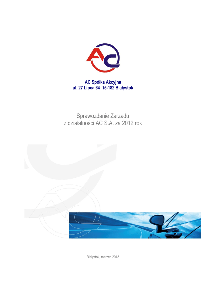AC Spółka Akcyjna ul. 27 Lipca 64 15-182 Białystok Sprawozdanie Zarządu z działalności AC S.A. za 2012 rok Białystok, marzec 2013 AC S.A. w Białymstoku Sprawozdanie Zarządu z działalności za 2012 r. Spis treści 1. PODSTAWOWE INFORMACJE O SPÓŁCE AC S.A. ....................................................................................... 3 2. DZIAŁALNOŚĆ AC S.A. ............................................................................................................................... 4 2.1. 2.2. 2.3. 2.4. 2.5. 2.6. 2.7. 2.8. 3. Podstawowe produkty............................................................................................................................. 4 Rynki zbytu i źródła zaopatrzenia............................................................................................................. 5 Strategia Spółki...................................................................................................................................... 6 Czynniki istotne dla rozwoju Spółki........................................................................................................... 7 Znaczące umowy ................................................................................................................................... 9 Powiązania organizacyjne i kapitałowe ................................................................................................... 11 Badania i rozwój................................................................................................................................... 11 Postępowania sądowe .......................................................................................................................... 12 ŁAD KORPORACYJNY .............................................................................................................................. 13 3.1. 3.2. 3.3. 3.4. 3.5. 3.6. 3.7. 3.8. 3.9. Oświadczenie o stosowaniu ładu korporacyjnego .................................................................................... 13 System kontroli wewnętrznej i zarządzania ryzykiem................................................................................ 14 Kapitał zakładowy, akcjonariat i notowania akcji AC S.A........................................................................... 15 Ograniczenia dotyczące przenoszenia prawa własności papierów wartościowych....................................... 17 Zarząd i Rada Nadzorcza AC S.A. ......................................................................................................... 17 Zasady zmiany statutu .......................................................................................................................... 20 Walne Zgromadzenie............................................................................................................................ 20 Zmiany w podstawowych zasadach zarządzania przedsiębiorstwem Spółki ............................................... 21 Audytor ............................................................................................................................................... 21 4. OPIS ISTOTNYCH CZYNNIKÓW RYZYKA I ZAGROŻEŃ ............................................................................... 22 5. OMÓWIENIE SYTUACJI FINANSOWEJ...................................................................................................... 27 5.1. 5.2. 5.3. 5.4. Realizacja prognoz wyników.................................................................................................................. 27 Aktualna sytuacja finansowa Spółki i omówienie podstawowych wielkości finansowych............................... 27 Ważniejsze zdarzenia mające znaczący wpływ na działalność oraz wyniki finansowe Spółki ....................... 31 Przewidywana sytuacja finansowa oraz ocena możliwości realizacji zamierzeń inwestycyjnych ................... 32 2 AC S.A. w Białymstoku Sprawozdanie Zarządu z działalności za 2012 r. 1. PODSTAWOWE INFORMACJE O SPÓŁCE AC S.A. AC S.A. powstała w wyniku przekształcenia spółki AC Wytwórnia Części Samochodowych sp. z o.o., w spółkę akcyjną. Przekształcenie zostało zarejestrowane przez Sąd Rejonowy w Białymstoku w dniu 17 grudnia 2007 roku. Czas trwania Spółki jest nieoznaczony. Akcje Spółki są notowane na Warszawskiej Giełdzie Papierów Wartościowych od 11 sierpnia 2011 roku. AC S.A. jest producentem wysokiej jakości elementów instalacji gazowych i elektroniki do pojazdów. Przedmiotem działalności AC S.A. jest: – produkcja i sprzedaż podzespołów i zestawów samochodowych instalacji gazowych (wyroby własne LPG/CNG), – produkcja i dystrybucja elektroniki samochodowej (wyroby własne automotive), – dystrybucja części samochodowych (towary – handel). AC S.A. jest wiodącym w Polsce i liczącym się na świecie producentem i dostawcą wysokiej jakości modułów elektronicznych i mechanicznych samochodowych instalacji gazowych oraz elementów elektroniki i wiązek elektrycznych na potrzeby przemysłu samochodowego, w tym zestawów do haków holowniczych. AC S.A. jest także dystrybutorem części i akcesoriów samochodowych (głównie produkcji włoskiej), m.in. takich jak: bezpieczniki, opaski zaciskowe, akcesoria do wiązek, złącza, przerywacze, regulatory, przekaźniki, klemy, zaciski, sondy lambda, lampy ostrzegawcze, akcesoria do tachografów, galanteria motoryzacyjna. Historia firmy rozpoczęła się w 1986 roku od produkcji podgrzewaczy oleju napędowego do silników Diesla. Z biegiem czasu była poszerzana o inne wyroby elektrotechniki samochodowej: przerywacze, przekaźniki, regulatory napięcia, czy też wiązki elektryczne. W połowie lat 90-tych AC podjęła współpracę z niemiecką firmą, dostarczając wiązki elektryczne do haków holowniczych, która stale się rozwija i poszerza o nowe zestawy wiązek z modułem elektronicznym. W roku 1999 