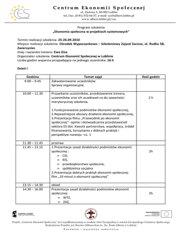 C e n t r u m E k o n o m i i S p o ł e c znej ul. Zielona 3, 20-082 Lublin tel./fax. (0-81) 532-64-37, e-mail: [email protected] www.albert.lublin.pl/ces Program szkolenia „Ekonomia społeczna w projektach systemowych” Termin realizacji szkolenia: 25-26.09.2010 Miejsce realizacji szkolenia: Ośrodek Wypoczynkowo – Szkoleniowy Zajazd Zacisze, ul. Rudka 5B, Zwierzyniec Imię i nazwisko trenera: Ewa Giza Organizator szkolenia: Centrum Ekonomii Społecznej w Lublinie Liczba godzin wsparcia przypadająca na jednego uczestnika: 16 h Dzień I Godzina 9.00 – 9.45 10.00 – 11.30 Temat zajęć Zakwaterowanie uczestników. Sprawy organizacyjne. Przywitanie uczestników, przedstawienie trenera, uczestników oraz ich oczekiwań co do zawartości merytorycznej szkolenia. Ilość godzin 2h 1.Funkcjonowanie podmiotów ekonomii społecznej, 2.Najważniejsze obszary działania ekonomii społecznej, 3.Prezentacja filmu „Przewodnik po ekonomii społecznej”- opinie i doświadczenia przedstawicieli sektora ES dot. Kwestii partnerstwa, współpracy, źródeł finansowania, korzystania z dobrych praktyk i perspektyw rozwoju –cz. 1 11.30 – 11.45 11.45 – 13.15 przerwa 1.Prezentacja zasad działalności podmiotów ekonomii społecznej : • CIS, • KIS, • przedsiębiorstwo społeczne, • spółdzielnia socjalna 2.Prezentacja dobrych praktyk ekonomii społecznejfilm „10 minut o ekonomii społecznej” 13.15 – 14.30 14.30 – 16.00 obiad Prezentacja zasad działalności podmiotów ekonomii społecznej: • WTZ, • ZAZ, 2h 2h Projekt „Centrum Ekonomii Społecznej” jest współfinansowany ze środków Unii Europejskiej w ramach Europejskiego Funduszu Społecznego Realizatorem Projektu jest Bractwo Miłosierdzia im. Św. Brata Alberta w Lublinie CZŁOWIEK - NAJLEPSZA INWESTYCJA C e n t r u m E k o n o m i i S p o ł e c znej ul. Zielona 3, 20-082 Lublin tel./fax. (0-81) 532-64-37, e-mail: [email protected] www.albert.lublin.pl/ces jako przykład na włączenie osób niepełnosprawnych w nurt ekonomii społecznej, Przykład: Działania Polskiego Stowarzyszenia na Rzecz Osób z Upośledzeniem Umysłowym w Kołobrzegu, Pan Cogito – Kraków, Bielski Stowarzyszenie Artystyczne Teatr Grodzki 16.00 – 16.15 16.15 – 17.45 17.45 – 18.00 18.00 – 19.30 19.30 przerwa Prawne aspekty działalności podmiotów ekonomii społecznej. Możliwości finansowania, zakładania i rozwoju: • Stowarzyszeń, Fundacji, • Wiosek tematycznych przerwa Przykłady dobrych praktyk rozwoju gmin poprzez wykorzystanie podmiotów ekonomii społecznej: • Rozwój gminy Bałtów, • „Kraina rumianku” – gmina Hołowno, • Muzeum PGR, • Stowarzyszenie Miłośników Pradoliny Grabowej 2h 2h kolacja Dzień II Godzina 8.00 – 9.00 9.00 – 10.30 10.30 – 10.45 10.45 – 12.15 Temat zajęć śniadanie System Pomocy Społecznej a rozwój ekonomii społecznej Program Aktywności Lokalnej – zasady tworzenia krok po kroku, Korzyści i możliwości (warsztat) Prezentacja filmu „ 10 minut ekonomii społecznej” przerwa Specyfika opracowywania projektów systemowych PO KL – wprowadzenie, Priorytet VII, Działanie 7.1, Poddziałania 7.1.1, 7.1.2, 7.1.3 dobór grupy docelowej, formułowanie celów, opis działań podejmowanych w ramach projektu, Ilość godzin 2h 2h Projekt „Centrum Ekonomii Społecznej” jest współfinansowany ze środków Unii Europejskiej w ramach Europejskiego Funduszu Społecznego Realizatorem Projektu jest Bractwo Miłosierdzia im. Św. Brata Alberta w Lublinie CZŁOWIEK - NAJLEPSZA INWESTYCJA C e n t r u m E k o n o m i i S p o ł e c znej ul. Zielona 3, 20-082 Lublin tel./fax. (0-81) 532-64-37, e-mail: [email protected] www.albert.lublin.pl/ces (warsztat) 12.15 – 12.30 12.30 – 14.00 przerwa Sposoby i możliwości wykorzystania przedmiotów ekonomii społecznej do aktywizacji społecznej i zawodowej. 2h Prezentacja przykładów zastosowania podmiotów ekonomii społecznej w instrumentach aktywnej integracji. Omówienie zalet i wad poszczególnych rozwiązań. Prezentacja filmu „Przewodnik po ekonomii społecznej”- opinie i doświadczenia przedstawicieli sektora ES dot. Kwestii partnerstwa, współpracy, źródeł finansowania, korzystania z dobrych praktyk i perspektyw rozwoju –cz. 2 14.00 – 14.15 14.15 Podsumowanie szkolenia. Ewaluacja i ocena szkolenia. Obiad Projekt „Centrum Ekonomii Społecznej” jest współfinansowany ze środków Unii Europejskiej w ramach Europejskiego Funduszu Społecznego Realizatorem Projektu jest Bractwo Miłosierdzia im. Św. Brata Alberta w Lublinie CZŁOWIEK - NAJLEPSZA INWESTYCJA