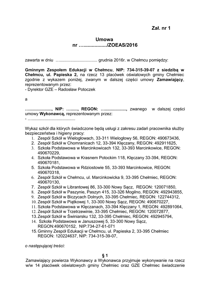 Zał. nr 1 Umowa nr …................./ZOEAS/2016 zawarta w dniu …................................ grudnia 2016r. w Chełmcu pomiędzy: Gminnym Zespołem Edukacji w Chełmcu, NIP: 734-315-39-07 z siedzibą w Chełmcu, ul. Papieska 2, na rzecz 13 placówek oświatowych gminy Chełmiec zgodnie z wykazem poniżej, zwanym w dalszej części umowy Zamawiający, reprezentowanym przez: - Dyrektor GZE – Radosław Potoczek a …..................., NIP: …......, REGON: ….................., zwanego umowy Wykonawcą, reprezentowanym przez: - …..................................... w dalszej części Wykaz szkół dla których świadczone będą usługi z zakresu zadań pracownika służby bezpieczeństwa i higieny pracy: 1. Zespól Szkół w Wielogłowach, 33-311 Wielogłowy 56, REGON: 490673436, 2. Zespół Szkół w Chomranicach 12, 33-394 Klęczany, REGON: 492911625, 3. Szkoła Podstawowa w Marcinkowicach 132, 33-393 Marcinkowice, REGON: 490670229, 4. Szkoła Podstawowa w Krasnem Potockim 118, Klęczany 33-394, REGON: 490670181, 5. Szkoła Podstawowa w Rdziostowie 55, 33-393 Marcinkowice, REGON: 490670318, 6. Zespół Szkół w Chełmcu, ul. Marcinkowicka 9, 33-395 Chełmiec, REGON: 490670130, 7. Zespół Szkół w Librantowej 86, 33-300 Nowy Sącz, REGON: 120071850, 8. Zespół Szkół w Paszynie, Paszyn 415, 33-326 Mogilno, REGON: 492943855, 9. Zespół Szkół w Biczycach Dolnych, 33-395 Chełmiec, REGON: 122744312, 10. Zespół Szkół w Piątkowej 1, 33-300 Nowy Sącz, REGON: 490670227, 11. Szkoła Podstawowa w Klęczanach, 33-394 Klęczany 1, REGON: 492891064, 12. Zespół Szkół w Trzetrzewinie, 33-395 Chełmiec, REGON: 120072877, 13. Zespół Szkół w Świniarsku 132, 33-395 Chełmiec, REGON: 492945794, 14. Szkoła Podstawowa w Januszowej 5, 33-300 Nowy Sącz, REGON:490670152, NIP:734-27-61-071 15. Gminny Zespół Edukacji w Chełmcu, ul. Papieska 2, 33-395 Chełmiec REGON: 120224637, NIP: 734-315-39-07, o następującej treści: §1 Zamawiający powierza Wykonawcy a Wykonawca przyjmuje wykonywanie na rzecz w/w 14 placówek oświatowych gminy Chełmiec oraz GZE Chełmiec świadczenie zadań pracownika służby bezpieczeństwa i higieny pracy, zgodnie z obowiązującymi przepisami prawa i wytycznymi. §2 1. 2. 3. 4. Wykonawca oświadcza, że posiada wiedzę, kwalifikacje i przygotowanie do prawidłowej realizacji umowy zgodnie z obowiązującymi wytycznymi i przepisami. Wykonawca zobowiązany jest do prawidłowej dokumentacji prowadzonych zadań, wymaganych do prawidłowego wykonania obowiązków wymienionych w § 3 umowy. Wykonawca zobowiązuje się udzielać Zamawiającemu potrzebnych informacji o przebiegu wykonywania zlecenia. Wykonawca zobowiązany jest do dochowania należytej staranności przy wykonywaniu zlecenia i nie może powierzyć wykonywania czynności innej osobie. §3 Do obowiązków Wykonawcy należy wykonywanie wszystkich działań związanych z bezpieczeństwem i higieną pracy wynikających z Kodeksu Pracy oraz przepisów wykonawczych min. Rozporządzenia Rady Ministrów z dnia 02 września 1997 r. w sprawie służby bezpieczeństwa i higieny pracy (Dz.U. z 1997 r., nr 109, poz. 704 ze zm.), a w szczególności: 1. przeprowadzanie kontroli warunków pracy oraz przestrzegania przepisów i zasad bhp, 2. informowanie – na bieżąco – pracodawcy o stwierdzonych zagrożeniach zawodowych wraz z wnioskami zmierzającymi do usuwania tych zagrożeń, 3. udzielania instruktażu wstępnego ogólnego w zakresie bhp dla pracowników nowo zatrudnionych oraz w przypadkach zmiany stanowiska pracy, 4. przeprowadzanie szkoleń okresowych dla pracowników, 5. przedstawianie propozycji dotyczących uwzględnienia rozwiązań technicznoorganizacyjnych zapewniających poprawę stanu bezpieczeństwa i higieny pracy, 6. udział w przekazywaniu do użytkowania nowo budowanych lub przebudowywanych obiektów budowlanych albo ich części, w których przewiduje się pomieszczenia pracy, urządzeń produkcyjnych oraz innych urządzeń mających wpływ na warunki pracy i bezpieczeństwo pracowników, 7. zgłaszanie wniosków dotyczących wymagań bezpieczeństwa i higieny pracy w stosowanych oraz nowo wprowadzanych metod pracy, 8. przedstawianie pracodawcy wniosków dotyczących zachowania wymagań ergonomii na stanowiskach pracy, 9. udział w opracowywaniu zakładowych regulaminów i instrukcji dotyczących bezpieczeństwa i higieny pracy, 10. opiniowanie szczegółowych instrukcji dotyczących bezpieczeństwa i higieny pracy na poszczególnych stanowiskach pracy, 11. udział w ustalaniu okoliczności i przyczyn wypadków przy pracy oraz opracowywaniu wniosków wynikających z badania przyczyn i okoliczności tych wypadków oraz zachorowań na choroby zawodowe a także kontrola realizacji tych wniosków, 12. udział w dokonywaniu oceny ryzyka zawodowego, które wiąże się z wykonywaną pracą, 13. niezwłoczne wstrzymanie pracy maszyn lub innego urządzenia w razie wystąpienia bezpośredniego zagrożenia życia lub zdrowia pracownika lub innych osób, 14. niezwłoczne odsunięcie od pracy pracownika zatrudnionego przy pracy wzbronionej, 15. niezwłoczne odsunięcie od pracy pracownika, który swoim zachowaniem lub sposobem wykonywania pracy stwarza bezpośrednie zagrożenie życia lub zdrowia własnego lub innych osób, 16. wnioskowanie do pracodawcy o niezwłoczne wstrzymanie pracy, w jego części lub w innym miejscu wyznaczonym przez pracodawcę do wykonywania pracy, w przypadku stwierdzenia bezpośredniego zagrożenia życia lub zdrowia pracowników lub innych osób. 17. sporządzanie raz w roku sprawozdania o stanie BHP w zakładzie pracy. §4 Umowa zostaje zawarta na czas określony od 01.01.2017r. do 31.12.2018r., z możliwością jej rozwiązania przez każdą ze stron za uprzednim dwumiesięcznym okresem wypowiedzenia. §5 1. Zamawiający zobowiązuje się zapłacić Wykonawcy za wykonywane czynności wynagrodzenie w kwocie …................ zł brutto miesięcznie (