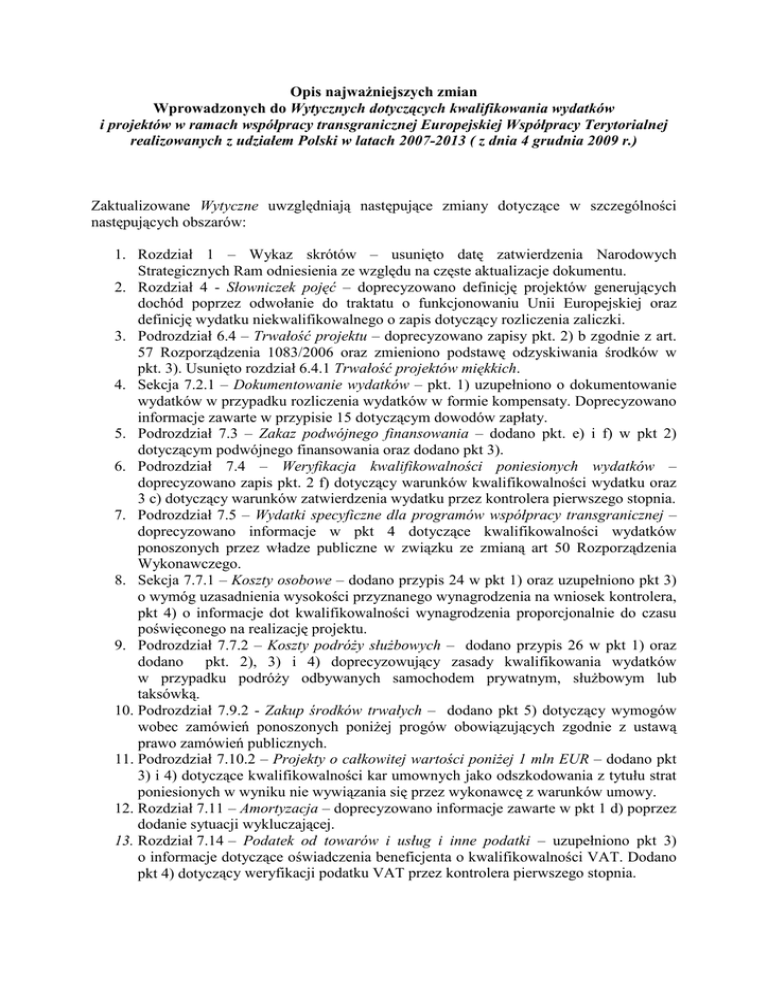Opis najwaŜniejszych zmian Wprowadzonych do Wytycznych dotyczących kwalifikowania wydatków i projektów w ramach współpracy transgranicznej Europejskiej Współpracy Terytorialnej realizowanych z udziałem Polski w latach 2007-2013 ( z dnia 4 grudnia 2009 r.) Zaktualizowane Wytyczne uwzględniają następujące zmiany dotyczące w szczególności następujących obszarów: 1. Rozdział 1 – Wykaz skrótów – usunięto datę zatwierdzenia Narodowych Strategicznych Ram odniesienia ze względu na częste aktualizacje dokumentu. 2. Rozdział 4 - Słowniczek pojęć – doprecyzowano definicję projektów generujących dochód poprzez odwołanie do traktatu o funkcjonowaniu Unii Europejskiej oraz definicję wydatku niekwalifikowalnego o zapis dotyczący rozliczenia zaliczki. 3. Podrozdział 6.4 – Trwałość projektu – doprecyzowano zapisy pkt. 2) b zgodnie z art. 57 Rozporządzenia 1083/2006 oraz zmieniono podstawę odzyskiwania środków w pkt. 3). Usunięto rozdział 6.4.1 Trwałość projektów miękkich. 4. Sekcja 7.2.1 – Dokumentowanie wydatków – pkt. 1) uzupełniono o dokumentowanie wydatków w przypadku rozliczenia wydatków w formie kompensaty. Doprecyzowano informacje zawarte w przypisie 15 dotyczącym dowodów zapłaty. 5. Podrozdział 7.3 – Zakaz podwójnego finansowania – dodano pkt. e) i f) w pkt 2) dotyczącym podwójnego finansowania oraz dodano pkt 3). 6. Podrozdział 7.4 – Weryfikacja kwalifikowalności poniesionych wydatków – doprecyzowano zapis pkt. 2 f) dotyczący warunków kwalifikowalności wydatku oraz 3 c) dotyczący warunków zatwierdzenia wydatku przez kontrolera pierwszego stopnia. 7. Podrozdział 7.5 – Wydatki specyficzne dla programów współpracy transgranicznej – doprecyzowano informacje w pkt 4 dotyczące kwalifikowalności wydatków ponoszonych przez władze publiczne w związku ze zmianą art 50 Rozporządzenia Wykonawczego. 8. Sekcja 7.7.1 – Koszty osobowe – dodano przypis 24 w pkt 1) oraz uzupełniono pkt 3) o wymóg uzasadnienia wysokości przyznanego wynagrodzenia na wniosek kontrolera, pkt 4) o informacje dot kwalifikowalności wynagrodzenia proporcjonalnie do czasu poświęconego na realizację projektu. 9. Podrozdział 7.7.2 – Koszty podróŜy słuŜbowych – dodano przypis 26 w pkt 1) oraz dodano pkt. 2), 3) i 4) doprecyzowujący zasady kwalifikowania wydatków w przypadku podróŜy odbywanych samochodem prywatnym, słuŜbowym lub taksówką. 10. Podrozdział 7.9.2 - Zakup środków trwałych – dodano pkt 5) dotyczący wymogów wobec zamówień ponoszonych poniŜej progów obowiązujących zgodnie z ustawą prawo zamówień publicznych. 11. Podrozdział 7.10.2 – Projekty o całkowitej wartości poniŜej 1 mln EUR – dodano pkt 3) i 4) dotyczące kwalifikowalności kar umownych jako odszkodowania z tytułu strat poniesionych w wyniku nie wywiązania się przez wykonawcę z warunków umowy. 12. Rozdział 7.11 – Amortyzacja – doprecyzowano informacje zawarte w pkt 1 d) poprzez dodanie sytuacji wykluczającej. 13. Rozdział 7.14 – Podatek od towarów i usług i inne podatki – uzupełniono pkt 3) o informacje dotyczące oświadczenia beneficjenta o kwalifikowalności VAT. Dodano pkt 4) dotyczący weryfikacji podatku VAT przez kontrolera pierwszego stopnia. 14. Rozdział 7.15 – Pomoc techniczna – zmieniono brzmienie pkt. 2) oraz dodano pkt 3) dotyczący przeprowadzania rozeznania rynku w przypadku ponoszenia wydatków w projektach Pomocy Technicznej. 15. Rozdział 7.15.1 – Koszty oddelegowania do pracy – dodano pkt 2) dotyczący podstaw prawnych do regulowania świadczeń dla pracowników czasowo przeniesionych lub oddelegowanych. 16. Rozdział 8 – Wydatki niekwalifikowalne – dodano pkt. r) dotyczący niekwalifikowania podatku VAT rozliczanego współczynnikiem sprzedaŜy. Ponadto doprecyzowano pkt. z aa), ff), ee). 17. Załącznik nr 1 do Wytycznych: a) wprowadzono przypis nr 4 definiujący co naleŜy rozumieć pod pojęciem kosztów przygotowawczych w kategorii Projekty infrastrukturalne. Jednocześnie usunięto wprowadzoną wcześniej definicję projektu infrastrukturalnego, b) doprecyzowano rodzaj wydatków kwalifikowalnych i/lub niekwalifikowalnych w częściach I Projekty infrastrukturalne, VIII Koszt osobowe, IX Koszty podróŜy słuŜbowych, zagranicznych i krajowych, XII Projekty z zakresu kultury, np. organizacja wydarzeń kulturalnych, spotkań, wystaw, festiwali, XVI Wkład niepienięŜny c) uaktualniono adresy publikacyjne przywołanych ustaw i rozporządzeń. 18. Inne zmiany redakcyjne oraz formalno - prawne.