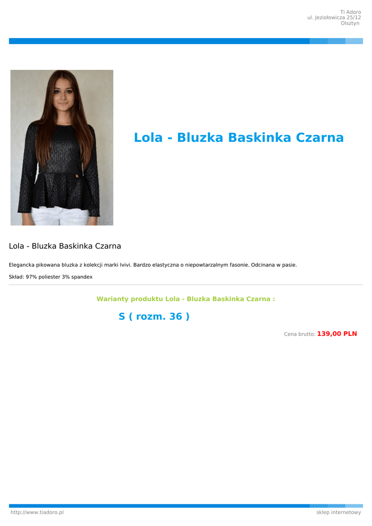 Ti Adoro ul. Jeziołowicza 25/12 Olsztyn Lola - Bluzka Baskinka Czarna Lola - Bluzka Baskinka Czarna Elegancka pikowana bluzka z kolekcji marki Ivivi. Bardzo elastyczna o niepowtarzalnym fasonie. Odcinana w pasie. Skład: 97% poliester 3% spandex Warianty produktu Lola - Bluzka Baskinka Czarna : S ( rozm. 36 ) Cena brutto: http://www.tiadoro.pl 139,00 PLN sklep internetowy