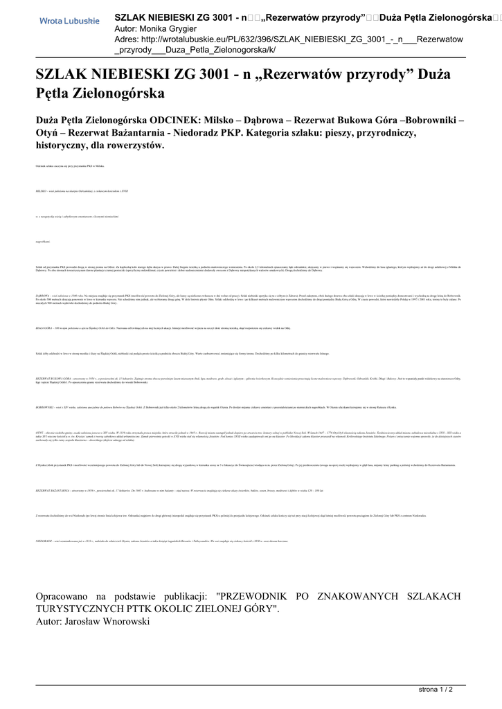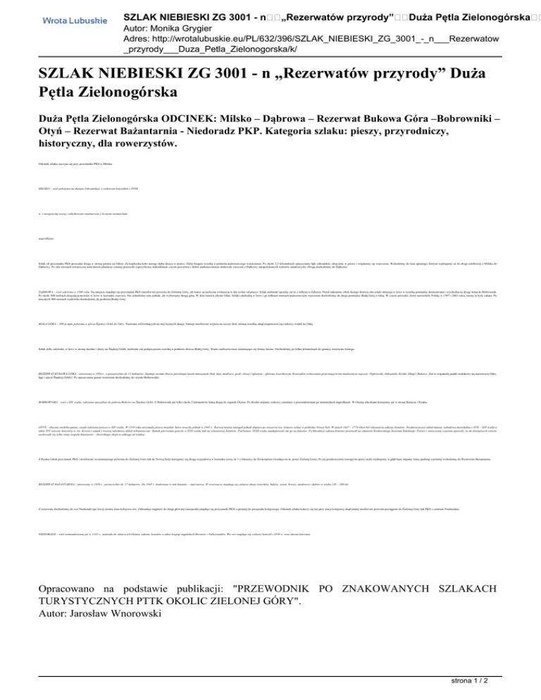 SZLAK NIEBIESKI ZG 3001 - n „Rezerwatów przyrody” Duża Pętla Zielonogórska Autor: Monika Grygier Adres: http://wrotalubuskie.eu/PL/632/396/SZLAK_NIEBIESKI_ZG_3001_-_n___Rezerwatow _przyrody___Duza_Petla_Zielonogorska/k/ SZLAK NIEBIESKI ZG 3001 - n „Rezerwatów przyrody” Duża Pętla Zielonogórska Duża Pętla Zielonogórska ODCINEK: Milsko – Dąbrowa – Rezerwat Bukowa Góra –Bobrowniki – Otyń – Rezerwat Bażantarnia - Niedoradz PKP. Kategoria szlaku: pieszy, przyrodniczy, historyczny, dla rowerzystów. Odcinek szlaku zaczyna się przy przystanku PKS w Milsku. MILSKO – wieś położona na skarpie Odrzańskiej, z ciekawym kościołem z XVIII w. z neogotycką wieżą i zabytkowym cmentarzem z licznymi niemieckimi nagrobkami. Szlak od przystanku PKS prowadzi drogą w stronę promu na Odrze. Za kapliczką koło starego dębu skręca w prawo. Dalej biegnie ścieżką u podnóża malowniczego wzniesienia. Po około 2,5 kilometrach opuszczamy łąki odrzańskie, skręcamy w prawo i wspinamy się wąwozem. Wchodzimy do lasu iglastego, którym wędrujemy aż do drogi asfaltowej z Milska do Dąbrowy. Po obu stronach towarzyszą nam dawne plantacje czarnej porzeczki (specyficzny mikroklimat, czyste powietrze i dobre nasłonecznienie dodawały owocom z Dąbrowy niespotykanych walorów smakowych). Drogą dochodzimy do Dąbrowy. DĄBROWA – wieś założona w 1300 roku. Na miejscu znajduje się przystanek PKS (możliwość powrotu do Zielonej Góry, ale kursy są nieliczne zwłaszcza w dni wolne od pracy). Szlak niebieski spotyka się tu z żółtym (z Zaboru). Przed zakrętem, obok dużego drzewa oba szlaki skręcają w lewo w ścieżkę pomiędzy domostwami i wychodzą na drogę leśną do Bobrownik. Po około 500 metrach skręcają ponownie w lewo w kierunku wąwozu. Nie schodzimy nim jednak, ale wybieramy drogę górą. W dole leniwie płynie Odra. Szlaki odchodzą w lewo i po kilkuset metrach malowniczym wąwozem dochodzimy do drogi pomiędzy Białą Górą a Odrą. W czasie powodzi, które nawiedziły Polskę w 1997 i 2001 roku, tereny te były zalane. Po niecałych 900 metrach wędrówki dochodzimy do podnóża Białej Góry. BIAŁA GÓRA – 100 m npm położona u ujścia Śląskiej Ochli do Odry. Nazwana od kwitnących na niej licznych akacji. Istnieje możliwość wejścia na szczyt dość stromą ścieżką, skąd rozpościera się ciekawy widok na Odrę. Szlak żółty odchodzi w lewo w stronę mostku i śluzy na Śląskiej Ochli, niebieski zaś podąża prosto ścieżką u podnóża zbocza Białej Góry. Warto zaobserwować zmieniające się formy terenu. Dochodzimy po kilku kilometrach do granicy rezerwatu leśnego. REZERWAT BUKOWA GÓRA – utworzony w 1954 r., o powierzchni ok. 11 hektarów. Zajmuje strome zbocze porośnięte lasem mieszanym (buk, lipa, modrzew, grab, olsza) i iglastym – głównie świerkowym. Krawędzie wzniesienia przecinają liczne malownicze wąwozy: Dąbrowski, Odrzański, Krótki, Długi i Bukowy. Jest to wspaniały punkt widokowy na starorzecze Odry, łęgi i ujście Śląskiej Ochli1. Po opuszczeniu granic rezerwatu dochodzimy do wioski Bobrowniki. BOBROWNIKI – wieś z XIV wieku, założona specjalnie do połowu Bobrów na Śląskiej Ochli. Z Bobrownik już tylko około 2 kilometrów leśną drogą do rogatek Otynia. Po drodze mijamy ciekawy cmentarz z pozostałościami po niemieckich nagrobkach. W Otyniu uliczkami kierujemy się w stronę Ratusza i Rynku. OTYŃ – obecnie siedziba gminy, osada założona jeszcze w XIV wieku. W 1319 roku otrzymała prawa miejskie, które straciła jednak w 1945 r.. Rozwój miasta nastąpił jednak dopiero po otwarciu tzw. komory solnej w pobliskie Nowej Soli. W latach 1647 – 1776 Otyń był własnością zakonu Jezuitów. Średniowieczny układ miasta, zabudowa mieszkalna z XVII – XIX wieku a także XVI wieczny kościół p.w. św. Krzyża i zamek z tworzą zabytkowy układ urbanistyczny. Zamek pierwotnie gotycki w XVII wieku stał się własnością Jezuitów. Pod koniec XVIII wieku zaadaptowali oni go na klasztor. Po likwidacji zakonu klasztor przeszedł na własność Królewskiego Instytutu Szkolnego. Pożary i zniszczenia wojenne sprawiły, że do dzisiejszych czasów zachowały się tylko ruiny zespołu klasztorno – dworskiego (dojście odnogą od szlaku). Z Rynku (obok przystanek PKS i możliwość wcześniejszego powrotu do Zielonej Góry lub do Nowej Soli) kierujemy się drogą wyjazdową w kierunku szosy nr 3 z Jakuszyc do Świnoujścia (wiodąca m.in. przez Zieloną Górę). Po jej przekroczeniu (uwaga na spory ruch) wędrujemy w głąb lasu, mijamy leśny parking a później wchodzimy do Rezerwatu Bażantarnia. REZERWAT BAŻANTARNIA – utworzony w 1959 r., powierzchni ok. 17 hektarów. Do 1945 r. hodowano w nim bażanty – stąd nazwa. W rezerwacie znajdują się ciekawe okazy świerków, buków, sosen, brzozy, modrzewi i dębów w wieku 120 – 180 lat. Z rezerwatu dochodzimy do wsi Niedoradz (po lewej stronie linia kolejowa tzw. Odrzanka) najpierw do drogi głównej (nieopodal znajduje się przystanek PKS) a później do przejazdu kolejowego. Odcinek szlaku kończy się tuż przy stacji kolejowej skąd istniej możliwość powrotu pociągiem do Zielonej Góry lub PKS z centrum Niedoradza. NIEDORADZ – wieś wzmiankowana już w 1333 r., należała do właścicieli Otynia, zakonu Jezuitów a także książąt żagańskich Bironów i Talleyrandów. We wsi znajduje się ciekawy kościół z XVII w. oraz dawna karczma. Opracowano na podstawie publikacji: "PRZEWODNIK PO ZNAKOWANYCH SZLAKACH TURYSTYCZNYCH PTTK OKOLIC ZIELONEJ GÓRY". Autor: Jarosław Wnorowski strona 1 / 2 SZLAK NIEBIESKI ZG 3001 - n „Rezerwatów przyrody” Duża Pętla Zielonogórska Autor: Monika Grygier Adres: http://wrotalubuskie.eu/PL/632/396/SZLAK_NIEBIESKI_ZG_3001_-_n___Rezerwatow _przyrody___Duza_Petla_Zielonogorska/k/ strona 2 / 2 Powered by TCPDF (www.tcpdf.org)