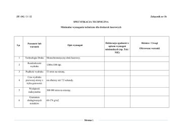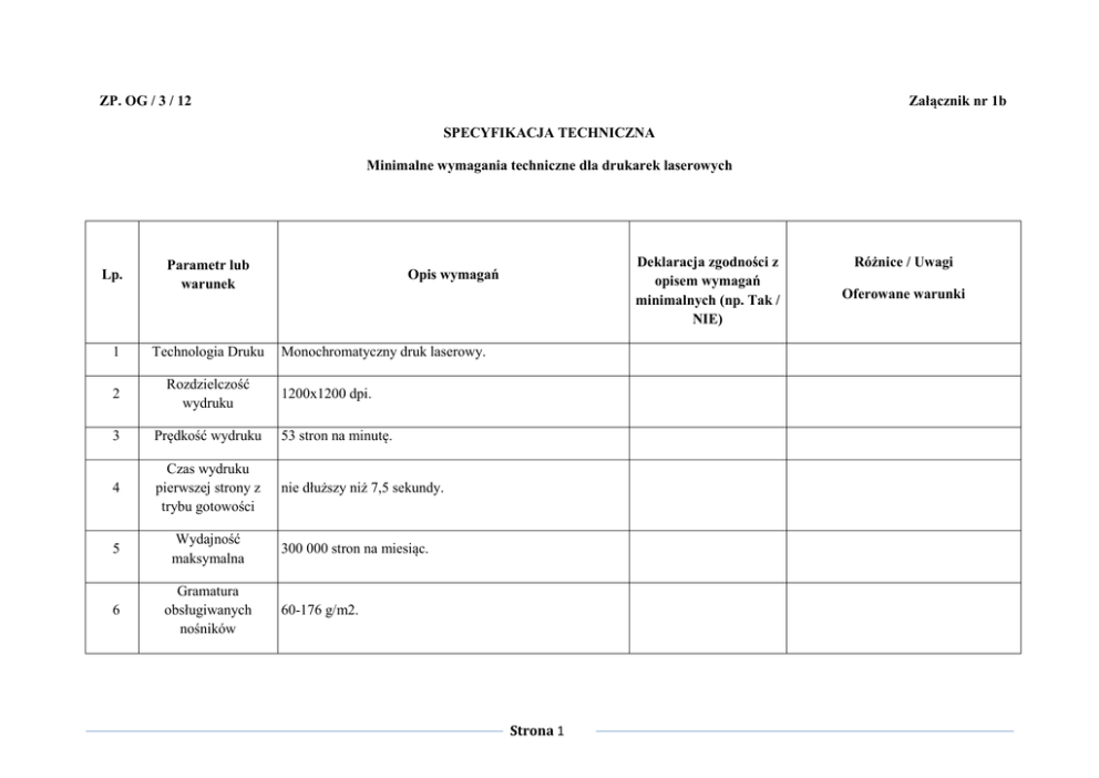 ZP. OG / 3 / 12 Załącznik nr 1b SPECYFIKACJA TECHNICZNA Minimalne wymagania techniczne dla drukarek laserowych Lp. Parametr lub warunek Deklaracja zgodności z opisem wymagań minimalnych (np. Tak / NIE) Opis wymagań 1 Technologia Druku Monochromatyczny druk laserowy. 2 Rozdzielczość wydruku 3 Prędkość wydruku 53 stron na minutę. 4 Czas wydruku pierwszej strony z trybu gotowości nie dłuższy niż 7,5 sekundy. 5 Wydajność maksymalna 6 Gramatura obsługiwanych nośników 1200x1200 dpi. 300 000 stron na miesiąc. 60-176 g/m2. Strona 1 Różnice / Uwagi Oferowane warunki 7 Pojemność odbiornika min. 550 ark. 80 g/m2. papieru Podajnik nr 1 - A4 na 550 arkuszy (dla gramatury 80g/m2). Podajnik nr 2 - wielofunkcyjny na 100 arkuszy (możliwość drukowania na kopertach/zwrotkach). 8 Podajniki papieru Podajnik nr 3 – dedykowany podajnik kopert na 50 arkuszy. Wbudowany moduł druku dwustronnego (duplex). 9 Pamięć 256 MB z możliwością rozszerzenia do 1280 MB. 10 Procesor 600 MHz. 11 Wejścia Wbudowana karta Ethernet 10/100 Base TX, wejście RJ45. Port USB (2.0). 12 Języki drukowania 13 Zespół tonera i bębna PCL 6, PCL 5e, Postscript 3 lub ich emulacje. Urządzenie dostarczone z materiałami wystarczającymi do wydrukowania 30 tys. stron. Urządzenie wyprodukowane zgodnie z wymaganiami normy ISO 9001. 14 Wymagane normy Oferowany produkt musi spełniać normy Energy Star wersja 4.0 lub równoważne (*). Strona 2 Kabel UTP połączeniowy, obustronnie zakończony wtykami RJ45 o długości min. 5 m i spełniający wymagania min. kategorii 5. Sterowniki do pracy w systemach: Windows XP/Vista/7, Windows Server 2008 R2 x64, Windows Server 2003. 15 Dodatkowe wymagania Oprogramowanie producenta do zarządzania, konfiguracji i zdalnej diagnostyki urządzeń w sieci lokalnej. lub zarządzanie, konfiguracja i zdalna diagnostyka urządzeń w sieci lokalnej, przez wbudowany serwer WWW. Wyświetlacz umożliwiający odczytywanie komunikatów drukarki o stanie materiałów eksploatacyjnych, błędach, itp. Drukarka musi posiadać pakiet serwisowy oferujący następujące warunki gwarancji. Gwarancja 36 miesięcy na części i robociznę realizowana w miejscu eksploatacji sprzętu. - Gwarantowany przez producenta czas skutecznej naprawy w następnym dniu roboczym od zgłoszenia awarii. - Zakończenie naprawy nie później niż w ciągu 3 dni roboczych licząc od daty zgłoszenia awarii. - W przypadku gdy przewidywany czas naprawy sprzętu będzie dłuższy niż 3 dni, następnego dnia roboczego Wykonawca dostarczy na własny koszt sprzęt zastępczy (o co najmniej tych samych parametrach i funkcjach użytkowych). - Czas naprawy wyłączony z okresu gwarancyjnego. Czas trwania gwarancji będzie automatycznie - 16 Gwarancja Strona 3 wydłużony o czas trwania naprawy. W przypadku gdy naprawa sprzętu potrwa dłużej niż 6 tygodni lub gdy sprzęt będzie naprawiany trzykrotnie podczas okresu gwarancyjnego, Wykonawca wymieni na własny koszt naprawiany sprzęt na nowy, o co najmniej takich samych parametrach i funkcjach użytkowych. - Pakiet serwisowy winien być składnikiem drukarki bez konieczności późniejszego aktywowania, rejestrowania lub innych działań ze strony użytkownika. - Możliwość realizacji gwarancji bezpośrednio przez serwis producenta z pominięciem dostawcy. - Możliwość pobierania dokumentacji i sterowników z jednej lokalizacji w sieci Internet. - Możliwość uzyskania pomocy technicznej producenta w języku polskim. - Serwis realizowany w języku polskim. - Firma serwisująca musi posiadać ISO 9001:2000 na świadczenie usług serwisowych oraz posiadać autoryzacje producenta drukarki – dokumenty potwierdzające załączyć do oferty. - Oświadczenie producenta drukarki, że w przypadku nie wywiązywania się z obowiązków gwarancyjnych oferenta lub firmy serwisującej, przejmie na siebie wszelkie zobowiązania związane z serwisem. - Jako potwierdzenie udzielenia wyżej wymienionych warunków serwisowych oferent dołączy do oferty stosowne oświadczenie producenta sprzętu podpisane przez upoważnionego przedstawiciela. Strona 4 17 Dostawa i odbiór Koszty dostawy Wykonawca. (wraz z rozładunkiem) pokrywa Wszystkie urządzenia zasilane z sieci elektrycznej muszą być zgodne z polskimi standardami, tj. napięcie 230 Volt, 50 Hz, prąd jednofazowy. 18 19 Zasilanie Oznaczenie Jeżeli którekolwiek pozycje są klasyfikowane jako niebezpieczne lub wymagają specjalnego użytkowania, pełna informacją na powyższy temat, wraz z oznaczeniami bezpieczeństwa, musi zostać podana w ofercie. Wszystkie pozycje muszą być oznakowane na opakowaniu oraz na obudowie (w widocznym miejscu) symbolem typu (modelu) drukarki laserowej, zgodnie z niniejszą specyfikacją. (*) Oferowany sprzęt musi spełniać wymogi specyfikacji technicznej ENERGY STAR wersja 4.0 i posiadać oznaczenie znakiem usługowym ENERGY STAR lub spełniać kryteria efektywności energetycznej co najmniej równoważne z koniecznymi do uzyskania takiego oznaczenia. Strona 5