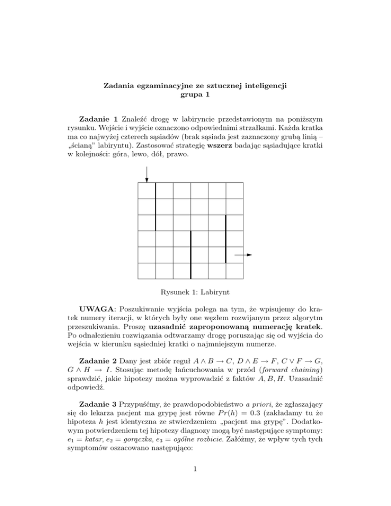 Zadania egzaminacyjne ze sztucznej inteligencji grupa 1 Zadanie 1 Znaleźć drogę w labiryncie przedstawionym na poniższym rysunku. Wejście i wyjście oznaczono odpowiednimi strzałkami. Każda kratka ma co najwyżej czterech sąsiadów (brak sąsiada jest zaznaczony grubą linią – „ścianą” labiryntu). Zastosować strategię wszerz badając sąsiadujące kratki w kolejności: góra, lewo, dół, prawo. Rysunek 1: Labirynt UWAGA: Poszukiwanie wyjścia polega na tym, że wpisujemy do kratek numery iteracji, w których były one węzłem rozwijanym przez algorytm przeszukiwania. Proszę uzasadnić zaproponowaną numerację kratek. Po odnalezieniu rozwiązania odtwarzamy drogę poruszając się od wyjścia do wejścia w kierunku sąsiedniej kratki o najmniejszym numerze. Zadanie 2 Dany jest zbiór reguł A ∧ B → C, D ∧ E → F , C ∨ F → G, G ∧ H → I. Stosując metodę łańcuchowania w przód (forward chaining) sprawdzić, jakie hipotezy można wyprowadzić z faktów A, B, H. Uzasadnić odpowiedź. Zadanie 3 Przypuśćmy, że prawdopodobieństwo a priori, że zgłaszający się do lekarza pacjent ma grypę jest równe P r(h) = 0.3 (zakładamy tu że hipoteza h jest identyczna ze stwierdzeniem „pacjent ma grypę”. Dodatkowym potwierdzeniem tej hipotezy diagnozy mogą być następujące symptomy: e1 = katar, e2 = gorączka, e3 = ogólne rozbicie. Załóżmy, że wpływ tych tych symptomów oszacowano następująco: 1 Przyjmijmy następujące dane numeryczne: P r(e1 |h) = 0.7, P r(e1 |¬h) = 0.6 P r(e2 |h) = 0.4, P r(e2 |¬h) = 0.3 P r(e3 |h) = 0.6, P r(e3 |¬h) = 0.4 Zakładając niezależność symptomów względem hipotezy obliczyć prawdopodobieństwa: P r(¬h|e1 ) oraz P r(¬h|e1 , e3 ). Wyjaśnić znaczenie obliczonych prawdopodobieństw. Jak wyglądają wzory na odpowiednie prawdopodobieństwa przy braku założenia o warunkowej niezależności? Zadanie 4 Sprawdzić, czy ze zbioru aksjomatów: P (a) ∨ P (b) ∨ P (c) Q(x, y) ∧ R(y, d) → ¬P (x) S(x, y) → Q(x, y) ∨ U (x, y) S(a, e) ¬U (a, e) R(e, d) można wyprowadzić formuły: P (a) → P (b), ¬P (a) ∧ P (b), oraz Q(a, e) ∧ ¬P (a). Zadanie 5 Dane są dwie reguły z rozmytymi przesłankami i konkluzjami: if (x is A1 ) and (x is B1 ) then (y is C1 ) if (x is A2 ) and (x is B2 ) then (y is C2 ) Przypuśćmy, że przesłanki tych reguł spełnione są w stopniu, odpowiednio 0.85, 0.3 oraz 0.4, 0.9. Przyjmując, że konkluzje reguł opisane są zbiorami rozmytymi o trójkątnych funkcjach przynależności, odpowiednio, ∆(10, 30, 50) oraz ∆(20, 40, 60) należy narysować funkcje przynależności reprezentującą ostateczną konkluzję. Jak można wyostrzyć ten zbiór? Opcjonalnie: Proszę obliczyć wartość zmiennej y dowolną metoda wyostrzania. 2