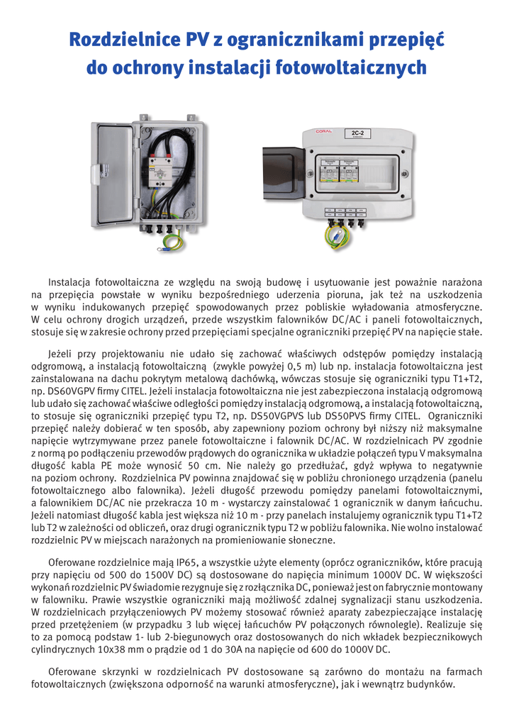 Rozdzielnice PV z ogranicznikami przepięć do ochrony instalacji fotowoltaicznych Instalacja fotowoltaiczna ze względu na swoją budowę i usytuowanie jest poważnie narażona na przepięcia powstałe w wyniku bezpośredniego uderzenia pioruna, jak też na uszkodzenia w wyniku indukowanych przepięć spowodowanych przez pobliskie wyładowania atmosferyczne. W celu ochrony drogich urządzeń, przede wszystkim falowników DC/AC i paneli fotowoltaicznych, stosuje się w zakresie ochrony przed przepięciami specjalne ograniczniki przepięć PV na napięcie stałe. Jeżeli przy projektowaniu nie udało się zachować właściwych odstępów pomiędzy instalacją odgromową, a instalacją fotowoltaiczną (zwykle powyżej 0,5 m) lub np. instalacja fotowoltaiczna jest zainstalowana na dachu pokrytym metalową dachówką, wówczas stosuje się ograniczniki typu T1+T2, np. DS60VGPV firmy CITEL. Jeżeli instalacja fotowoltaiczna nie jest zabezpieczona instalacją odgromową lub udało się zachować właściwe odległości pomiędzy instalacją odgromową, a instalacją fotowoltaiczną, to stosuje się ograniczniki przepięć typu T2, np. DS50VGPVS lub DS50PVS firmy CITEL. Ograniczniki przepięć należy dobierać w ten sposób, aby zapewniony poziom ochrony był niższy niż maksymalne napięcie wytrzymywane przez panele fotowoltaiczne i falownik DC/AC. W rozdzielnicach PV zgodnie z normą po podłączeniu przewodów prądowych do ogranicznika w układzie połączeń typu V maksymalna długość kabla PE może wynosić 50 cm. Nie należy go przedłużać, gdyż wpływa to negatywnie na poziom ochrony. Rozdzielnica PV powinna znajdować się w pobliżu chronionego urządzenia (panelu fotowoltaicznego albo falownika). Jeżeli długość przewodu pomiędzy panelami fotowoltaicznymi, a falownikiem DC/AC nie przekracza 10 m - wystarczy zainstalować 1 ogranicznik w danym łańcuchu. Jeżeli natomiast długość kabla jest większa niż 10 m - przy panelach instalujemy ogranicznik typu T1+T2 lub T2 w zależności od obliczeń, oraz drugi ogranicznik typu T2 w pobliżu falownika. Nie wolno instalować rozdzielnic PV w miejscach narażonych na promieniowanie słoneczne. Oferowane rozdzielnice mają IP65, a wszystkie użyte elementy (oprócz ograniczników, które pracują przy napięciu od 500 do 1500V DC) są dostosowane do napięcia minimum 1000V DC. W większości wykonań rozdzielnic PV świadomie rezygnuje się z rozłącznika DC, ponieważ jest on fabrycznie montowany w falowniku. Prawie wszystkie ograniczniki mają możliwość zdalnej sygnalizacji stanu uszkodzenia. W rozdzielnicach przyłączeniowych PV możemy stosować również aparaty zabezpieczające instalację przed przetężeniem (w przypadku 3 lub więcej łańcuchów PV połączonych równolegle). Realizuje się to za pomocą podstaw 1- lub 2-biegunowych oraz dostosowanych do nich wkładek bezpiecznikowych cylindrycznych 10x38 mm o prądzie od 1 do 30A na napięcie od 600 do 1000V DC. Oferowane skrzynki w rozdzielnicach PV dostosowane są zarówno do montażu na farmach fotowoltaicznych (zwiększona odporność na warunki atmosferyczne), jak i wewnątrz budynków. Ograniczniki przepięć DC typu 1+2 (B+C) - DS60VGPV hnologia VG tec 10 gwarancji o d da lat c ji Ogranicznik przepięć SPD typu 1+2 (B+C) wykonany w technologii VG (szeregowo połączony iskiernik gazowy i warystor) ty pro d uk 10 lat gwarancji od daty produkcji Zabezpieczenie przed starzeniem spowodowanym prądami roboczymi i upływowymi Opis DS60VGPV-500 DS60VGPV-1000 1000V DC Napięcie znamionowe UOCSTC 500V DC Najwyższe napięcie trwałej pracy UCPV 600V DC Wytrzymałość zwarciowa ISCWPV Prąd upływu - napięcie przy Ucpv IPE brak Prąd następczy If brak Czas zadziałania tA <25 ns Znamionowy prąd wyładowczy / na biegun (8/20 µs) In Prąd udarowy / na biegun (10/350 µs) Iimp 12,5kA Maks. prąd wyładowczy (8/20 µs) Imax 40kA Napięciowy poziom ochrony przy In Up <1,7kV Napięciowy poziom ochrony przy Imax Up <2,3kV 1200V DC 1000A 20kA <2,8kV <3,7kV ‑40 do +85°C Zakres temperatur pracy Inne wykonania na 600, 1000 i 1500V DC - na zapytanie Ograniczniki przepięć DC typu 2 (C) - DS50VGPVS hnologia VG tec 10 gwarancji o d da lat ty pro d uk 10 lat gwarancji od daty produkcji Zabezpieczenie przed starzeniem spowodowanym prądami roboczymi i upływowymi Możliwość zastosowania we wszystkich urządzeniach fotowoltaicznych do 1000V DC (Uocstc) Opis DS50VGPVS-500 DS50VGPVS-1000 Napięcie znamionowe UOCSTC 500V DC 1000V DC Najwyższe napięcie trwałej pracy UCPV 600V DC 1200V DC Wytrzymałość zwarciowa ISCWPV Prąd upływu - napięcie przy Ucpv IPE brak Prąd następczy If brak Czas zadziałania tA <25 ns Znamionowy prąd wyładowczy / na biegun (8/20 µs) In 20kA Maks. prąd wyładowczy (8/20 µs) Imax Napięciowy poziom ochrony przy In Up <2,5kV <3,6kV Napięciowy poziom ochrony przy Imax Up <3,4kV <4,5kV Zakres temperatur pracy Inne wykonania na 600, 1000 i 1500V DC - na zapytanie strona 2 1000A 40kA ‑40 do +85°C c ji Ogranicznik przepięć SPD typu 2 (C) wykonany w technologii VG (szeregowo połączony iskiernik gazowy i warystor) Ograniczniki przepięć DC typu 2 (C) - DS50PVS‑G/51 5 Ochrona przepięciowa typu 2 dla fotowoltaiki o d da lat ży gwarancji ty sprzed a Zdolność odprowadzania na biegun: In = 20kA; Imax = 40kA Dzięki separacji galwanicznej nadają się do ochrony paneli cienkowarstwowych Wykonanie typu Y na bazie 2 warystorów i 1 iskiernika gazowego Opis DS50PVS500G/51 DS50PVS800G/51 DS50PVS1000G/51 1000V DC Napięcie znamionowe UOCSTC 500V DC 800V DC Najwyższe napięcie trwałej pracy UCPV 530V DC 960V DC Wytrzymałość zwarciowa ISCWPV 70A 1000A Prąd upływu - napięcie przy Ucpv IPE brak <0,1µA Prąd następczy If brak Czas zadziałania tA <25 ns Znamionowy prąd wyładowczy / na biegun (8/20 µs) In 20kA Maks. prąd wyładowczy (8/20 µs) Imax 40kA Maks. prąd wyładowczy (8/20 µs) - razem Itotal 60kA Napięciowy poziom ochron