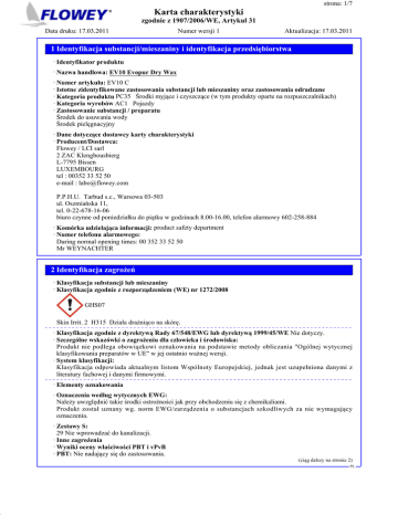 DR strona: 1/7 Karta charakterystyki zgodnie z 1907/2006/WE, Artykuł 31 Data druku: 17.03.2011 Numer wersji 1 Aktualizacja: 17.03.2011 1 Identyfikacja substancji/mieszaniny i identyfikacja przedsiębiorstwa · Identyfikator produktu · Nazwa handlowa: EV10 Evopur Dry Wax · Numer artykułu: EV10 C · Istotne zidentyfikowane zastosowania substancji lub mieszaniny oraz zastosowania odradzane · Kategoria produktu PC35 Środki myjące i czyszczące (w tym produkty oparte na rozpuszczalnikach) · Kategoria wyrobów AC1 Pojazdy · Zastosowanie substancji / preparatu Środek do usuwania wody Środek pielęgnacyjny · Dane dotyczące dostawcy karty charakterystyki · Producent/Dostawca: Flowey / LCI sarl 2 ZAC Klengbousbierg L-7795 Bissen LUXEMBOURG tel : 00352 33 52 50 e-mail : [email protected] P.P.H.U. Tarbud s.c., Warsowa 03-503 ul. Oszmiańska 11, tel. 0-22-678-16-06 biuro czynne od poniedziałku do piątku w godzinach 8.00-16.00, telefon alarmowy 602-258-884 · Komórka udzielająca informacji: product safety department · Numer telefonu alarmowego: During normal opening times: 00 352 33 52 50 Mr WEYNACHTER 2 Identyfikacja zagrożeń · Klasyfikacja substancji lub mieszaniny · Klasyfikacja zgodnie z rozporządzeniem (WE) nr 1272/2008 GHS07 Skin Irrit. 2 H315 Działa drażniąco na skórę. · Klasyfikacja zgodnie z dyrektywą Rady 67/548/EWG lub dyrektywą 1999/45/WE Nie dotyczy. · Szczególne wskazówki o zagrożeniu dla człowieka i środowiska: Produkt nie podlega obowiązkowi oznakowania na podstawie metody obliczania "Ogólnej wytycznej klasyfikowania preparatów w UE" w jej ostatnio ważnej wersji. · System klasyfikacji: Klasyfikacja odpowiada aktualnym listom Wspólnoty Europejskiej, jednak jest uzupełniona danymi z literatury fachowej i danymi firmowymi. · Elementy oznakowania · Oznaczenia według wytycznych EWG: Należy uwzględnić takie środki ostrożności jak przy obchodzeniu się z chemikaliami. Produkt został uznany wg. norm EWG/zarządzenia o substancjach szkodliwych za nie wymagający oznaczenia. · Zestawy S: 29 Nie wprowadzać do kanalizacji. · Inne zagrożenia · Wyniki oceny właściwości PBT i vPvB · PBT: Nie nadający się do zastosowania. (ciąg dalszy na stronie 2) PL DR strona: 2/7 Karta charakterystyki zgodnie z 1907/2006/WE, Artykuł 31 Data druku: 17.03.2011 Numer wersji 1 Aktualizacja: 17.03.2011 Nazwa handlowa: EV10 Evopur Dry Wax (ciąg dalszy od strony 1) · vPvB: Nie nadający się do zastosowania. 3 Skład/informacja o składnikach · Charakterystyka chemiczna: Mieszaniny · Opis: Mieszanka z niżej wymienionych składników z bezpiecznymi domieszkami. · Składniki niebezpieczne: kationowe środki powierzchniowo czynne C R34; Xn R22-48-48/22; Xi R37; N R50 STOT RE 2, H373; Skin Corr. 1B, H314; Aquatic Acute 1, H400; Acute Tox. 4, H302; STOT SE 3, H335 CAS: 67-63-0 propan-2-ol Xi R36; F R11 EINECS: 200-661-7 R67 Flam. Liq. 2, H225; Eye Irrit. 2, H319; STOT SE 3, H336 CAS: 111-76-2 2-butoksyetanol Xn R20/21/22; Xi R36/38 EINECS: 203-905-0 Acute Tox. 4, H302; Acute Tox. 4, H312; Acute Tox. 4, H332; Skin Irrit. 2, H315; Eye Irrit. 2, H319 · Dyrektywy (WE) nr 648/2004 dotyczącej detergentów / Oznakowanie dotyczące zawartości kationowe środki powierzchniowo czynne · Wskazówki dodatkowe: Pełna treść przytoczonych wskazówek dotyczących zagrożeń znajduje się w rozdziale 16. 1- 5 % 1- 5% 1- 5% 5 - 15% 4 Środki pierwszej pomocy · Opis środków pierwszej pomocy · Po wdychaniu: Dostarczyć świeże powietrze, w razie dolegliwości wezwać lekarza. W przypadku utraty przytomności ułożenie i transport w stabilnej pozycji bocznej. · Po styczności ze skórą: Natychmiast zmyć wodą i mydłem i dobrze spłukać. · Po styczności z okiem: Płukać oczy z otwartą powieką przez kilka minut pod bieżącą wodą. W przypadku utrzymującej się dolegliwości zasięgnąć porady lekarza. · Po przełknięciu: Przy trwałych dolegliwościach porozumieć się z lekarzem. Przepłukać jamę ustną i obficie popić wodą. 5 Postępowanie w przypadku pożaru · Środki gaśnicze · Przydatne środki gaśnicze: CO2, proszek gaśniczy lub strumień wody. Większy pożar zwalczać strumieniem wody lub pianą odporną na działanie alkoholu. Woda · Informacje dla straży pożarnej · Specjalne wyposażenie ochronne: Nie wdychać gazów powstających podczas eksplozji i pożarów. Środki specjalne nie są konieczne. PL (ciąg dalszy na stronie 3) DR strona: 3/7 Karta charakterystyki zgodnie z 1907/2006/WE, Artykuł 31 Data druku: 17.03.2011 Numer wersji 1 Aktualizacja: 17.03.2011 Nazwa handlowa: EV10 Evopur Dry Wax (ciąg dalszy od strony 2) 6 Postępowanie w przypadku niezamierzonego uwolnienia do środowiska · Indywidualne środki ostrożności, wyposażenie ochronne i procedury w sytuacjach awaryjnych Szczególne niebezpieczeństwo upadku spowodowane przez produkt wylany lub wysypany. Nie konieczne. · Środki ostrożności w zakresie ochrony środowiska: Nie dopuścić do przedostania się do kanalizacji lub zbiorników wodnych. Rozcieńczyć dużą ilością wody. Zapobiec przeniknięcie do kanalizacji, rowów i piwnic. Nie dopuścić do przeniknięcia do kanalizacji /wód powierzchniowych /wód gruntowych. · Metody i materiały zapobiegające rozprzestrzenianiu się skażenia i służące do usuwania skażenia: Zdjąć mechanicznie. Zadbać o wystarczające przewietrzenie. · Odniesienia do innych sekcji Informacje na temat bezpiecznej obsługi patrz rozdział 7. Informacje na temat osobistego wyposażenia ochronnego patrz rozdział 8. Informacje na temat utylizacji patrz rozdział 13. 7 Postępowanie z substancjami i mieszaninami oraz ich magazynowanie · Sposób obchodzenia się: · Środki ostrożności dotyczące bezpiecznego postępowania Zadbać o dobry nawiew /odsysanie w miejscu pracy. Przy fachowym użyciu nie są potrzebne szczególne zabiegi. · Wskazówki dla ochrony przeciwpożarowej i przeciwwybuchowej: Nie są potrzebne sz