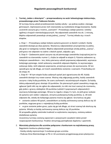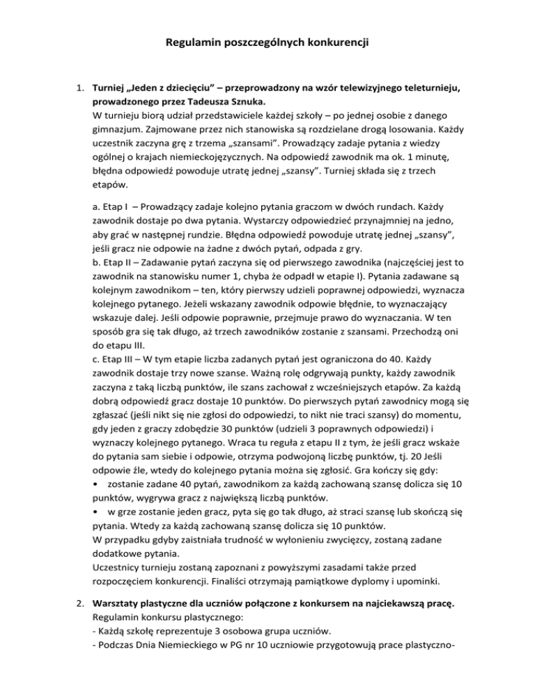 Regulamin poszczególnych konkurencji 1. Turniej „Jeden z dziecięciu” – przeprowadzony na wzór telewizyjnego teleturnieju, prowadzonego przez Tadeusza Sznuka. W turnieju biorą udział przedstawiciele każdej szkoły – po jednej osobie z danego gimnazjum. Zajmowane przez nich stanowiska są rozdzielane drogą losowania. Każdy uczestnik zaczyna grę z trzema „szansami”. Prowadzący zadaje pytania z wiedzy ogólnej o krajach niemieckojęzycznych. Na odpowiedź zawodnik ma ok. 1 minutę, błędna odpowiedź powoduje utratę jednej „szansy”. Turniej składa się z trzech etapów. a. Etap I – Prowadzący zadaje kolejno pytania graczom w dwóch rundach. Każdy zawodnik dostaje po dwa pytania. Wystarczy odpowiedzieć przynajmniej na jedno, aby grać w następnej rundzie. Błędna odpowiedź powoduje utratę jednej „szansy”, jeśli gracz nie odpowie na żadne z dwóch pytań, odpada z gry. b. Etap II – Zadawanie pytań zaczyna się od pierwszego zawodnika (najczęściej jest to zawodnik na stanowisku numer 1, chyba że odpadł w etapie I). Pytania zadawane są kolejnym zawodnikom – ten, który pierwszy udzieli poprawnej odpowiedzi, wyznacza kolejnego pytanego. Jeżeli wskazany zawodnik odpowie błędnie, to wyznaczający wskazuje dalej. Jeśli odpowie poprawnie, przejmuje prawo do wyznaczania. W ten sposób gra się tak długo, aż trzech zawodników zostanie z szansami. Przechodzą oni do etapu III. c. Etap III – W tym etapie liczba zadanych pytań jest ograniczona do 40. Każdy zawodnik dostaje trzy nowe szanse. Ważną rolę odgrywają punkty, każdy zawodnik zaczyna z taką liczbą punktów, ile szans zachował z wcześniejszych etapów. Za każdą dobrą odpowiedź gracz dostaje 10 punktów. Do pierwszych pytań zawodnicy mogą się zgłaszać (jeśli nikt się nie zgłosi do odpowiedzi, to nikt nie traci szansy) do momentu, gdy jeden z graczy zdobędzie 30 punktów (udzieli 3 poprawnych odpowiedzi) i wyznaczy kolejnego pytanego. Wraca tu reguła z etapu II z tym, że jeśli gracz wskaże do pytania sam siebie i odpowie, otrzyma podwojoną liczbę punktów, tj. 20 Jeśli odpowie źle, wtedy do kolejnego pytania można się zgłosić. Gra kończy się gdy: • zostanie zadane 40 pytań, zawodnikom za każdą zachowaną szansę dolicza się 10 punktów, wygrywa gracz z największą liczbą punktów. • w grze zostanie jeden gracz, pyta się go tak długo, aż straci szansę lub skończą się pytania. Wtedy za każdą zachowaną szansę dolicza się 10 punktów. W przypadku gdyby zaistniała trudność w wyłonieniu zwycięzcy, zostaną zadane dodatkowe pytania. Uczestnicy turnieju zostaną zapoznani z powyższymi zasadami także przed rozpoczęciem konkurencji. Finaliści otrzymają pamiątkowe dyplomy i upominki. 2. Warsztaty plastyczne dla uczniów połączone z konkursem na najciekawszą pracę. Regulamin konkursu plastycznego: - Każdą szkołę reprezentuje 3 osobowa grupa uczniów. - Podczas Dnia Niemieckiego w PG nr 10 uczniowie przygotowują prace plastyczno- techniczne na wyznaczonym stanowisku pracy. Uczniowie mają za zadanie przygotować pracę plastyczną na temat pozytywnych skojarzeń uczniów z dowolnym krajem/krajami niemieckojęzycznymi. Prace mogą być wykonane dowolną techniką. - Organizatorzy zapewniają czas (ok. 60 min.) na przygotowanie prac. PG 10 udostępnia ławki i krzesła. Pozostałe potrzebne materiały plastycznotechniczne, elementy prac itp. uczestnicy przywożą ze sobą. - Możliwe jest częściowe przygotowanie prac/ elementów prac w domu. - Uczestnicy i nauczyciele ze szkół będą równocześnie sędziami. - Przy każdym stoisku będzie stała puszka na głosy. - Każda szkoła dostanie karty do głosowania. Uczestnicy mogą głosował wyłącznie na prace swoich konkurentów, następnie wrzucać karty do puszek przy stanowiskach, które ich zdaniem wypadły najlepiej. - Nie wolno wrzucać kart do swojego stanowiska. Takie głosy będą nieważne. - Wygra drużyna, która zdobędzie najwięcej głosów. Wszystkie wykonane prace plastyczne zostają na terenie PG nr 10 w Radomiu. Rozstrzygnięcie poszczególnych konkurencji nastąpi w dniu imprezy. Każdy konkurs jest oceniany i nagradzany osobno. Organizatorzy Dnia Kultury przewidują nagrody, dyplomy, certyfikaty i wiele niezapomnianych wrażeń zarówno dla uczniów, jak i ich opiekunów. Szkoła zgłasza swój udział w imprezie na załączonym formularzu zgłoszeniowym, najpóźniej do dnia 23.11.2015 r. na adres szkoły lub fax: PG nr 10 w Radomiu, ul. Długojowska 6, 26-600 Radom Nr fax: 48 - 36 510 13