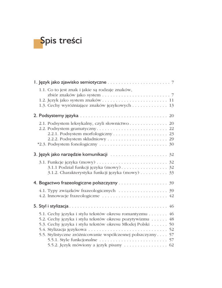 Spis treści 1. Język jako zjawisko semiotyczne . . . . . . . . . . . . . . . . . . . . . . . 7 1.1. Co to jest znak i jakie są rodzaje znaków, zbiór znaków jako system . . . . . . . . . . . . . . . . . . . . . . . . . 7 1.2. Język jako system znaków . . . . . . . . . . . . . . . . . . . . . . . . 11 1.3. Cechy wyróżniające znaków językowych . . . . . . . . . . . . . 13 2. Podsystemy języka . . . . . . . . . . . . . . . . . . . . . . . . . . . . . . . . 20 2.1. Podsystem leksykalny, czyli słownictwo . 2.2. Podsystem gramatyczny . . . . . . . . . . . . . 2.2.1. Podsystem morfologiczny . . . . . . . 2.2.2. Podsystem składniowy . . . . . . . . . *2.3. Podsystem fonologiczny . . . . . . . . . . . . . . . . . . . . . . . . . . . . . . . . . . . . . . . . . . . . . . . . . . . . . . . . . . . . . . . . . . . . . . . . . . . . . 20 22 23 29 30 3. Język jako narzędzie komunikacji . . . . . . . . . . . . . . . . . . . . . 32 3.1. Funkcje języka (mowy) . . . . . . . . . . . . . . . . . . . . . . . . . . 32 3.1.1 Podział funkcji języka (mowy) . . . . . . . . . . . . . . . . . 32 3.1.2. Charakterystyka funkcji języka (mowy) . . . . . . . . . . 33 4. Bogactwo frazeologiczne polszczyzny . . . . . . . . . . . . . . . . . . 39 4.1. Typy związków frazeologicznych . . . . . . . . . . . . . . . . . . 39 4.2. Innowacje frazeologiczne . . . . . . . . . . . . . . . . . . . . . . . . 42 5. Styl i stylizacja . . . . . . . . . . . . . . . . . . . . . . . . . . . . . . . . . . . . 46 5.1. 5.2. 5.3. 5.4. 5.5. Cechy języka i stylu tekstów okresu romantyzmu . . . . Cechy języka i stylu tekstów okresu pozytywizmu . . . Cechy języka i stylu tekstów okresu Młodej Polski . . . Stylizacja językowa . . . . . . . . . . . . . . . . . . . . . . . . . . Stylistyczne zróżnicowanie współczesnej polszczyzny . 5.5.1. Style funkcjonalne . . . . . . . . . . . . . . . . . . . . . . 5.5.2. Język mówiony a język pisany . . . . . . . . . . . . . . . . . . . . . . . . . . . . . . . . . . 46 48 50 52 57 57 62 6. Polszczyzna na tle innych języków . . . . . . . . . . . . . . . . . . . . . 65 6.1. Elementy typologii języków . . . . . . . . . . . . . . . . . . . . . . . 67 6.2. Problemy przekładu . . . . . . . . . . . . . . . . . . . . . . . . . . . . 69 7. Kultura języka – odmiana nazwisk . . . . . . . . . . . . . . . . . . . . . 73 Wykaz słowników, encyklopedii i innych pomocy naukowych . . . . . . . . . . . . . . . . . . . . . . . . . . . 76 Indeks terminów . . . . . . . . . . . . . . . . . . . . . . . . . . . . . . . . . . . 77