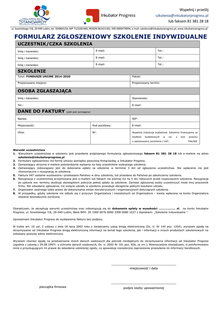 Wypełnij i prześlij [email protected] lub faksem 81 381 28 18 ul. Sowińskiego 7/6, 20-040 Lublin, tel. 504864154, NIP 7123281460, REGON 061611101, KRS 0000479094, e-mail: [email protected], www.inkubatorprogress.pl FORMULARZ ZGŁOSZENIOWY SZKOLENIE INDYWIDUALNE UCZESTNIK/CZKA SZKOLENIA Imię i nazwisko: E-mail: Tel.: Imię i nazwisko: E-mail: Tel.: Imię i nazwisko: E-mail: Tel.: SZKOLENIE Tytuł: FUNDUSZE UNIJNE 2014-2020 Pakiet: Proponowane miejsce: Proponowany termin: OSOBA ZGŁASZAJĄCA Imię i nazwisko: Stanowisko: Tel.: E-mail: DANE DO FAKTURY (jeśli jest wymagana) Nazwa: NIP: Miejscowość: Kod pocztowy: E-mail: Ulica: Nr: Wypełnia instytucja budżetowa. Szkolenie finansujemy ze środków budżetowych w zw. z o zastosowanie zwolnienia z VAT. tym prosimy TAK/NIE Warunki uczestnictwa 1. Warunkiem uczestnictwa w szkoleniu jest przesłanie podpisanego formularza zgłoszeniowego faksem 81 381 28 18 lub e-mailem na adres [email protected] 2. Formularz zgłoszeniowy ma formę umowy pomiędzy powyższą firmą/osobą, a Inkubator Progress. 3. Zamawiający otrzyma e-mailem potwierdzenie wpisania na listę uczestników wybranego szkolenia. 4. Zamawiający zobowiązany jest do dokonania opłaty za szkolenie w terminie 3 dni od zgłoszenia uczestnictwa. Nie wpłacenie nie jest równoznaczne z rezygnacją ze szkolenia. 5. Faktura VAT zostanie wystawiona i przekazana Państwu w dniu szkolenia, lub przesłana do Państwa po zakończeniu szkolenia. 6. Rezygnacja z uczestnictwa przyjmowana jest e-mailem lub faksem nie później niż na 5 dni roboczych przed rozpoczęciem szkolenia. Rezygnacja po upływie ww. terminu skutkuje obowiązkiem pokrycia pełnej opłaty za szkolenie. Zamiast zgłoszonej osoby uczestniczyć może inny pracownik firmy. Nie odwołanie zgłoszenia, nie wzięcie udziału w szkoleniu powoduje obciążenie pełnymi kosztami udziału. 7. Organizator zastrzega sobie prawo do dokonywania zmian merytorycznych i organizacyjnych dotyczących szkolenia. 8. W przypadku, gdyby szkolenie nie odbyło się z przyczyn Organizatora i niezależnych od Organizatora – kwota wpłacona na konto Organizatora zostanie bezzwłocznie zwrócona. Oświadczam, że akceptuję warunki uczestnictwa oraz zobowiązuję się do dokonania opłaty w wysokości .................. zł. na konto Inkubator Progress, ul. Sowińskiego 7/6, 20-040 Lublin, Bank BPH: 30 1060 0076 0000 3300 0080 1627 z dopiskiem: „Szkolenie indywidualne ”. Upoważniam Inkubator Progress do wystawienia faktury bez podpisu. W trybie art. 10 ust. 2 ustawy z dnia 18 lipca 2002 roku o świadczeniu usług drogą elektroniczną (Dz. U. Nr 144 poz. 1204), wyrażam zgodę na otrzymywanie od Inkubator Progress drogą elektroniczną informacji na temat tego szkolenia, jak i informacji o innych produktach szkoleniowych na wskazany powyżej adres elektroniczny. Wyrażam również zgodę na przetwarzanie moich danych osobowych dla potrzeb niezbędnych do otrzymywania informacji od Inkubator Progress (zgodnie z ustawą z 29.08.1997r. o ochronie danych osobowych, Dz. U. 2002 Nr 101 poz. 926, ze zm.). Równocześnie oświadczam, iż poinformowano mnie o przysługującym mi prawie do odwołania udzielonej zgody, co spowoduje niezwłoczne zaprzestanie przesyłania mi informacji handlowych. ……………………………………………… miejscowość i data pieczątka firmowa ……………………………………………… podpis osoby upoważnionej