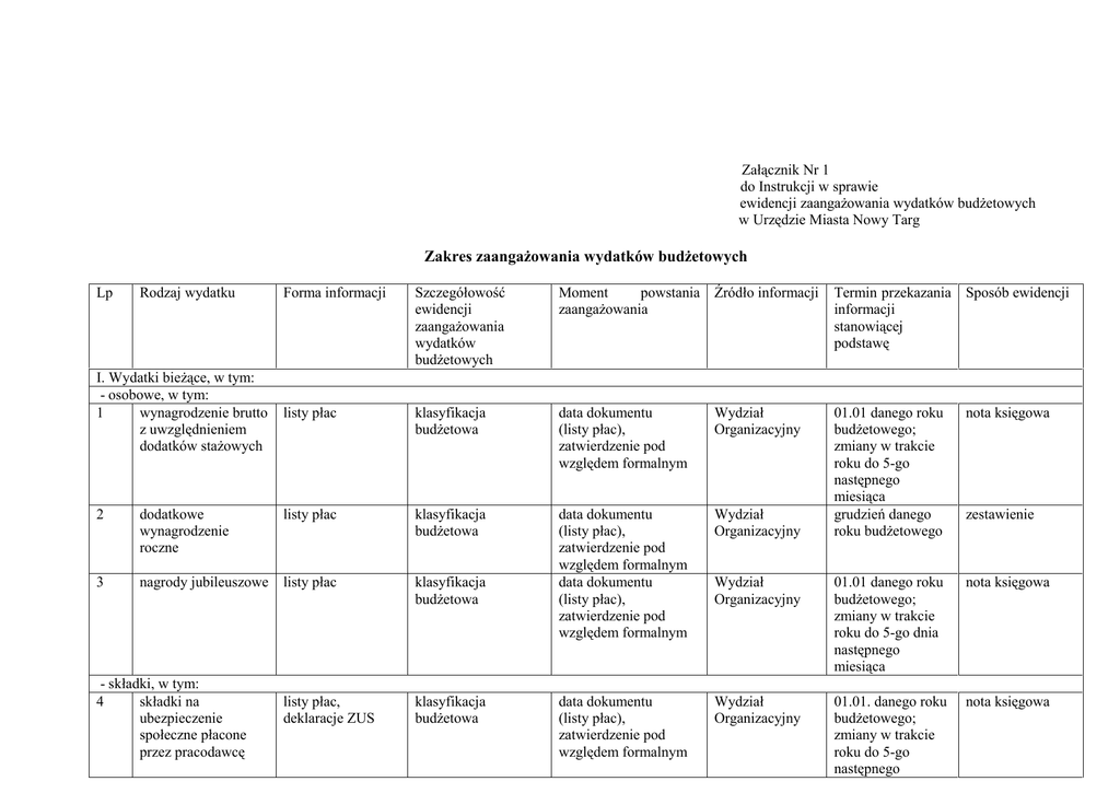 Załącznik Nr 1 do Instrukcji w sprawie ewidencji zaangażowania wydatków budżetowych w Urzędzie Miasta Nowy Targ Zakres zaangażowania wydatków budżetowych Lp Rodzaj wydatku Forma informacji Moment powstania Źródło informacji zaangażowania Termin przekazania Sposób ewidencji informacji stanowiącej podstawę I. Wydatki bieżące, w tym: - osobowe, w tym: 1 wynagrodzenie brutto z uwzględnieniem dodatków stażowych Szczegółowość ewidencji zaangażowania wydatków budżetowych listy płac klasyfikacja budżetowa data dokumentu (listy płac), zatwierdzenie pod względem formalnym Wydział Organizacyjny nota księgowa 2 dodatkowe wynagrodzenie roczne listy płac klasyfikacja budżetowa Wydział Organizacyjny 3 nagrody jubileuszowe listy płac klasyfikacja budżetowa data dokumentu (listy płac), zatwierdzenie pod względem formalnym data dokumentu (listy płac), zatwierdzenie pod względem formalnym 01.01 danego roku budżetowego; zmiany w trakcie roku do 5-go następnego miesiąca grudzień danego roku budżetowego Wydział Organizacyjny 01.01 danego roku budżetowego; zmiany w trakcie roku do 5-go dnia następnego miesiąca nota księgowa listy płac, deklaracje ZUS klasyfikacja budżetowa data dokumentu (listy płac), zatwierdzenie pod względem formalnym Wydział Organizacyjny 01.01. danego roku budżetowego; zmiany w trakcie roku do 5-go następnego nota księgowa - składki, w tym: 4 składki na ubezpieczenie społeczne płacone przez pracodawcę zestawienie miesiąca 01.01. danego roku budżetowego; zmiany w trakcie roku do 5-go następnego miesiąca maj, wrzesień i grudzień (korekta odpisu) danego roku budżetowego 5 składki na fundusz pracy płacone przez pracodawcę listy płac, deklaracje ZUS klasyfikacja budżetowa data dokumentu (listy płac), zatwierdzenie pod względem formalnym Wydział Organizacyjny 6 odpisy na ZFŚS dokument zawierający wyliczenie wysokości odpisu na ZFŚS zgodnie z obowiązującymi przepisami ustawy o ZFŚS oraz dokument korygujący to wyliczenie na koniec roku klasyfikacja budżetowa data dokumentu, zatwierdzenie pod względem formalnym Wydział Organizacyjny umowy zlecenia lub umowy o dzieło i aneksy do umów klasyfikacja budżetowa Wydział merytoryczny do 5-go następnego miesiąca umowa zbiorczy wykaz naliczeń stwierdzający dokonanie zapłaty składek – rozksięgowanie na wydziały, zadania, listy płac zbiorczy wykaz naliczeń stwierdzający dokonanie zapłaty klasyfikacja budżetowa data zawarcia umowy, dla umów zawartych na czas nieokreślony – 1.01 danego roku budżetowego data dokumentu (listy płac), zatwierdzenie pod względem formalnym Wydział merytoryczny do 5-go następnego miesiąca zestawienie data dokumentu (listy płac), zatwierdzenie pod względem formalnym Wydział merytoryczny do 5-go następnego miesiąca nota księgowa - bezosobowe, w tym: 7 wynagrodzenia 8 składki na ubezpieczenia społeczne płacone przez pracodawcę 9 składki na fundusz pracy płacone przez pracodawcę klasyfikacja budżetowa nota księgowa polecenie księgowania 10 11 zakup materiałów, środków trwałych i wyposażenia itp., w tym współfinansowane ze środków unijnych zakup usług, w tym współfinansowanie ze środków unijnych składek – rozksięgowanie na wydziały, zadania, listy płac umowy, aneksy do umów, zlecenia i inne dokumenty zaciągnięte zobowiązania bez formy pisemnej zamówienia (faktury, rachunki, noty księgowe, zaliczki i inne) zaciągnięte zobowiązania bez formy pisemnej zamówienia (faktury, rachunki, noty księgowe, zaliczki i inne) – dotyczące płatności ze środków unijnych umowy, aneksy do umów, zlecenia i inne dokumenty klasyfikacja budżetowa data zawarcia umowy lub wymienionych dokumentów dla umów wieloletnich – 01.01 danego roku budżetowego data dokumentu (np. faktury) zatwierdzenie pod względem formalnym Wydział merytoryczny 7 dni od daty sporządzenia, nie później niż do 5-go następnego miesiąca nota księgowa, umowy, umowy zlecenie, aneksy Wydział merytoryczny pod datą wpływu, nie później niż do 3-go następnego miesiąca jednoczesne zaangażowanie klasyfikacja budżetowa data dokumentu (np. faktury) zatwierdzenie pod względem formalnym Wydział merytoryczny pod datą wpływu, nie później niż do 3-go następnego miesiąca jednoczesne zaangażowanie klasyfikacja budżetowa data zawarcia umowy lub wymienionych dokumentów dla umów wieloletnich 01.01. danego roku data dokumentu (faktury) zatwierdzenie pod względem formalnym Wydział merytoryczny 7 dni od daty sporządzenia, nie później niż do 5-go następnego miesiąca pod datą wpływu, nie później niż do 3-go następnego miesiąca nota księgowa, umowy, umowy zlecenie, aneksy klasyfikacja budżetowa umowy, aneksy do klasyfikacja umów bez budżetowa określenia ich wartości – płatności dokonywane na Wydział merytoryczny jednoczesne zaangażowanie na podstawie otrzymanych faktur lub podstawie faktur (umowy o dostawy; wody, energii elektrycznej, cieplnej, telefonicznych, usług pocztowych i innych) 12 zaciągnięte zobowiązania bez formy pisemnej zlecania (faktury, rachunki, noty księgowe, zaliczki i inne) zaciągnięte zobowiązania bez formy pisemnej zlecania (faktury, rachunki, noty księgowe, zaliczki i inne) dotyczące płatności ze środków unijnych II. Wydatki majątkowe., w tym: 1 inwestycje - dotacje wniosek o uruchomienie środków budżetowych 2 inwestycje umowy, aneksy do umów, akty notarialne i inne dokumenty dotyczące zaangażowania środków roku bieżącego rachunków klasyfikacja budżetowa data dokumentu uprawomocnienia Wydział merytoryczny pod datą wpływu, nie później niż do 3-go następnego miesiąca jednoczesne zaangażowanie klasyfikacja budżetowa data dokumentu (faktury) zatwierdzenie pod względem formalnym Wydział merytoryczny pod datą wpływu, nie później niż do 3-go następnego miesiąca jednoczesne zaangażowanie klasyfikacja budżetowa data dokumentu (
