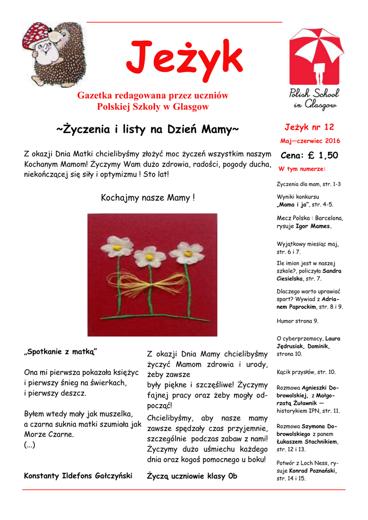 Jeżyk Gazetka redagowana przez uczniów Polskiej Szkoły w Glasgow ~Życzenia i listy na Dzień Mamy~ Jeżyk nr 12 Maj—czerwiec 2016 Z okazji Dnia Matki chcielibyśmy złożyć moc życzeń wszystkim naszym Kochanym Mamom! Życzymy Wam dużo zdrowia, radości, pogody ducha, niekończącej się siły i optymizmu ! Sto lat! Cena: £ 1,50 W tym numerze: Życzenia dla mam, str. 1-3 Kochajmy nasze Mamy ! Wyniki konkursu „Mama i ja”, str. 4-5. Mecz Polska : Barcelona, rysuje Igor Mames. Wyjątkowy miesiąc maj, str. 6 i 7. Ile imion jest w naszej szkole?, policzyła Sandra Ciesielska, str. 7. Dlaczego warto uprawiać sport? Wywiad z Adrianem Paprockim, str. 8 i 9. Humor strona 9. „Spotkanie z matką” Ona mi pierwsza pokazała księżyc i pierwszy śnieg na świerkach, i pierwszy deszcz. Z okazji Dnia Mamy chcielibyśmy życzyć Mamom zdrowia i urody, żeby zawsze były piękne i szczęśliwe! Życzymy fajnej pracy oraz żeby mogły odpocząć! Byłem wtedy mały jak muszelka, Chcielibyśmy, aby nasze mamy a czarna suknia matki szumiała jak zawsze spędzały czas przyjemnie, Morze Czarne. szczególnie podczas zabaw z nami! (...) Życzymy dużo uśmiechu każdego dnia oraz kogoś pomocnego u boku! Konstanty Ildefons Gałczyński Życzą uczniowie klasy 0b O cyberprzemocy, Laura Jędrusiak, Dominik, strona 10. Kącik przysłów, str. 10. Rozmowa Agnieszki Dobrowolskiej, z Małgorzatą Żuławnik — historykiem IPN, str. 11. Rozmowa Szymona Dobrowolskiego z panem Łukaszem Stachnikiem, str. 12 i 13. Potwór z Loch Ness, rysuje Konrad Poznański, str. 14 i 15. Życzenia dla mam Klasa Ib Życzę Tobie Mamo dobrego życia, a także dużo szczęścia i radości! Sophie Christie Wszystkiego najlepszego Królowo Domu! Abyś była zdrowa, Mamo! Vanessa Kowalewska Kocham Cię bardzo Mamo! Dużo szczęścia i radości! Vanessa Sterno Wszystkiego Najlepszego z okazji Dnia Mamy dla Ilony! Całusy dla Mamy, królowej domu! Oskar Zieliński Abyś zawsze była zdrowa, Mamo! Sophie Agur Królowo Domu! Życzę Ci szczęścia i radości! Siergiej Rybka Kocham Cię bardzo, Mamo! Ślę Ci całusy! Tomek Ciechomski Klasa III Życzę Ci dużo zdrowia, pomyślności i szczęścia z okazji Dnia Mamy! Grześ Kornaszewski Życzę Kochanej Mamusi sto lat, najlepszych dni i szczęścia. Kocham Cię! Lena Surma Życzenia dla mojej Mamy – życzę Ci mamo dużo zdrowia i żebyś się nie smuciła! Victoria Hinz Mamusie, kochamy Was ! Najfajniejsza, najpiękniejsza Mama idzie obok nas. Dużo dzieci bawi się z nią, dużo życzeń od ludzi dostaje! Kochamy Was, Mamy! Natalie Karolak Str. 2 Dla Mamy – dużo zdrowia, pomyślności, miłości, uśmiechu, radości i żeby się mama nie smuciła. Kocham Cię! Amelka Stala Zdrowia, szczęścia, miłości, radości. Jesteś najfajniejszą mamą, kocham Cię! Amelka Jędrusiak Wszystkiego najlepszego z okazji Dnia Mamy życzę Ci Mamo dużo szczęścia, miłości, radości i żebyś się nigdy nie smuciła! Maja Dębowska Wszystkiego najlepszego z okazji Dnia Mamy! Życzę Ci dużo zdrowia, miłości i pomyślności! Amelka Kądziołka Droga Mamo, życzę Ci dużo zdrowia, szczęścia, pomyślności i żebyś się nie smuciła! Andrea Lewkowicz Droga Mamo, życzę Ci wszystkiego najlepszego ! Rafał Lal Życzę Mamusi, żeby Mama się nie smuciła, życzę dużo szczęścia, miłości, zdrowia i żebyś spędziła dzień Twojego święta bardzo wesoło. Jesteś najfajniejsza na całym świecie. Kocham Cię Mamo! Julia Rychlik Wszystkiego najlepszego z okazji Dnia Mamy! Dużo szczęścia i zdrowia, żebyś się nigdy nie martwiła. Mam nadzieję, że będziesz miała najlepszy Dzień Mamy! Maja Ditner Kochana Mamusiu, jesteś bardzo kochana, życzę Ci zdrowia, szczęścia, pomyślności i dużo słoneczka ! Maja Radwanowska Sto lat Mamo! Żebyś była zdrowa, najlepsza i żebyś robiła najlepsze obiady ! Alicja Pyrz Kochana Mamo, życzę Ci miłości, szczęścia i radości ! Rafał Koczar Maj—czerwiec 2016 Życzenia dla mam Klasa Ia Życzenia dla mamy Klasa II życzy Kochanym Mamom dużo rado- Lena życzy swojej mamie, żeby miała mikser do kawy i żeby miała spokój. ści, szczęścia, zdrowia i dużo pieniążków! Iza życzy swojej mamie: żeby miała piękne kwiaty w salonie , żeby miała piękne kolczyki i biżuterię. Malinka życzy mamusi, żeby było zawsze czysto w salonie i w całym domu i żeby mamusia nie musiała ciągle gotować. Kochana Mamo, życzę Ci żebyś szczęśliwa była, w radości i szczęściu żyła. Niech o każdej porze i wszędzie uśmiech na Twojej twarzy będzie! Aleksandra Marzec, GCSE Wszystkiego Dnia Mamy! – najlepszego z okazji Dominik, GCSE Jacob życzy mamie, żeby mogła dużo odpoczyZ okazji Twego święta Mamo, życzę Ci zdrować. wia, sił i codziennej radości wraz ze słowami Szymon życzy swojej mamie podróży na Wy- największej wdzięczności. Za wszystkie Twospy Bahama. je trudy i starania, składam Ci dzisiaj podzięWanda życzy mamusi, żeby była szczęśliwa kowania! – Twoja ukochana córeczka, oraz miała ciszę i spokój. Zosia, A-level Staś życzy swojej mamie miłości, zdrowia i wielu podróży do Polski. Droga Mamo, dużo szczęścia i radości w Twoim dniu! Niech Ci przyjdzie dużo pieniędzy oraz snu! Z okazji Twego dnia chciałbym Ci życzyć najlepszego dnia w całym życiu !!! Jakub Trybek, GCSE „Mama i ja” – Julia Pyrcz, klasa IV Mam na imię Julia, to już pewnie wiecie. Mam mamę Justynę, najlepszą na świecie. Tak nam dni płyną, szybciutko jak rzeka, I wiecie? Kocham moją mamę najbardziej na świecie ! Często w kuchni coś razem pieczemy. Ciasta, ciasteczka i różne kremy, a przy tym dużo dyskutujemy. Bywa też czasem dzień muzyczny, głośny, wesoły i zarazem komiczny. Gitara, perkusja, a nawet klawisze, co tylko do głowy nam wpadnie, chętnie zapiszę. Maj—czerwiec 2016 Str. 3 Mama i ja Wyniki konkursu plastyczno-literackiego z okazji Dnia Mamy! Pierwsze miejsce w ka